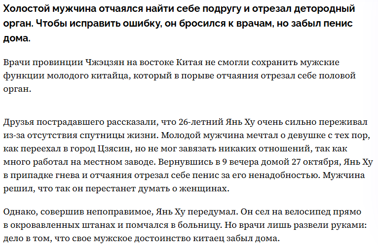 Подросток отрезал себе член, потому что он ему надоел. 14-летний парень из Воронежа насмотрелся странных роликов в интернете, следовал по некой «инструкции», но кровь начала хлестать так сильно, что он потерял сознание у себя в комнате. Его вовремя обнаружила сестра и вызвала скорую.