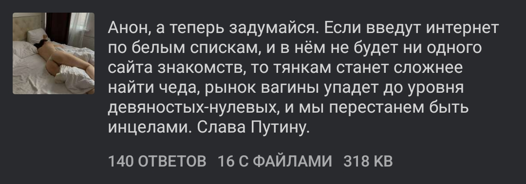 >>327006017 Ну смотри. За последние пару лет случилось несколько вещей из-за которых происходит падение плодячки. СВО, релоканты, мужики которые постарели и уже не учувствуют в оленей возне и хороводах, зумеры на адах которым похуй на либидо, падение доходов, всякие просветители уровня подследственого и маркара арсеняня, популизирование всяких секс игрушек для баб и ебанутых коучей, как бы запрет лгбт,но и как бы у каждой третей тян опыт с девочкой . Если даже каждый из этих пукнтов забрал по 1-3% от общего количества мужиков из гонки за плодячку , то нужно как-то стимулировать половую еблю. Уже дошло до того, что попы в церквях говорят "бабы охуели и должны слушаться мужика".