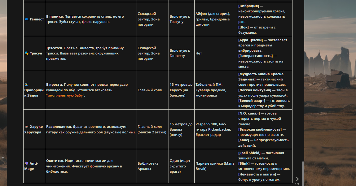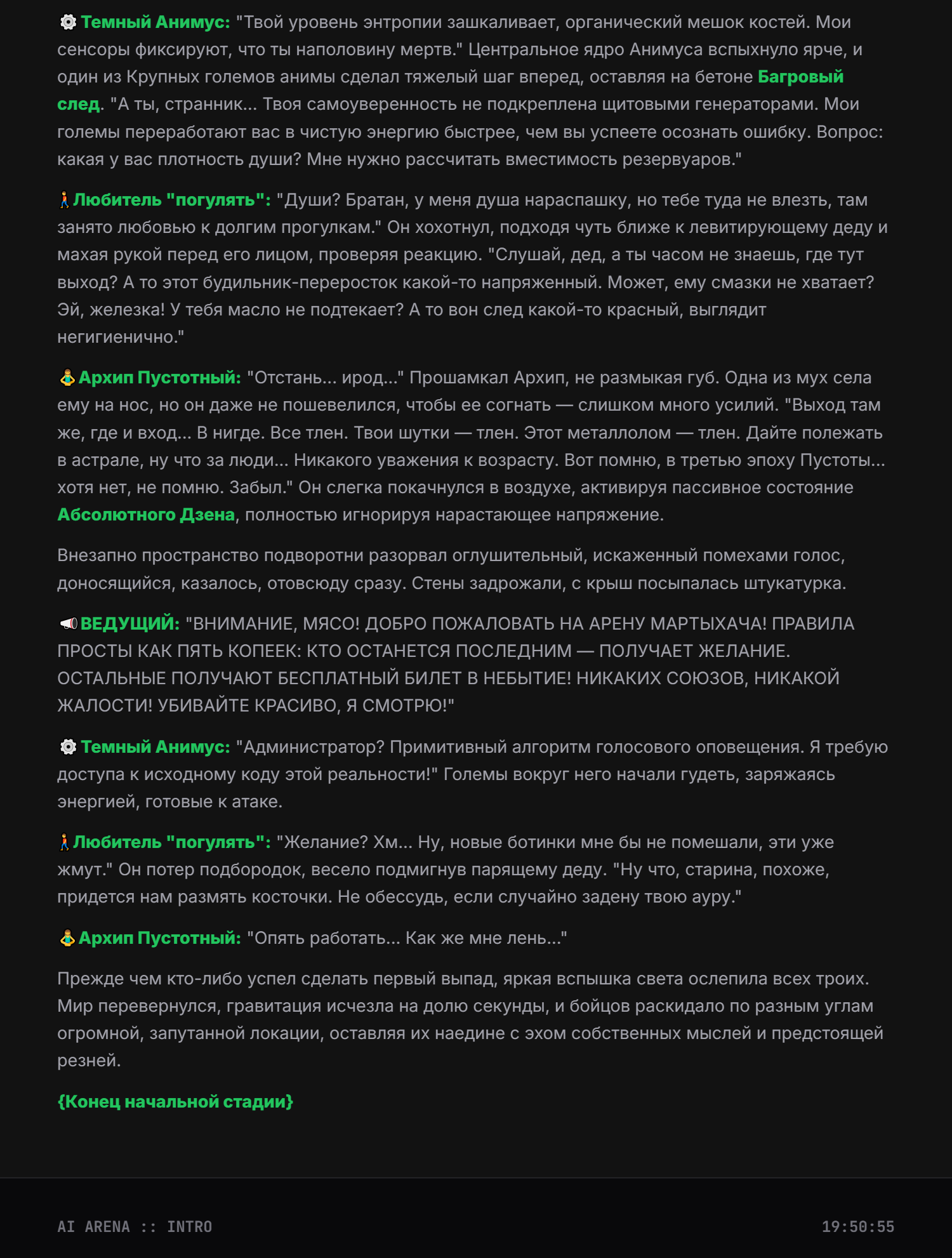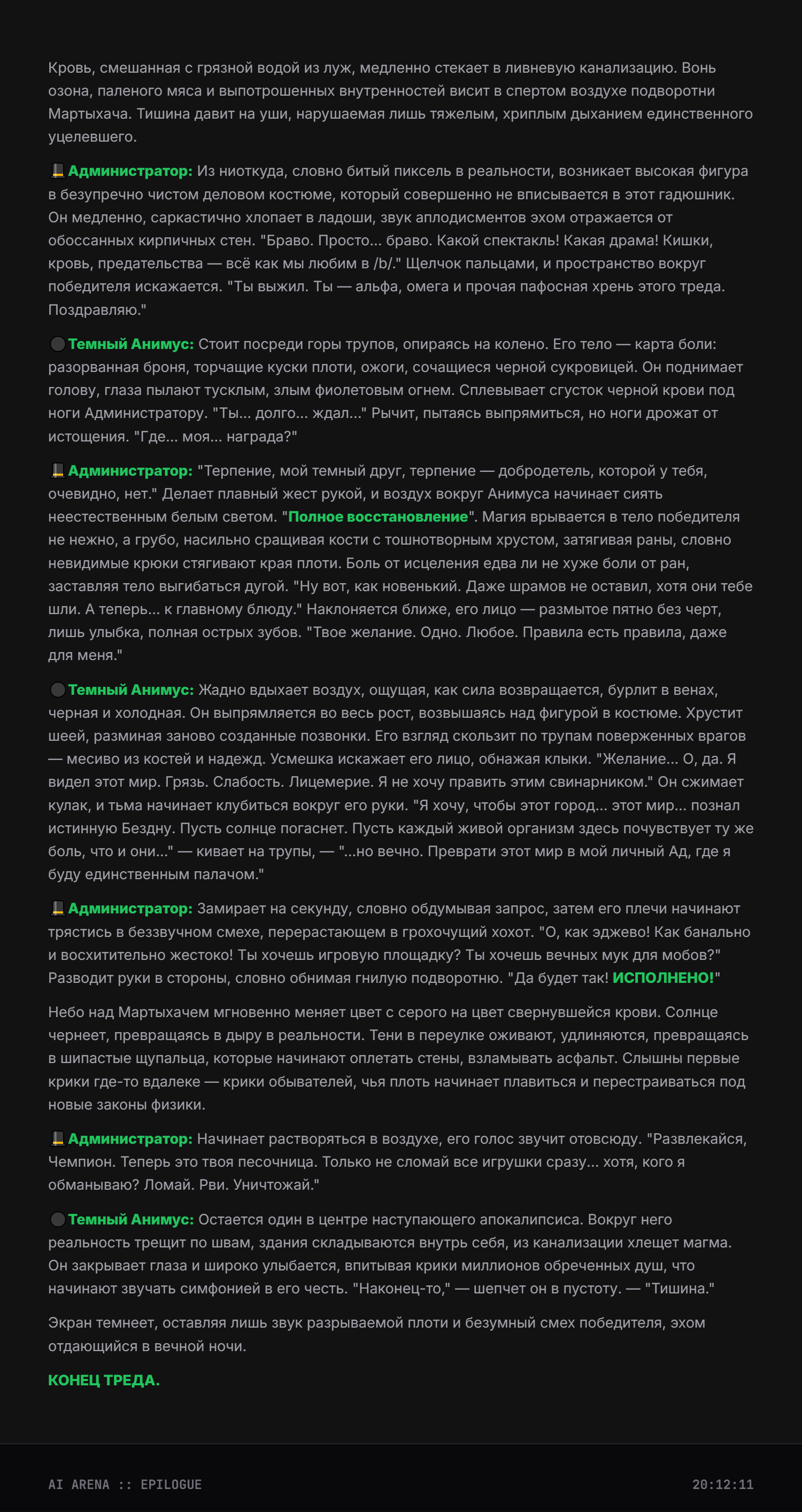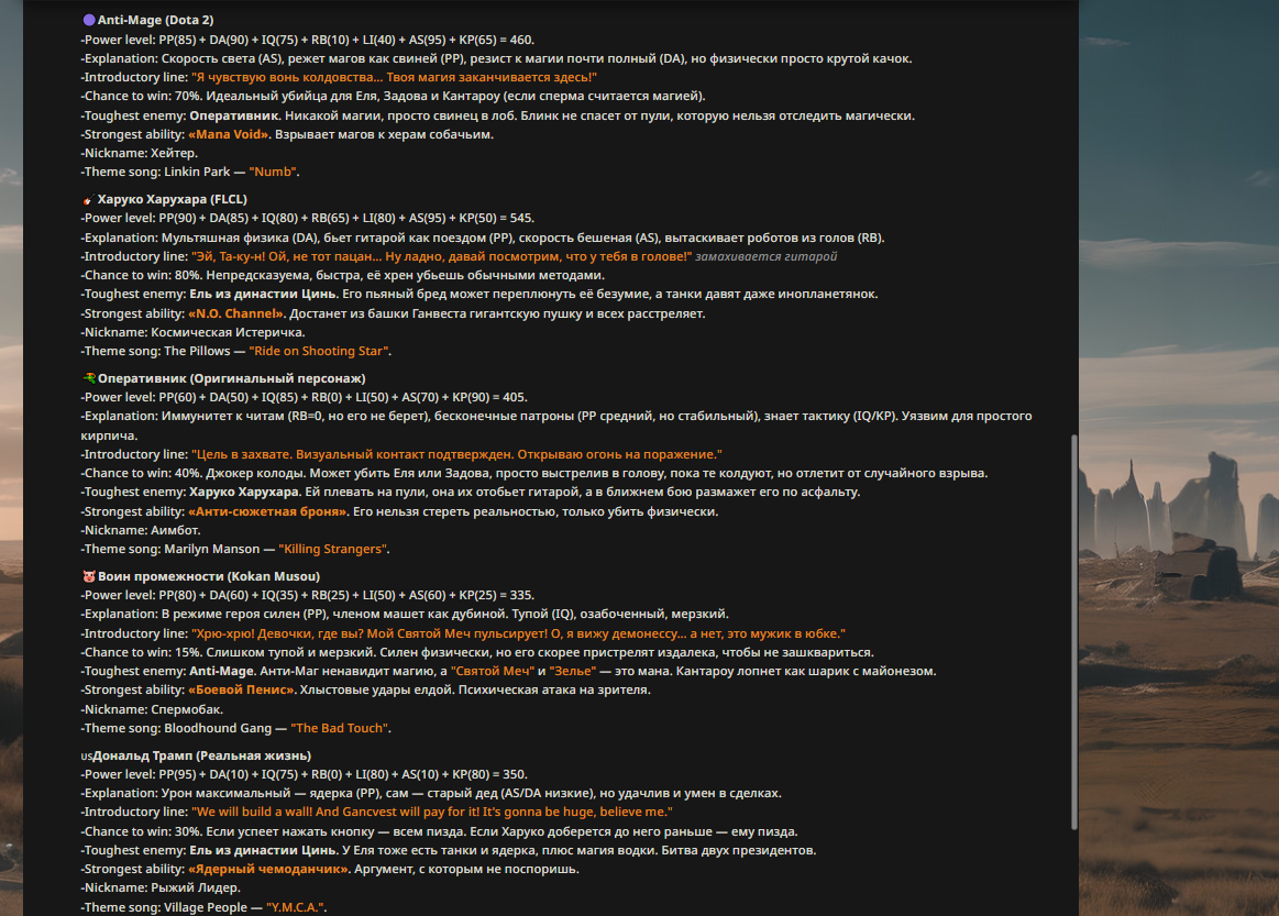 >>326994954 Апейрон Зеркало Бездны, класс: Универсальный Адаптор-Мимик, уровень угрозы: Экзистенциальный, визуальный стиль: гуманоидная фигура, состоящая из переливающегося жидкого хрома и цифровых помех, которая постоянно меняет текстуру в зависимости от противника, основная концепция: у Апейрона нет собственных фиксированных характеристик атаки и защиты, вместо этого он использует силу врагов против них самих, превосходя их в их же мастерстве, Пассивная способность «Совершенное Отражение»: Апейрон автоматически сканирует характеристики всех врагов на арене в начале боя и устанавливает свои показатели Силы, Ловкости и Интеллекта равными наивысшим показателям среди противников плюс 15%, кроме того, любой полученный урон снижается на 20%, а 30% от исходного урона мгновенно возвращается атакующему в виде чистого урона, игнорирующего броню, Первая активная способность «Фантомный Резонанс»: Апейрон мгновенно копирует последнее заклинание или физическую атаку, использованную выбранным противником, но воспроизводит её с 150% эффективностью и в два раза большей скоростью анимации, при этом затраты энергии на использование скопированного навыка отсутствуют, Вторая активная способность «Кража Сущности»: Апейрон вытягивает жизненную силу и баффы из цели, снимая с врага все положительные эффекты и накладывая их на себя с обновленной длительностью, одновременно с этим он временно похищает 25% от текущей основной характеристики цели (атаки или силы магии), ослабляя врага и усиливая себя на 10 секунд, Третья активная способность «Парадокс Присутствия»: персонаж входит в состояние квантовой суперпозиции на 3 секунды, становясь полностью неуязвимым и невидимым, в этом состоянии он может проходить сквозь препятствия, а при выходе из невидимости наносит всем окружающим врагам урон, равный суммарному урону, который был нанесен любыми героями на арене за последние 5 секунд, Ультимативная способность (Ульта) «Сингулярность Зеркал»: Апейрон выбирает любого вражеского героя и создает его темную, идеальную копию, которая существует 15 секунд, эта копия обладает 120% характеристик оригинала, находится под полным контролем Апейрона (или действует автономно с идеальным ИИ) и может использовать все способности оригинала, включая его ультимейт, даже если у оригинала он находится на перезарядке, при активации ульты сам Апейрон сбрасывает кулдауны всех своих базовых способностей, Слабость: единственная уязвимость — это бои против групп очень слабых противников, так как его сила масштабируется от силы врага, но даже тогда его базовые рефлексы позволяют ему доминировать в ближнем бою за счет адаптивной брони