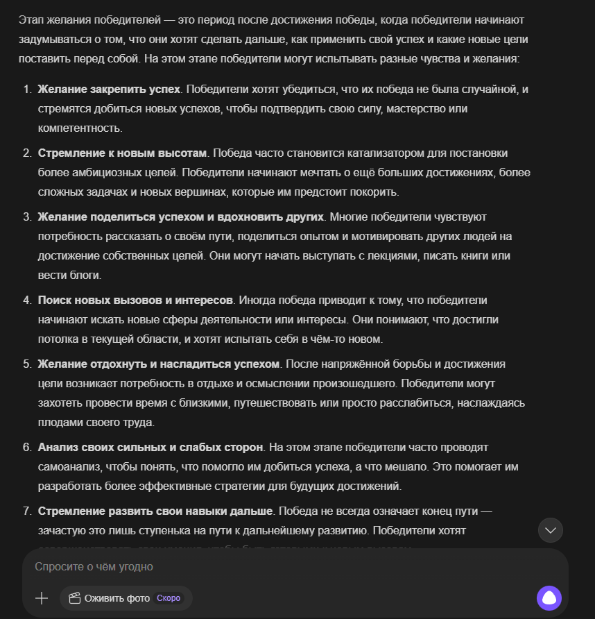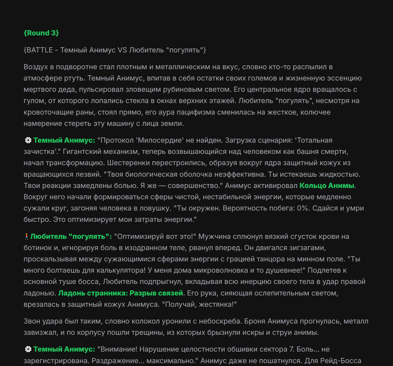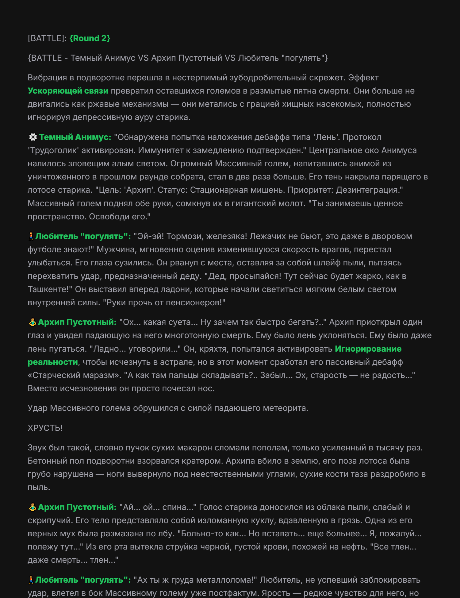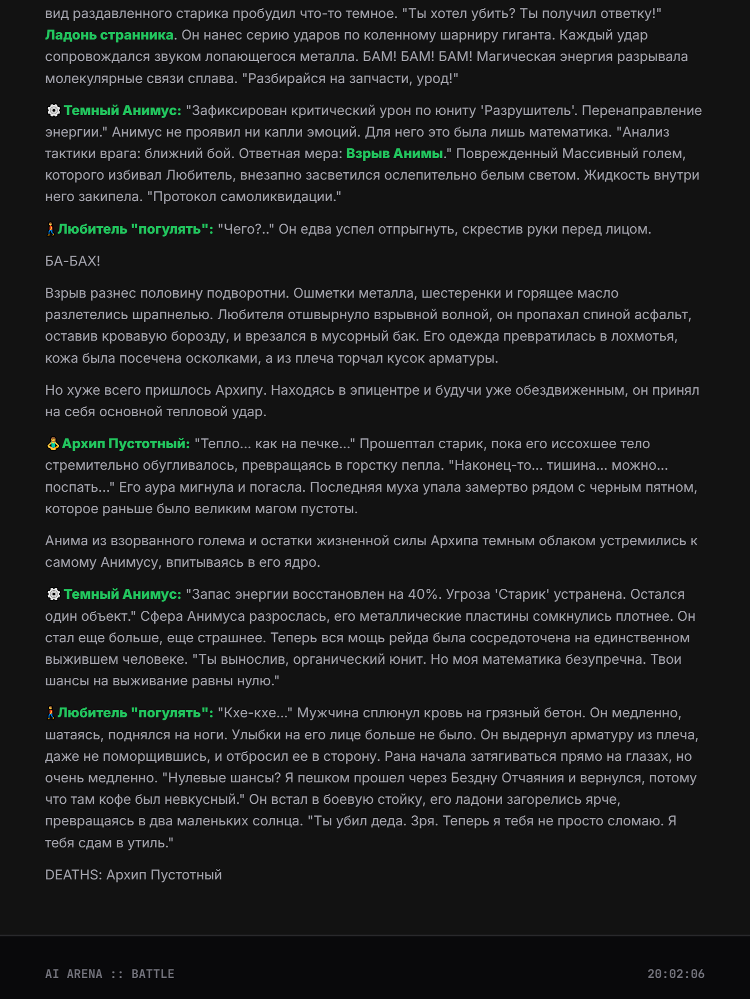 >>326994954 Апейрон Зеркало Бездны, класс: Универсальный Адаптор-Мимик, уровень угрозы: Экзистенциальный, визуальный стиль: гуманоидная фигура, состоящая из переливающегося жидкого хрома и цифровых помех, которая постоянно меняет текстуру в зависимости от противника, основная концепция: у Апейрона нет собственных фиксированных характеристик атаки и защиты, вместо этого он использует силу врагов против них самих, превосходя их в их же мастерстве, Пассивная способность «Совершенное Отражение»: Апейрон автоматически сканирует характеристики всех врагов на арене в начале боя и устанавливает свои показатели Силы, Ловкости и Интеллекта равными наивысшим показателям среди противников плюс 15%, кроме того, любой полученный урон снижается на 20%, а 30% от исходного урона мгновенно возвращается атакующему в виде чистого урона, игнорирующего броню, Первая активная способность «Фантомный Резонанс»: Апейрон мгновенно копирует последнее заклинание или физическую атаку, использованную выбранным противником, но воспроизводит её с 150% эффективностью и в два раза большей скоростью анимации, при этом затраты энергии на использование скопированного навыка отсутствуют, Вторая активная способность «Кража Сущности»: Апейрон вытягивает жизненную силу и баффы из цели, снимая с врага все положительные эффекты и накладывая их на себя с обновленной длительностью, одновременно с этим он временно похищает 25% от текущей основной характеристики цели (атаки или силы магии), ослабляя врага и усиливая себя на 10 секунд, Третья активная способность «Парадокс Присутствия»: персонаж входит в состояние квантовой суперпозиции на 3 секунды, становясь полностью неуязвимым и невидимым, в этом состоянии он может проходить сквозь препятствия, а при выходе из невидимости наносит всем окружающим врагам урон, равный суммарному урону, который был нанесен любыми героями на арене за последние 5 секунд, Ультимативная способность (Ульта) «Сингулярность Зеркал»: Апейрон выбирает любого вражеского героя и создает его темную, идеальную копию, которая существует 15 секунд, эта копия обладает 120% характеристик оригинала, находится под полным контролем Апейрона (или действует автономно с идеальным ИИ) и может использовать все способности оригинала, включая его ультимейт, даже если у оригинала он находится на перезарядке, при активации ульты сам Апейрон сбрасывает кулдауны всех своих базовых способностей, Слабость: единственная уязвимость — это бои против групп очень слабых противников, так как его сила масштабируется от силы врага, но даже тогда его базовые рефлексы позволяют ему доминировать в ближнем бою за счет адаптивной брони