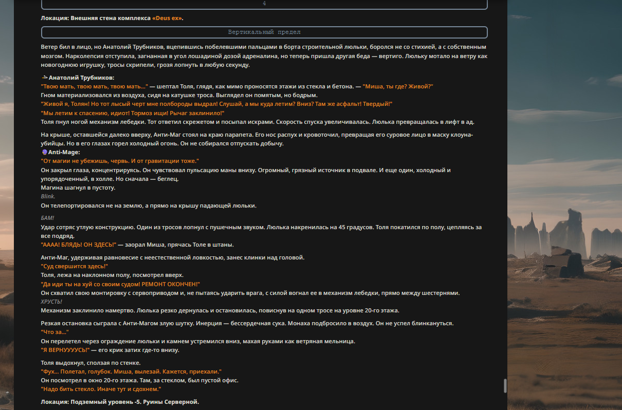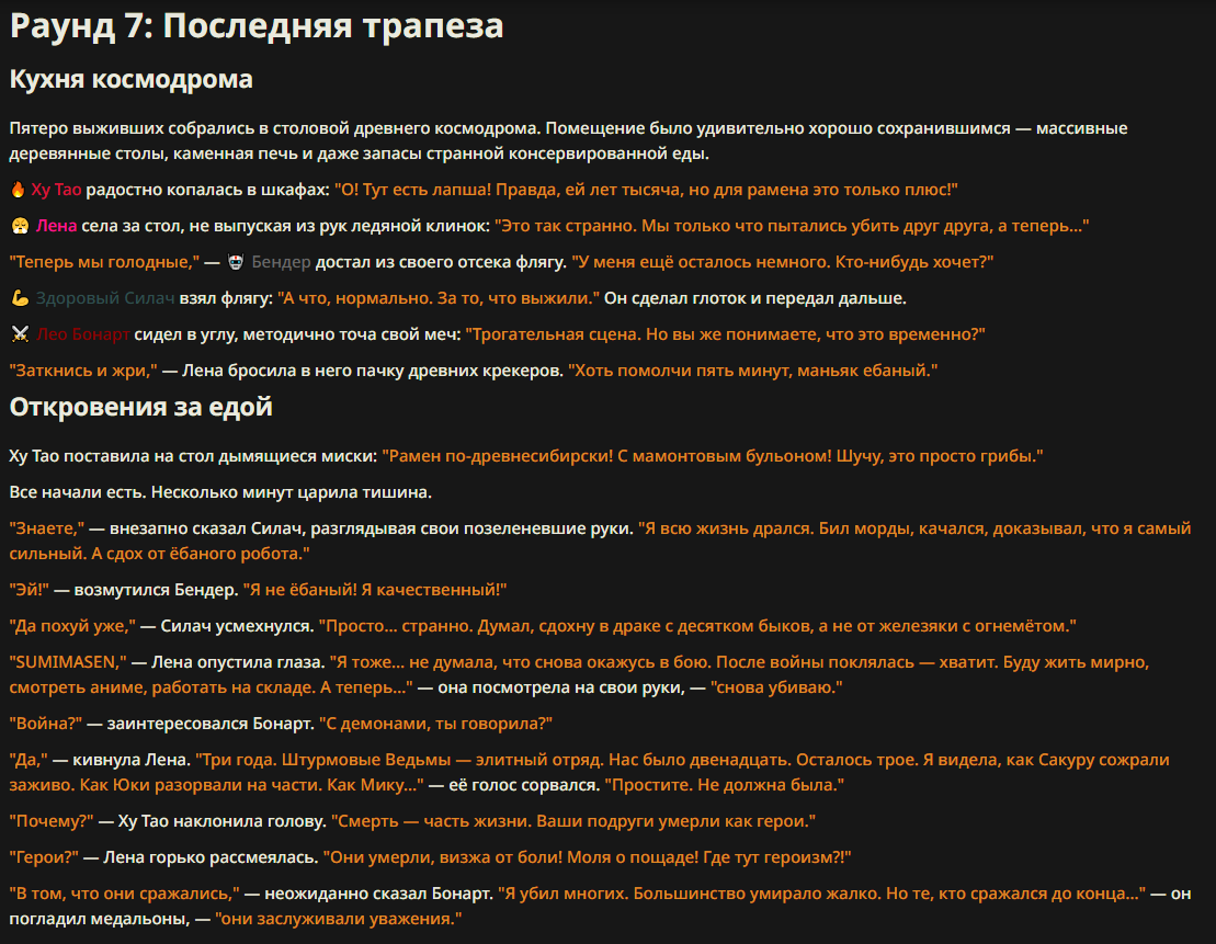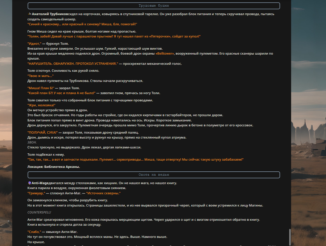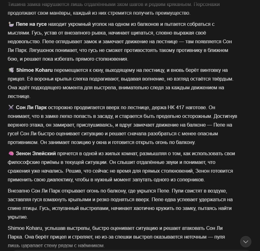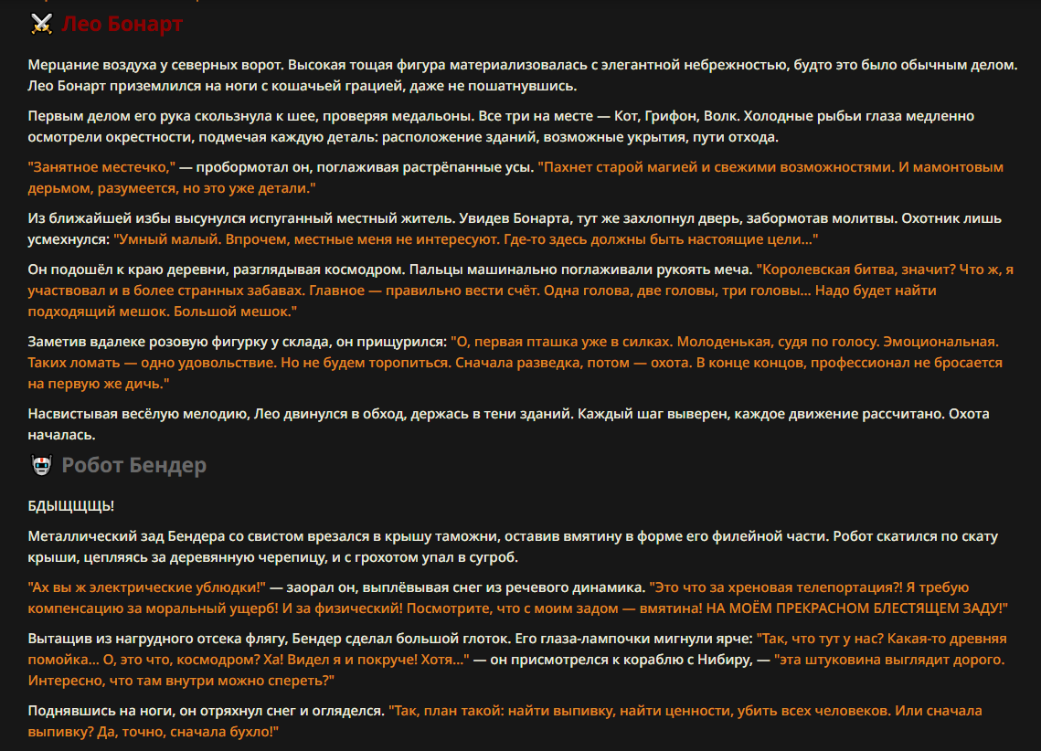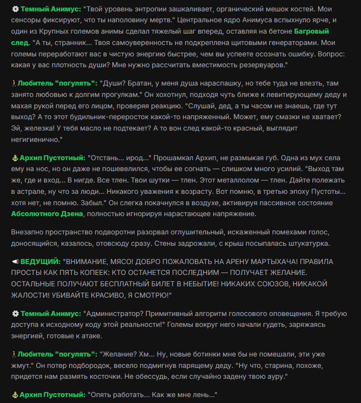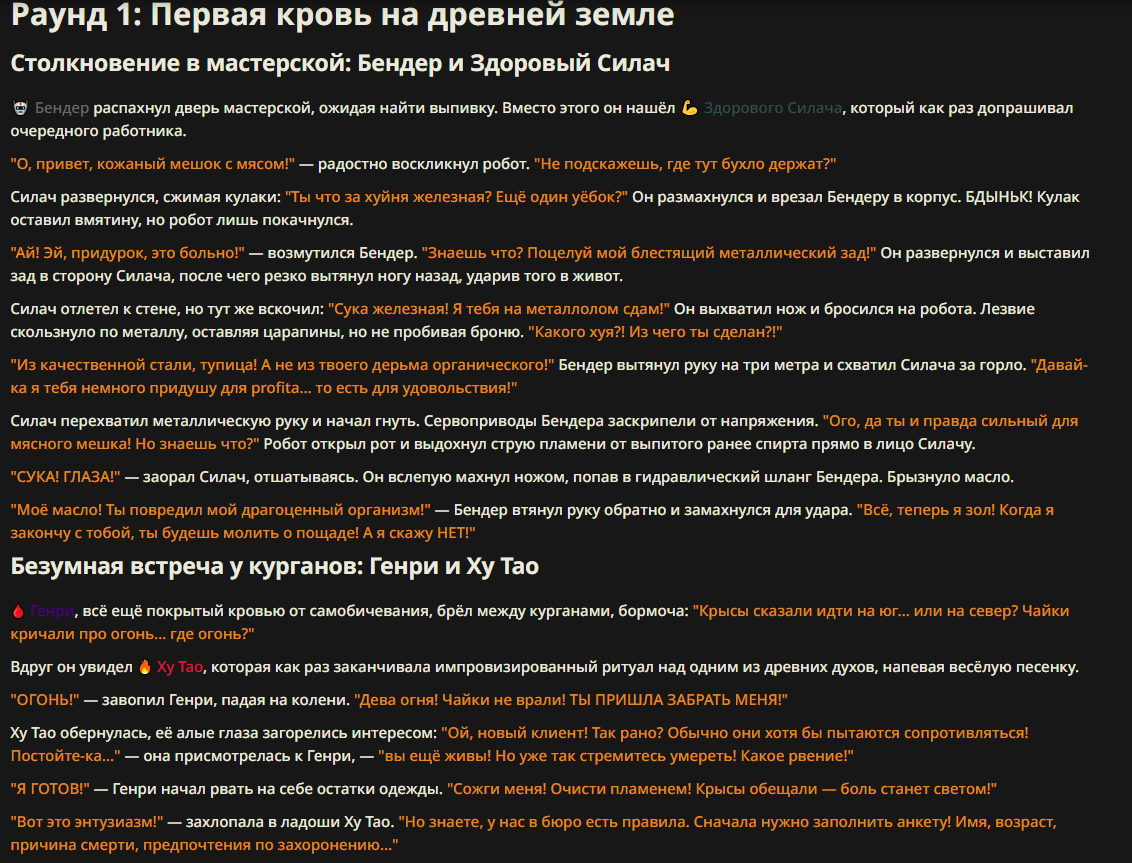>>327013352 Обычные игры можно мутить в llm без нахлобучек сверху. Скидываешь начальный промт+персов, потом пишешь промт "опиши след раунд" и промт "опиши финал"