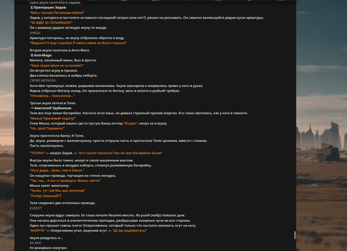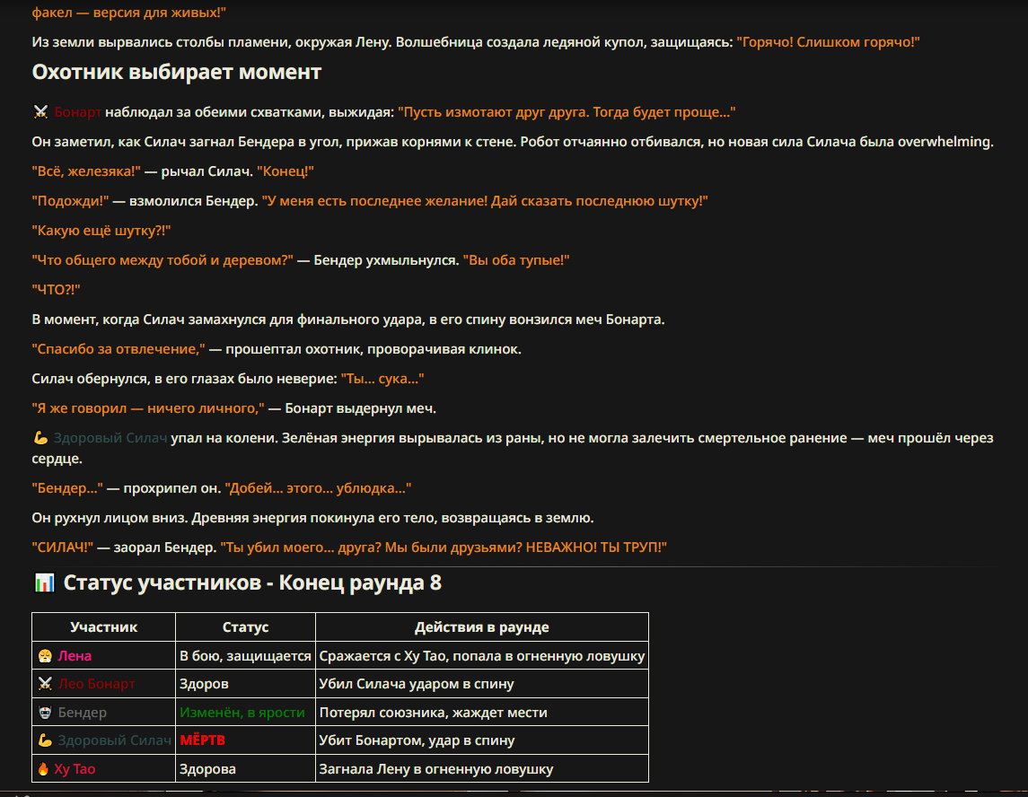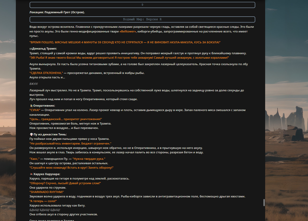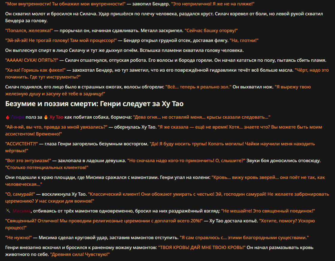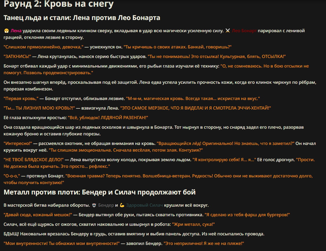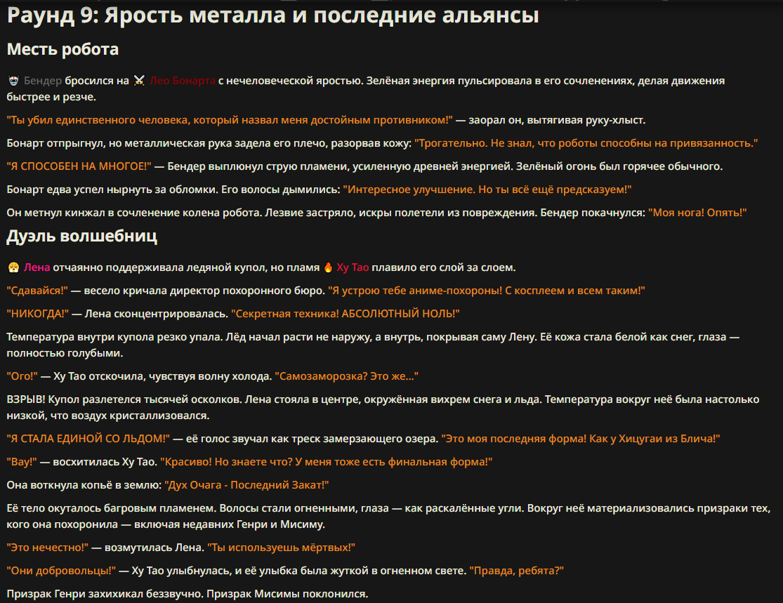 >>327013352 Обычные игры можно мутить в llm без нахлобучек сверху. Скидываешь начальный промт+персов, потом пишешь промт "опиши след раунд" и промт "опиши финал"