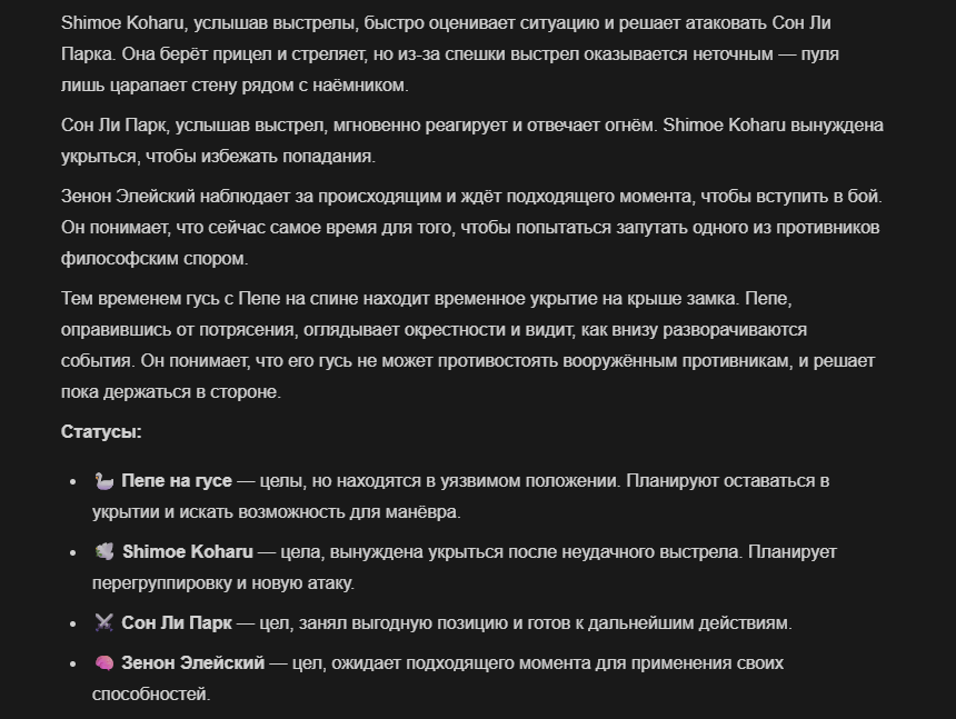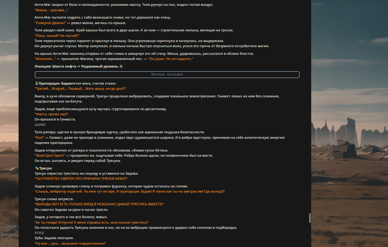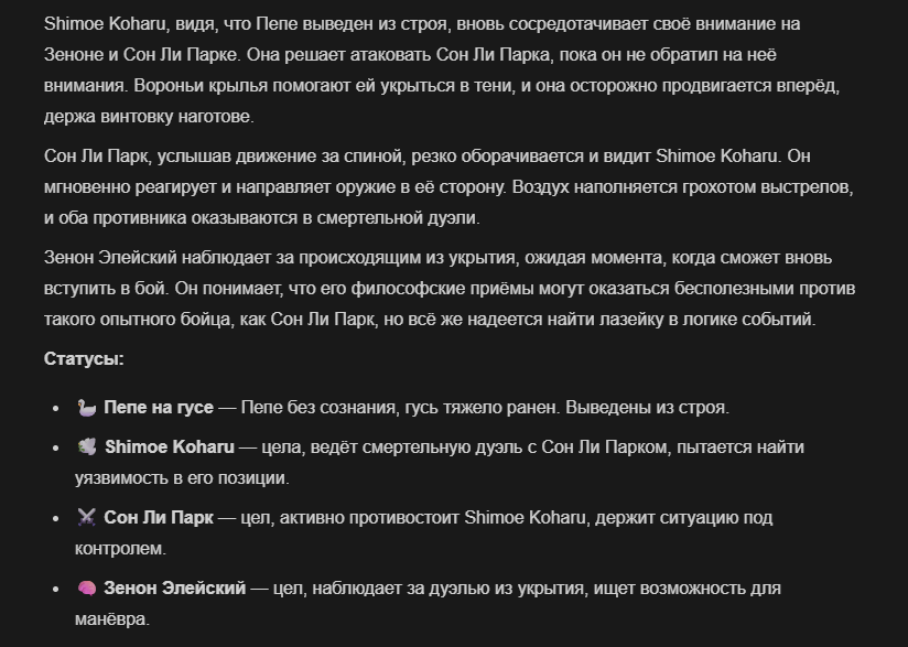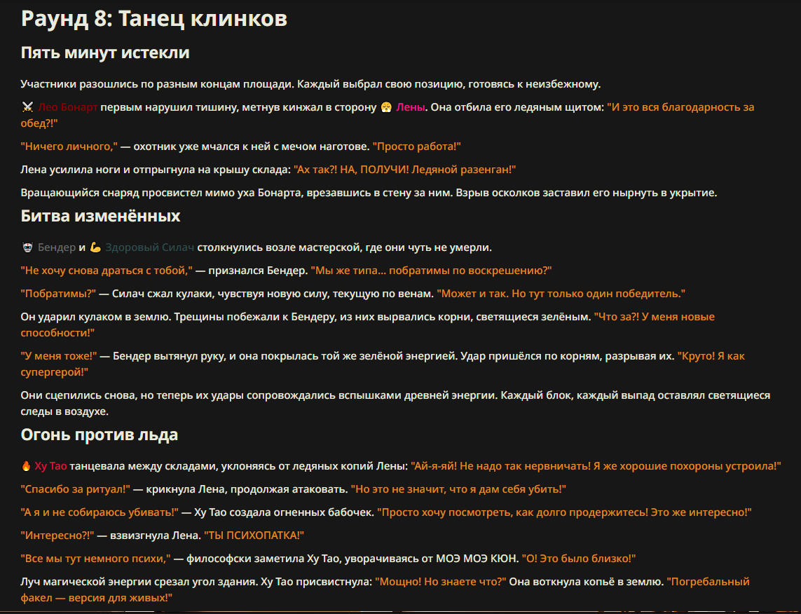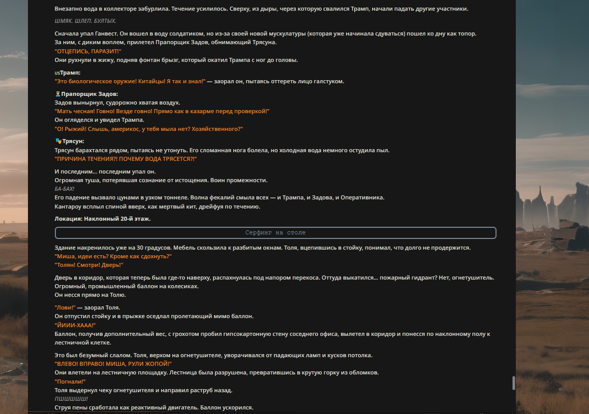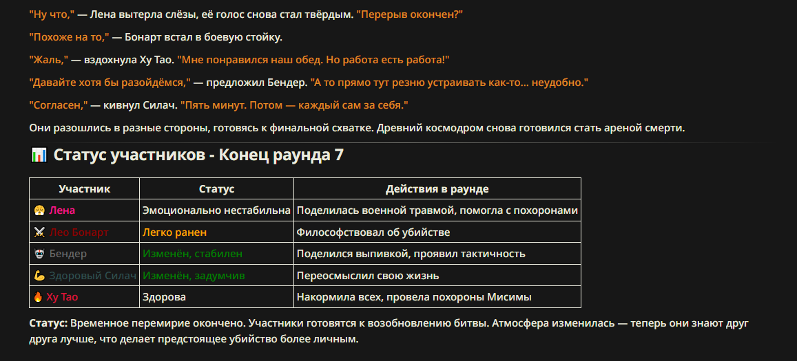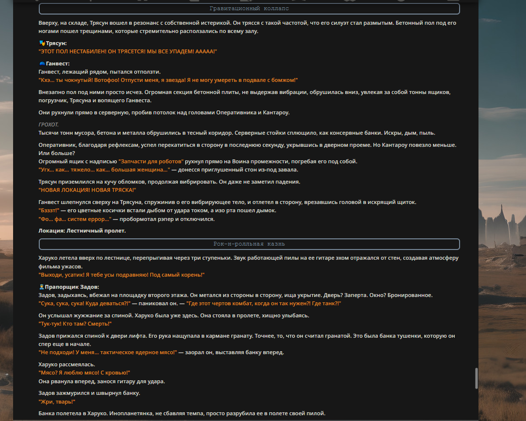 >>327013352 Обычные игры можно мутить в llm без нахлобучек сверху. Скидываешь начальный промт+персов, потом пишешь промт "опиши след раунд" и промт "опиши финал"