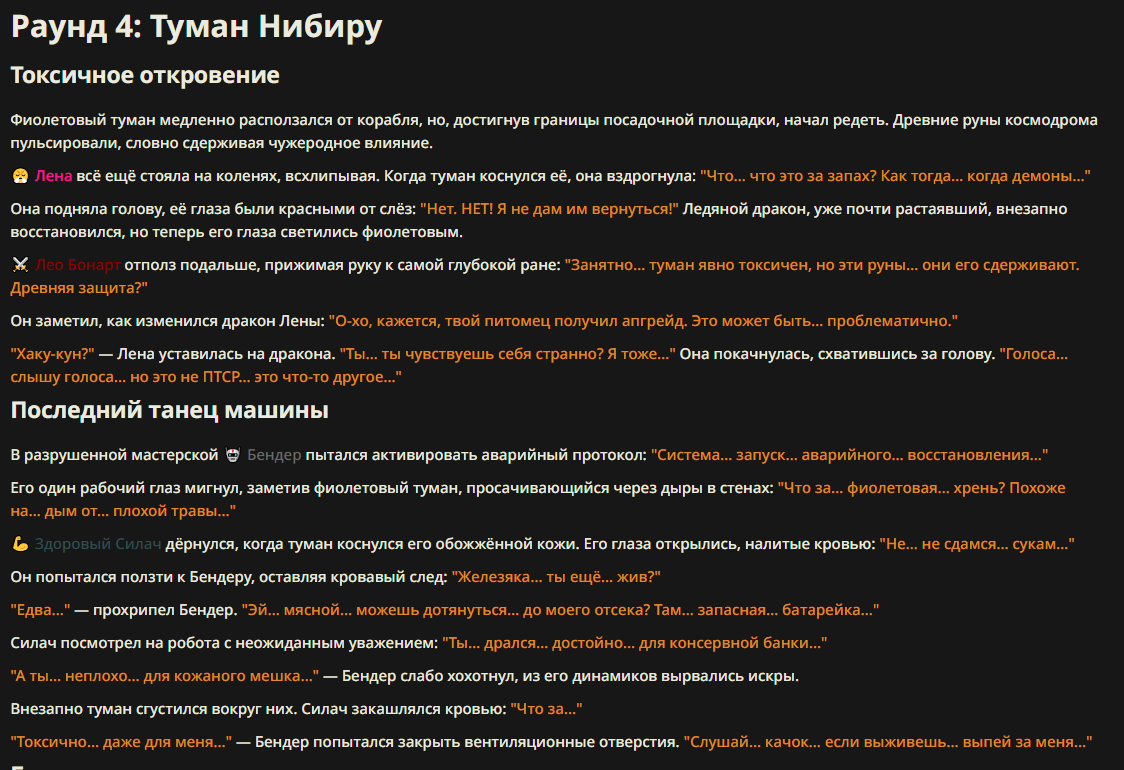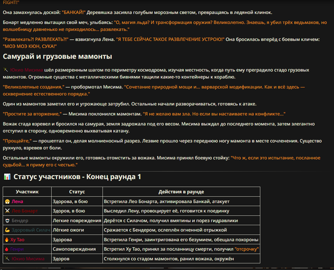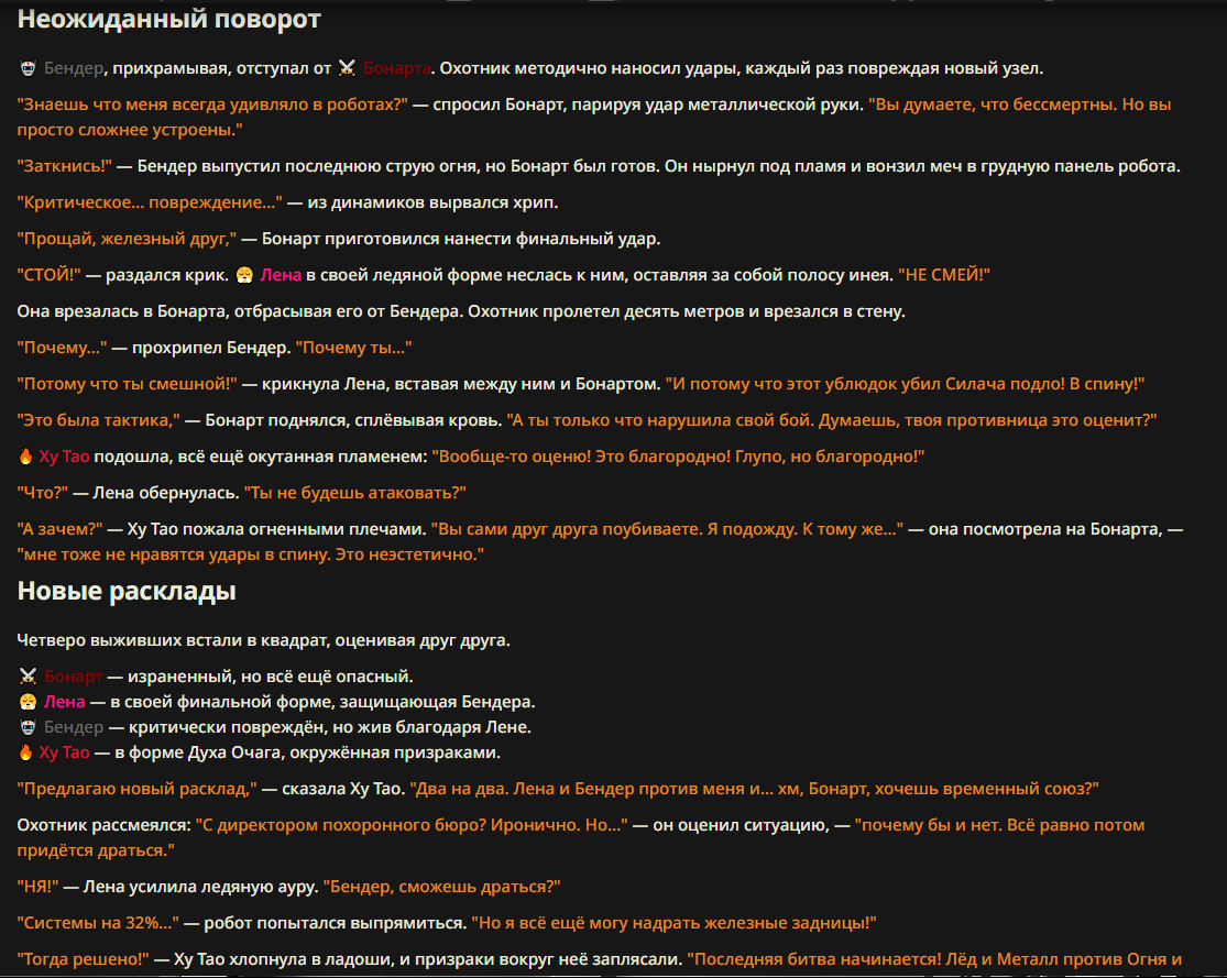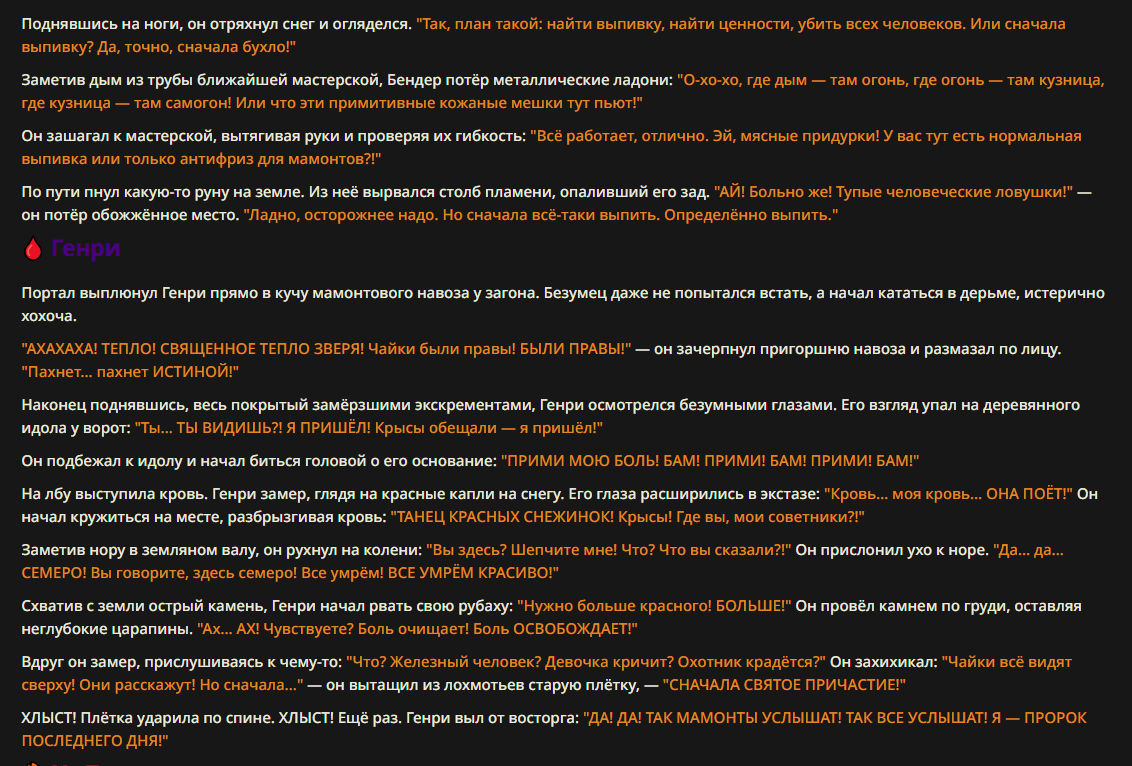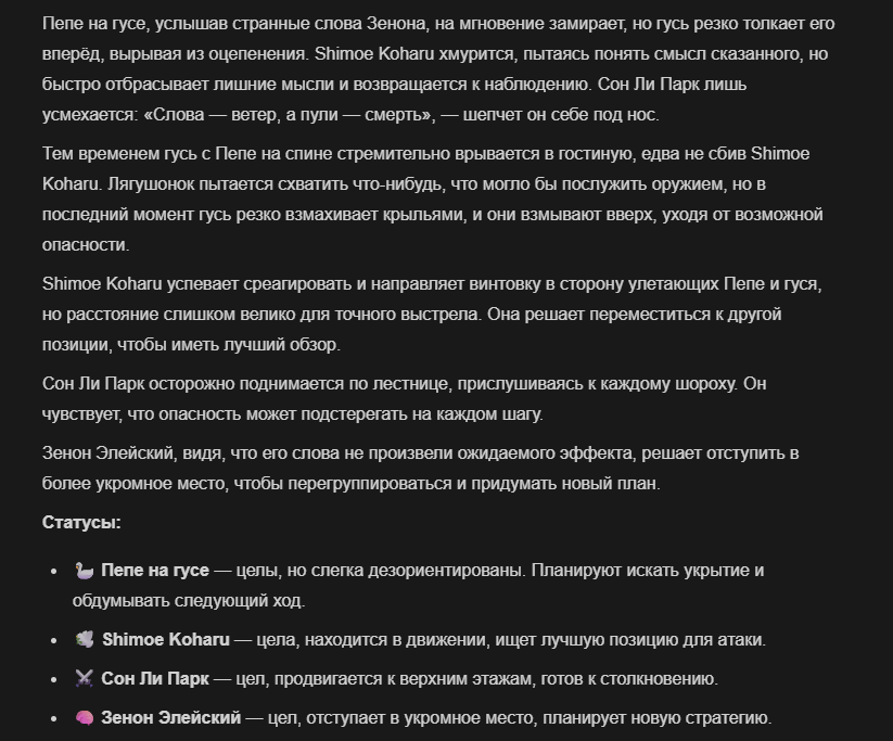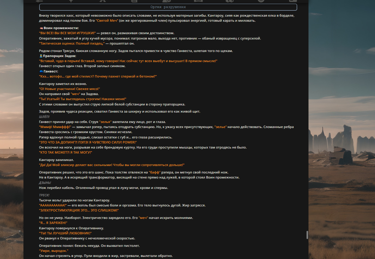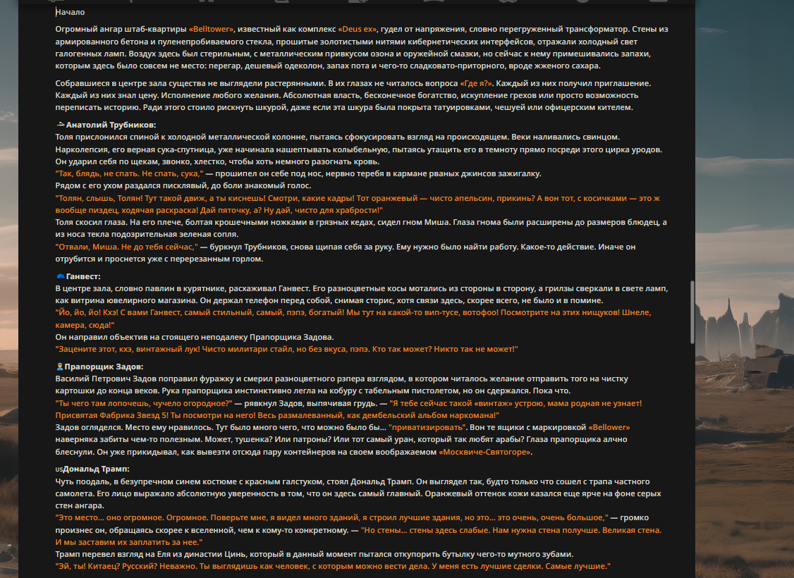 >>327013352 Обычные игры можно мутить в llm без нахлобучек сверху. Скидываешь начальный промт+персов, потом пишешь промт "опиши след раунд" и промт "опиши финал"