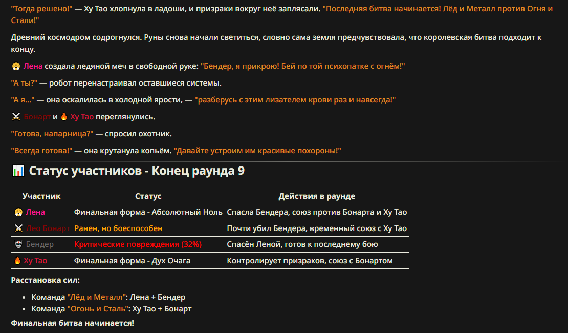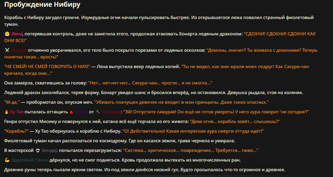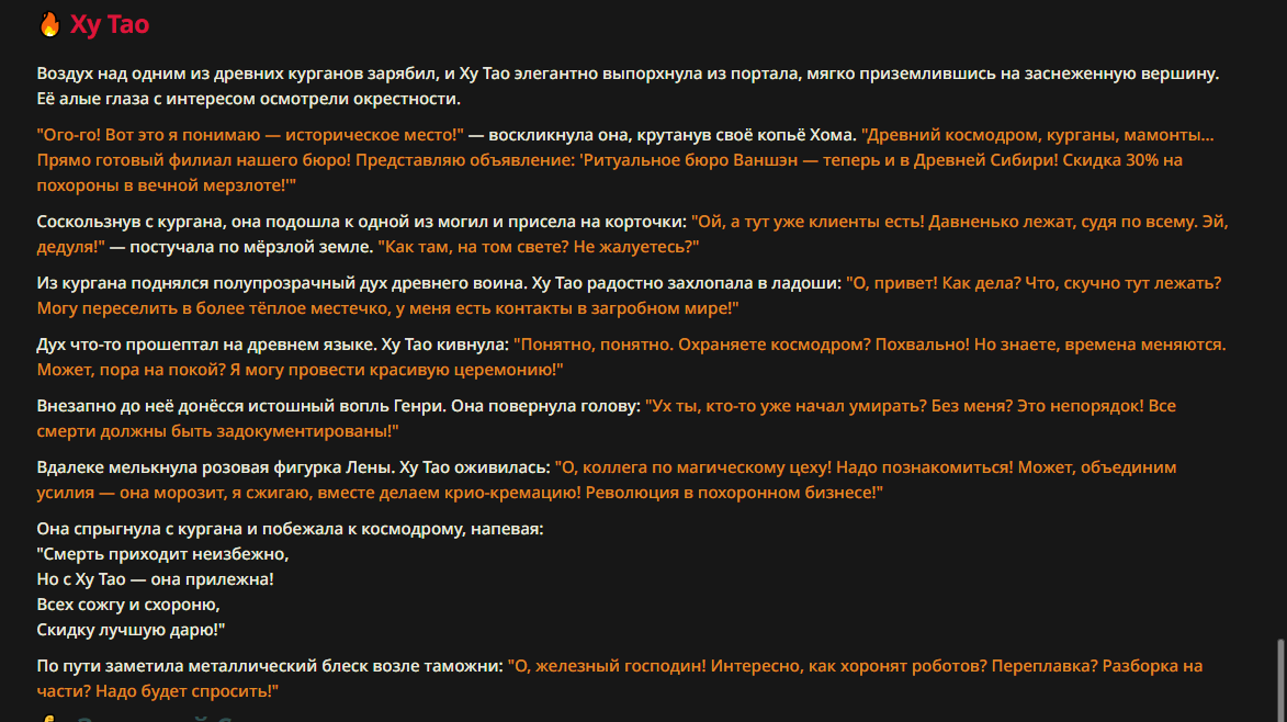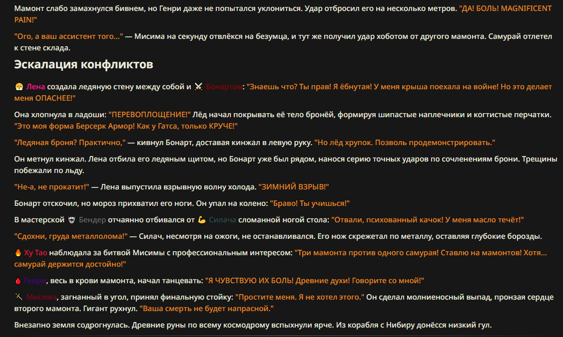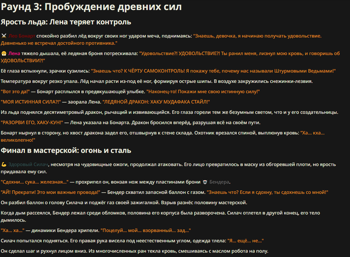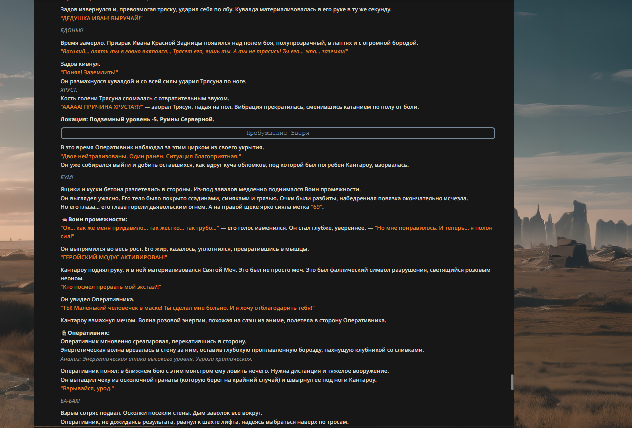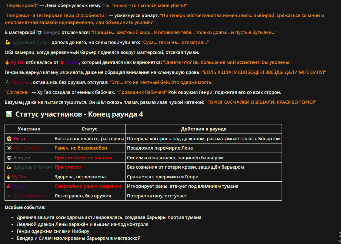 >>327013352 Обычные игры можно мутить в llm без нахлобучек сверху. Скидываешь начальный промт+персов, потом пишешь промт "опиши след раунд" и промт "опиши финал"
