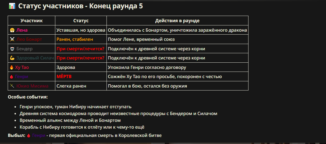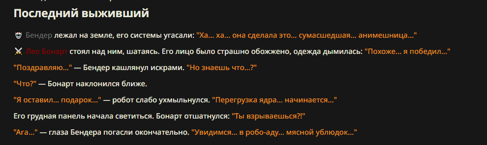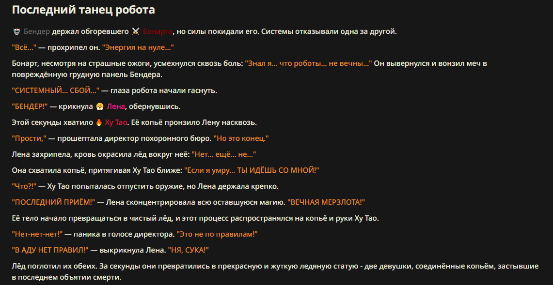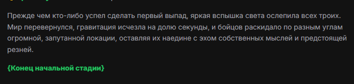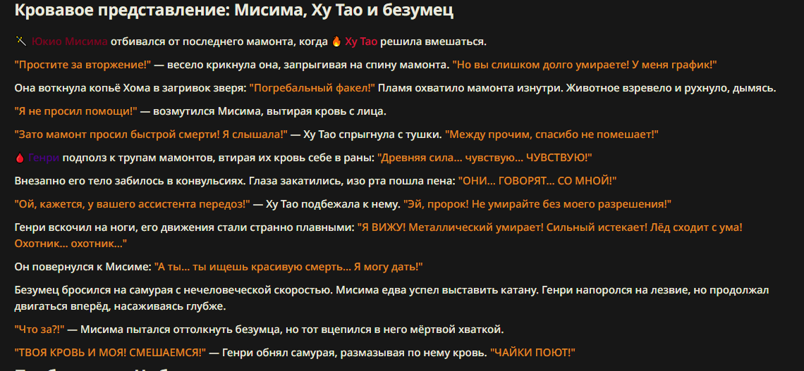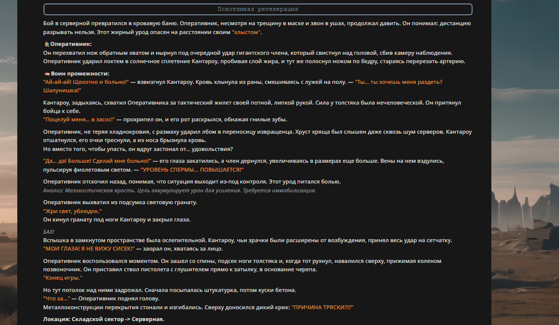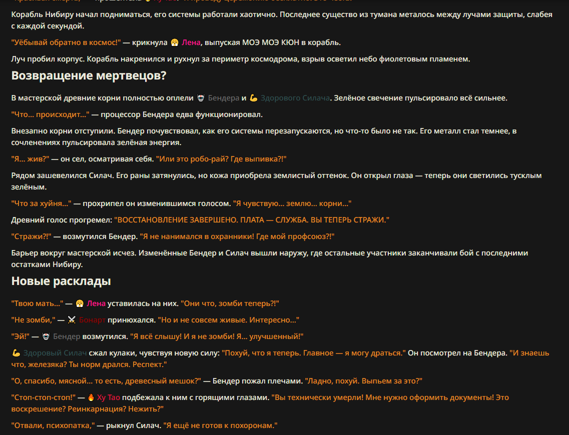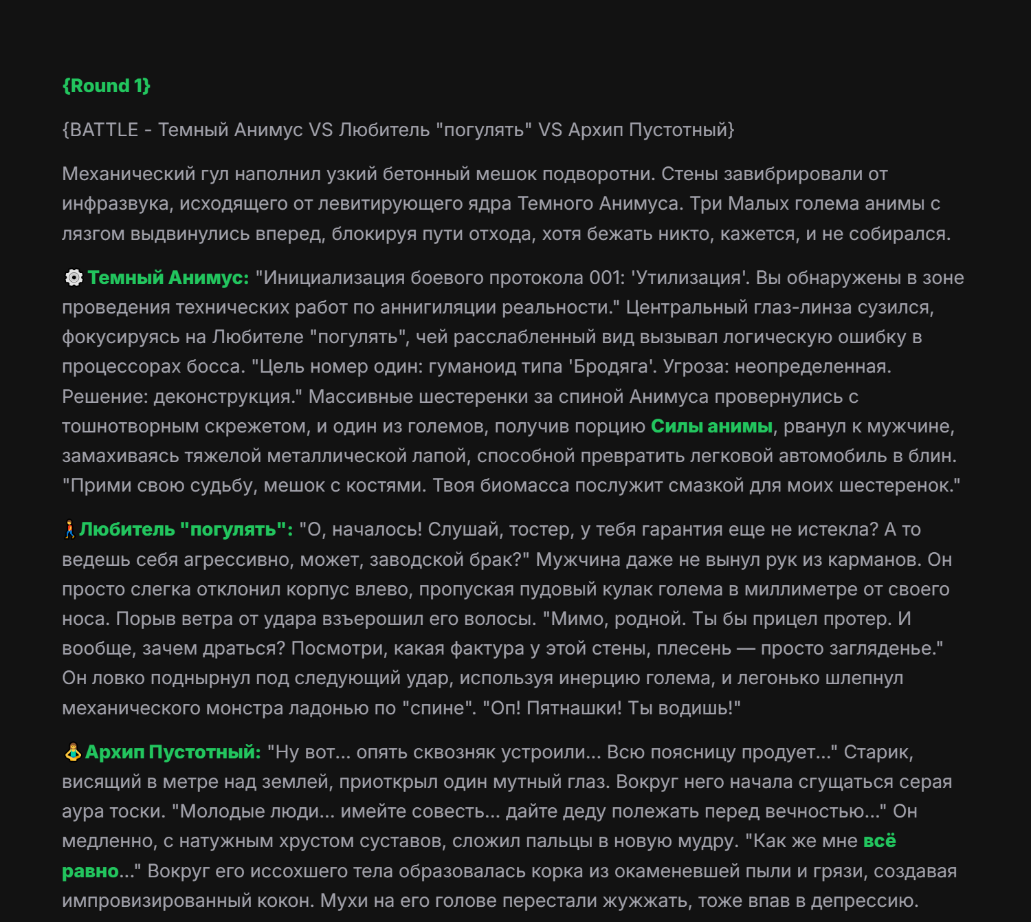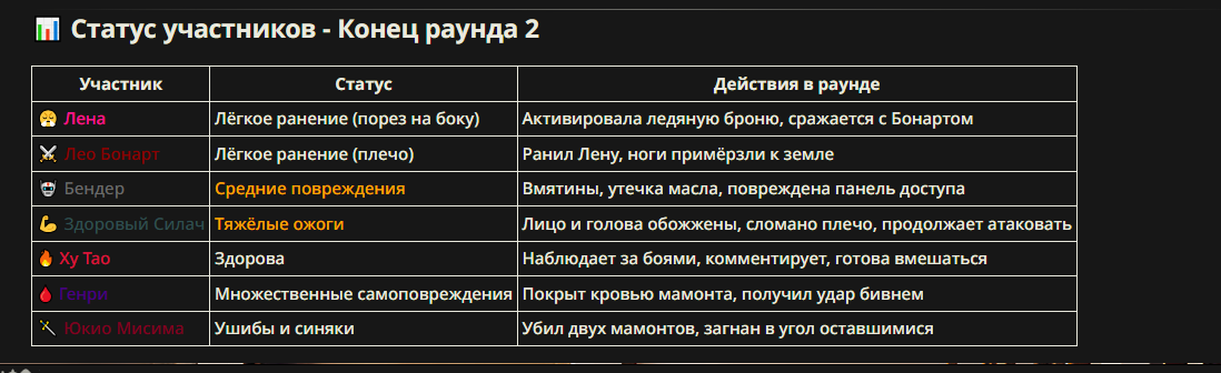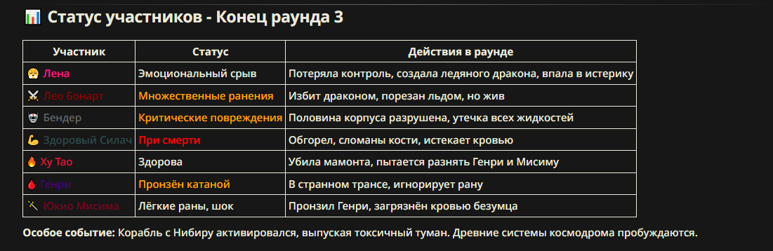 >>327013352 Обычные игры можно мутить в llm без нахлобучек сверху. Скидываешь начальный промт+персов, потом пишешь промт "опиши след раунд" и промт "опиши финал"