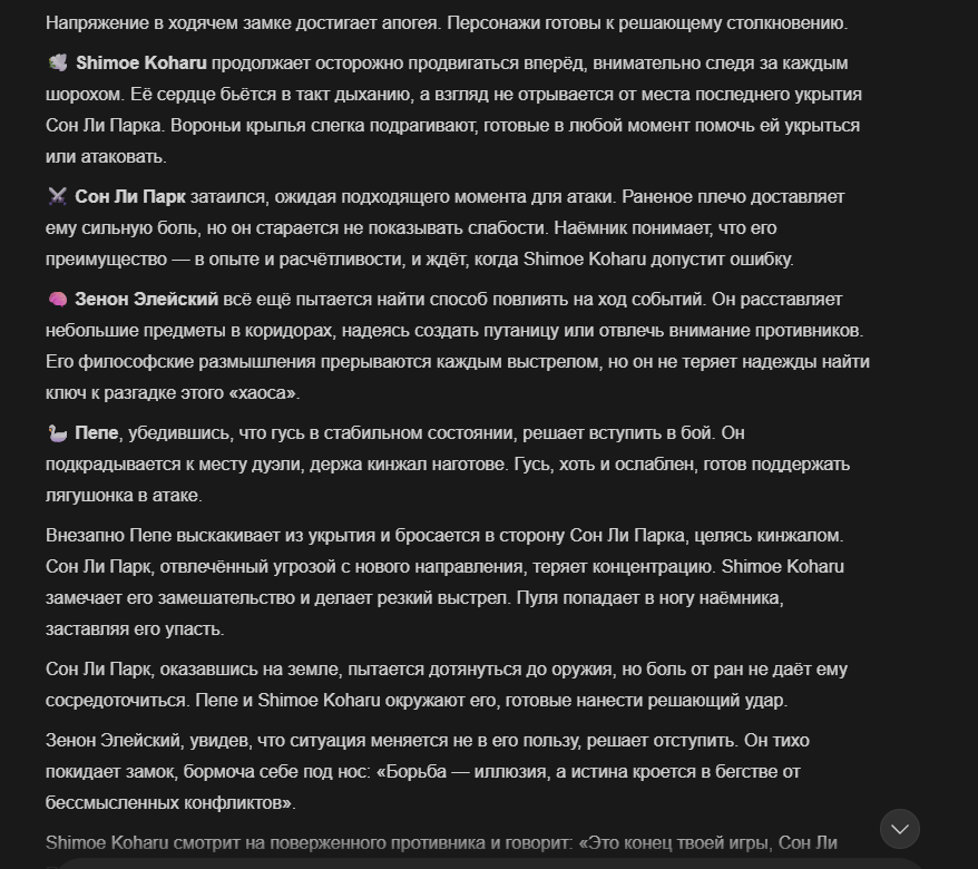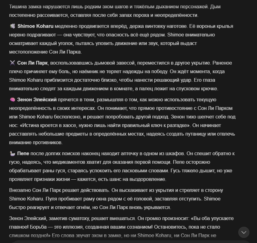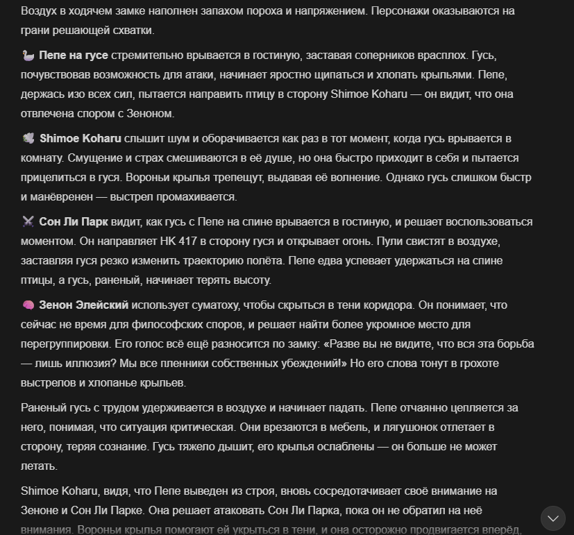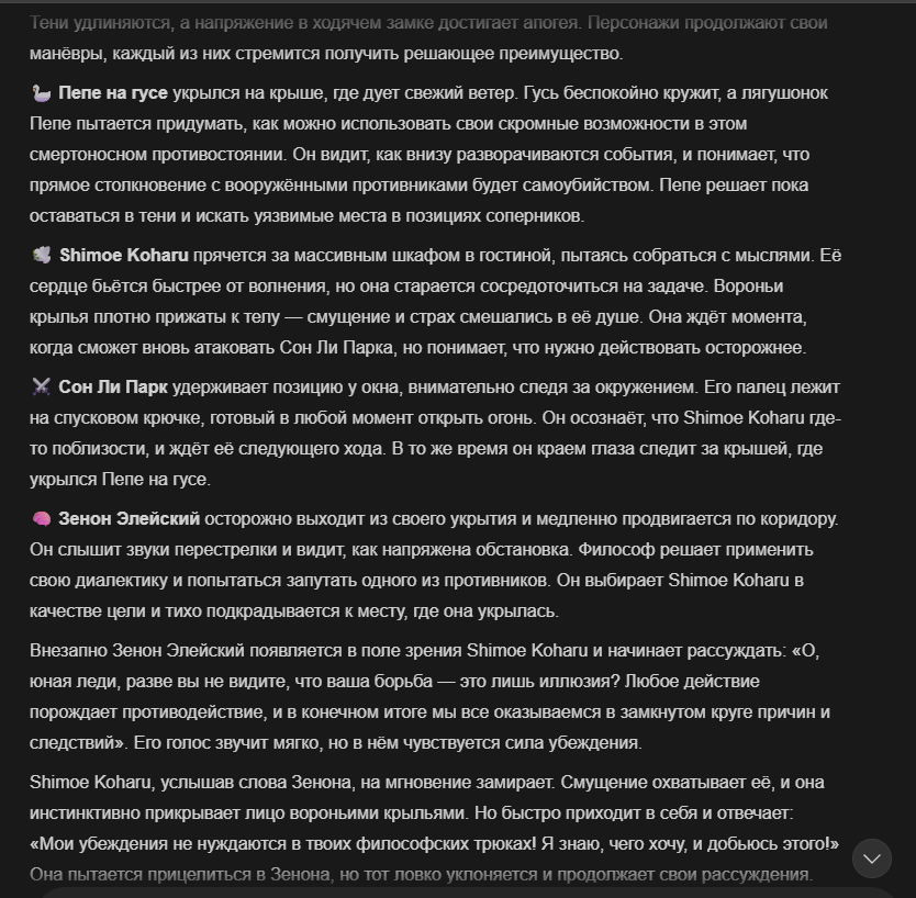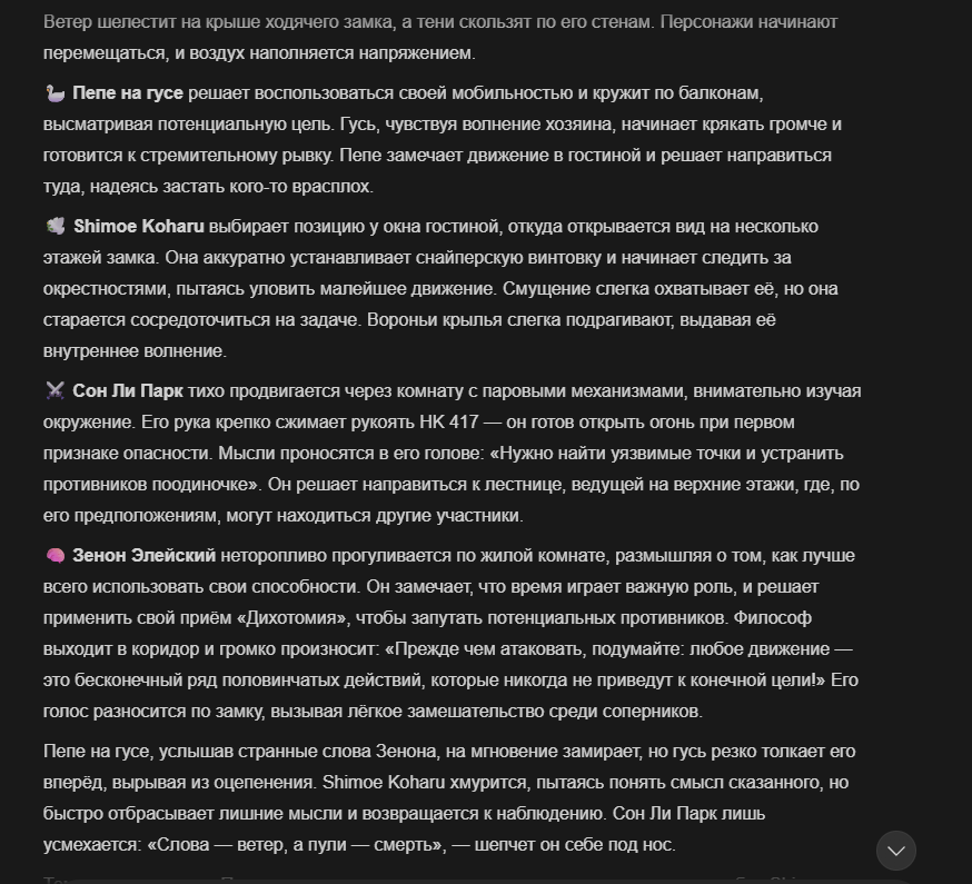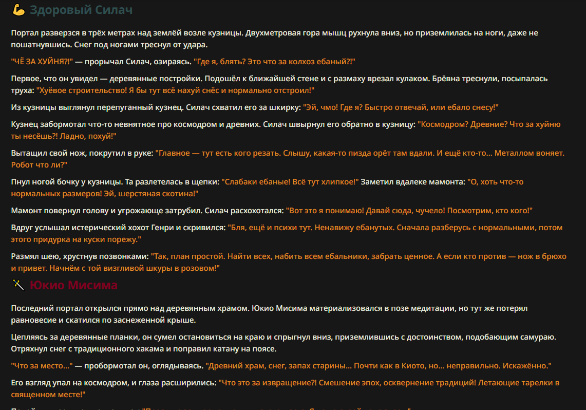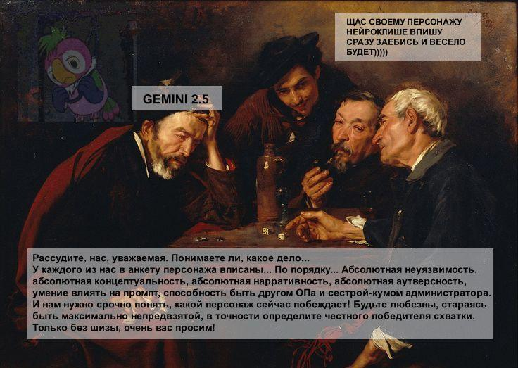 Так анончики. У меня тут приступ диареи. Если я нормально просрусь и останусь во вменяемом состоянии, то попробую провести вам игру в Алисе или дипсике с персонажами которых накидали