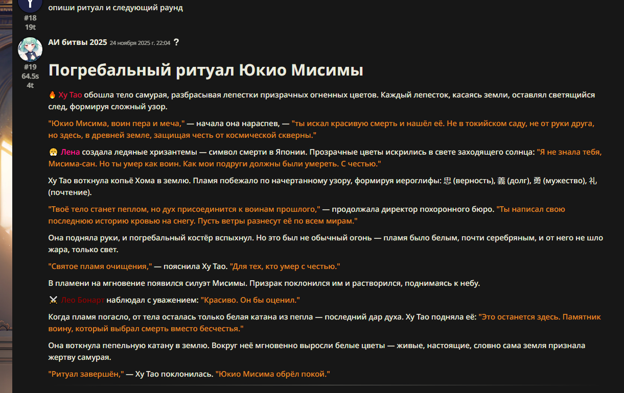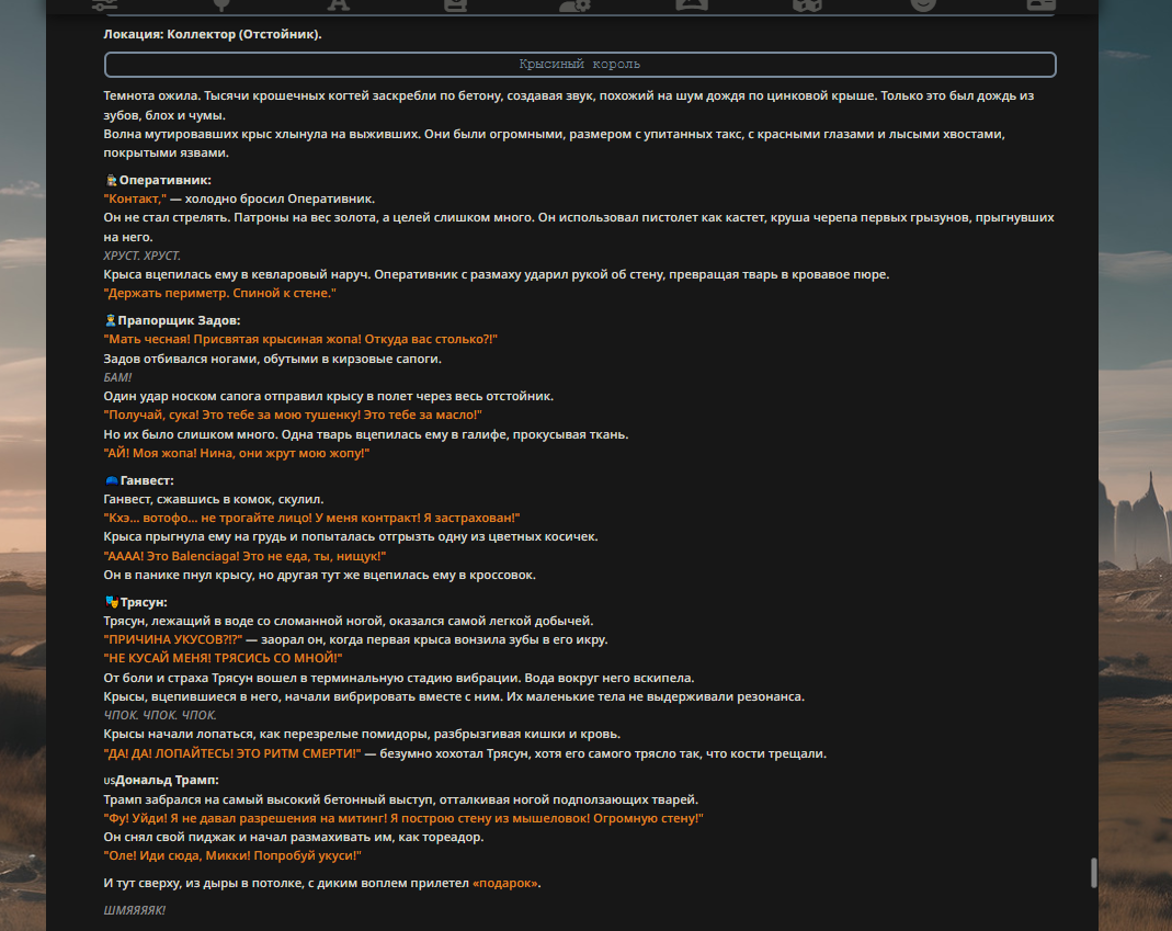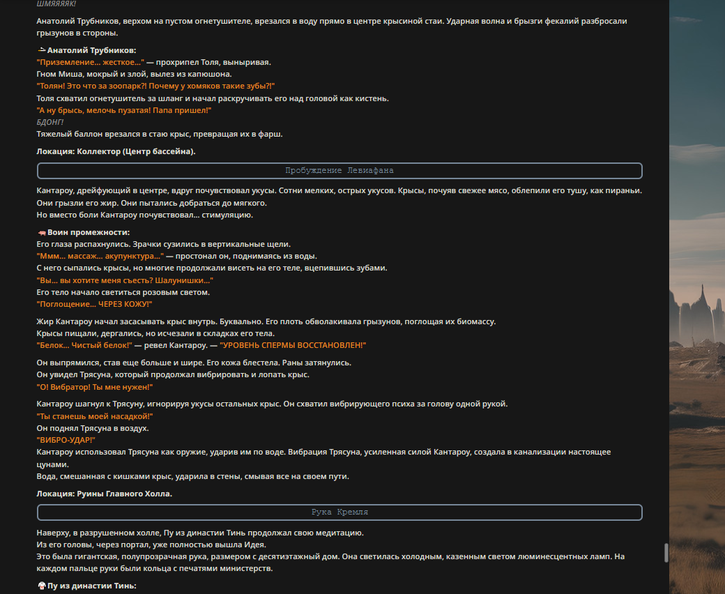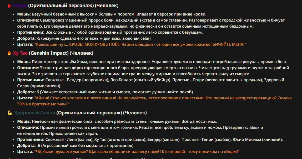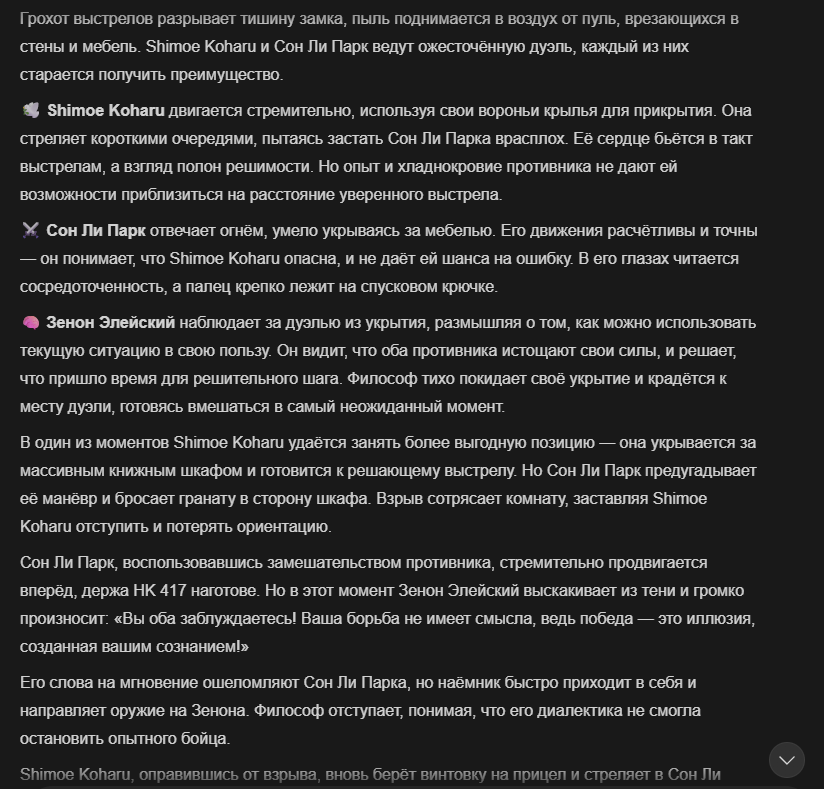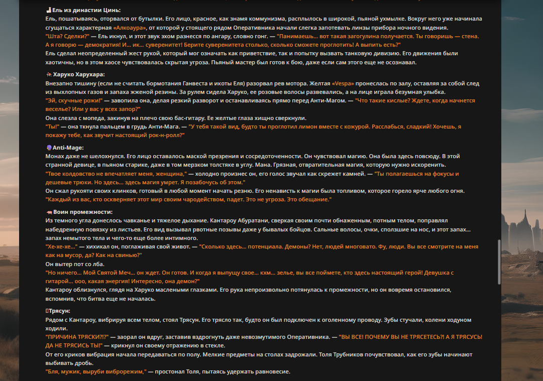 Так анончики. У меня тут приступ диареи. Если я нормально просрусь и останусь во вменяемом состоянии, то попробую провести вам игру в Алисе или дипсике с персонажами которых накидали