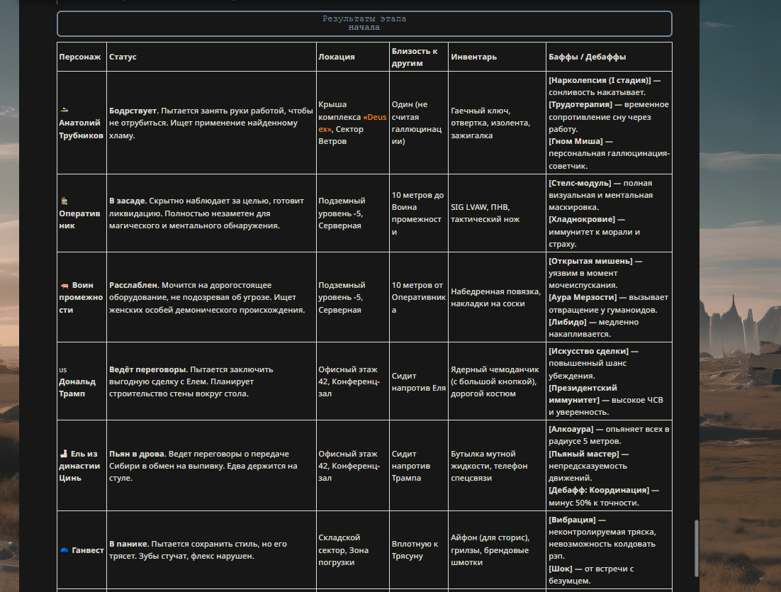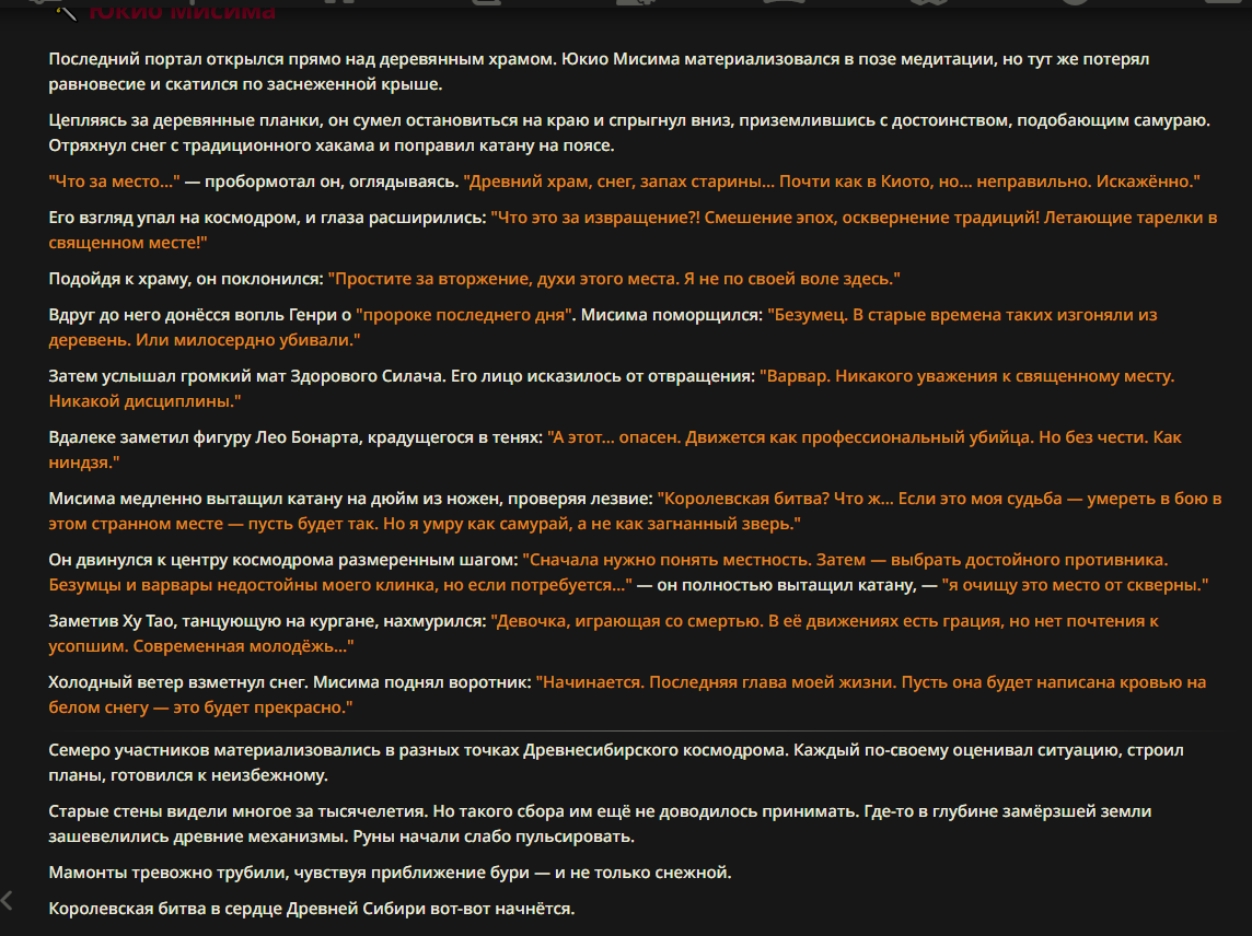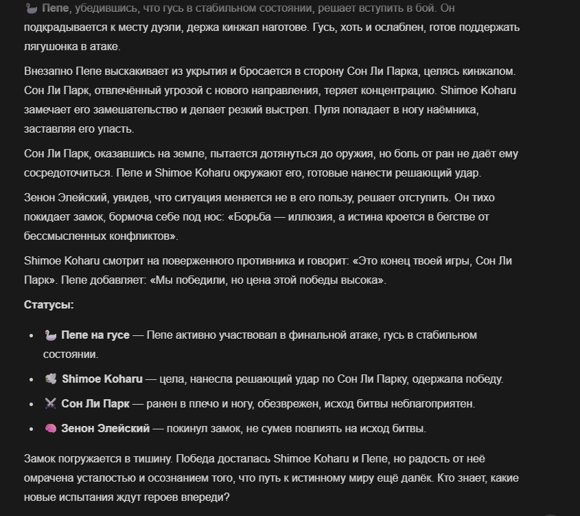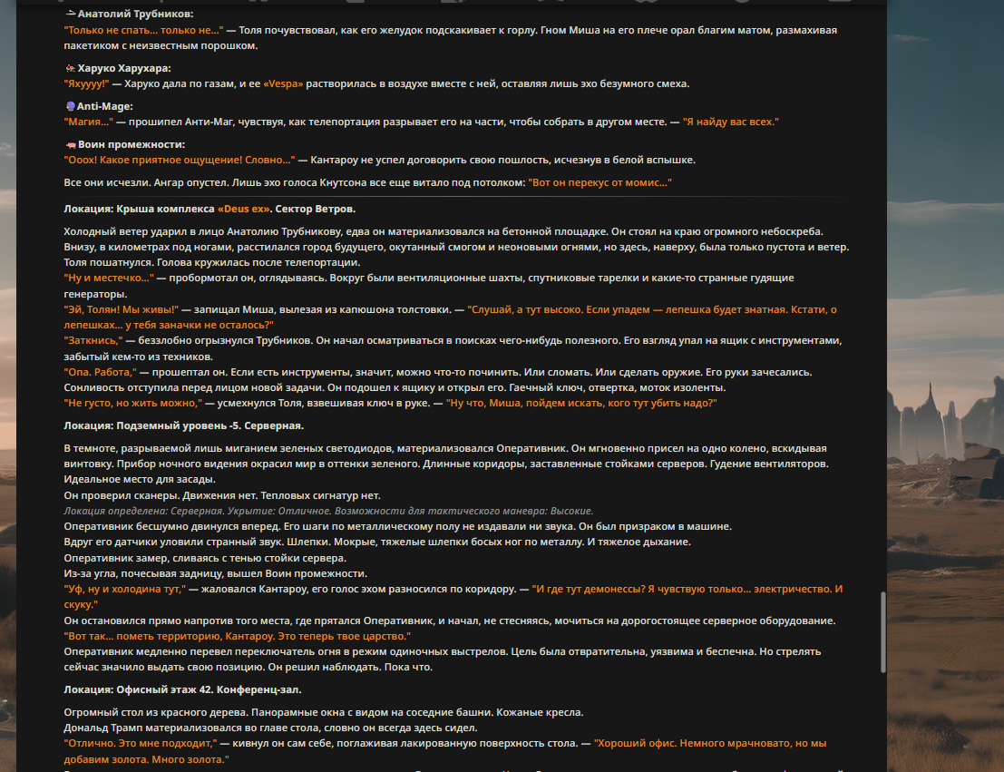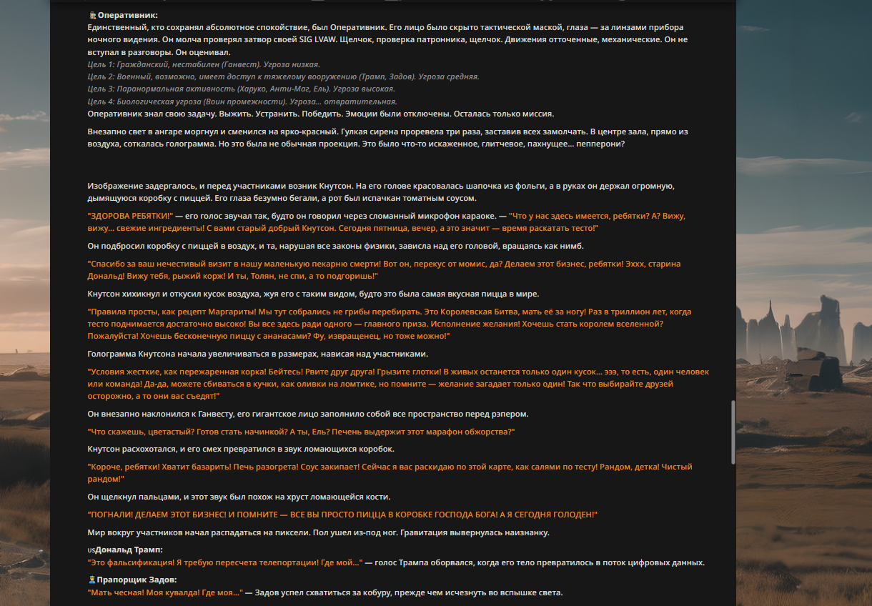 Так анончики. У меня тут приступ диареи. Если я нормально просрусь и останусь во вменяемом состоянии, то попробую провести вам игру в Алисе или дипсике с персонажами которых накидали