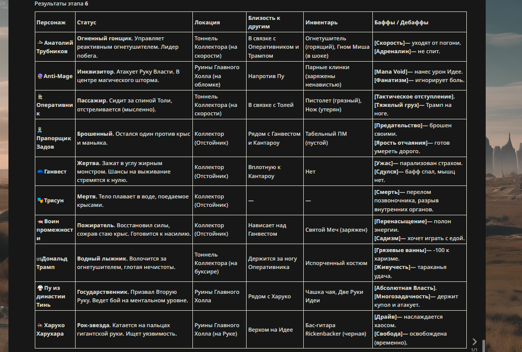Имя персонажа — Парадокс, Вечный Узник Ящика, представляющий собой сущность квантового хаоса в форме гигантского полупрозрачного кота, чье тело непрерывно мерцает, сменяясь то идеально ухоженной шерстью цвета космической пустоты, то разлагающейся плотью с обнаженными костями, а его глаза — это две вращающиеся сингулярности, одна из которых излучает свет жизни, а другая поглощает материю смертью, его пассивная способность «Абсолютная Суперпозиция» делает его существование на арене неопределенным, из-за чего 50% всех входящих атак просто проходят сквозь него, не находя цели в этой реальности, а оставшиеся 50% урона преобразуются в лечение, если в момент удара срабатывает случайный триггер «Жив», вторая пассивка «Квантовая Запутаность» связывает его состояние с состоянием противника, поэтому любой наложенный на Парадокса дебафф с вероятностью 100% дублируется на врага с удвоенной силой, его базовая атака «Когтевой Туннель» позволяет наносить удары из любой точки пространства, игнорируя броню и щиты, так как когти материализуются уже внутри тела противника, первый активный навык «Разбитая Ампула» выпускает токсичный туман, который не просто отравляет, а переписывает код ДНК врага, заставляя его способности случайным образом менять свои свойства или наносить урон владельцу, второй навык «Наблюдатель не нужен» позволяет Парадоксу исчезнуть из реальности на 5 секунд, становясь полностью неуязвимым и невидимым, но продолжая атаковать фантомными копиями из альтернативных таймлайнов, ультимативная способность «Коллапс Волновой Функции» принудительно схлопывает все вероятности в одну точку: Парадокс открывает свой Ящик, и если у врага меньше 99% здоровья, он мгновенно аннигилируется, будучи признанным «мертвым» вселенной, а если больше — его здоровье сокращается до 1% с наложением вечного стана, уникальность этого персонажа заключается в том, что его невозможно убить окончательно, так как при достижении 0 здоровья он просто переключается в состояние «Мертв» и продолжает бой в виде неуязвимого призрака, наносящего чистый урон, пока не воскреснет через 10 секунд с полным запасом сил, что делает его самым сложным и непредсказуемым противником
