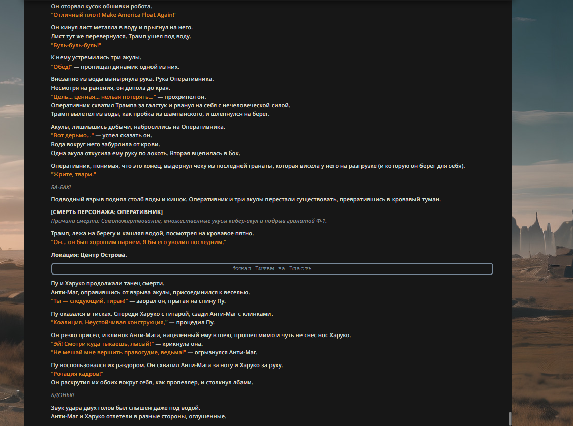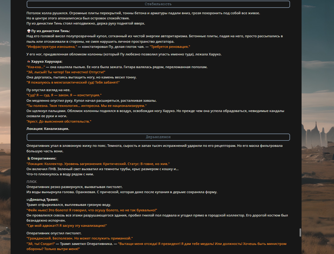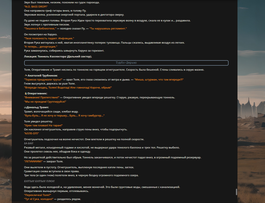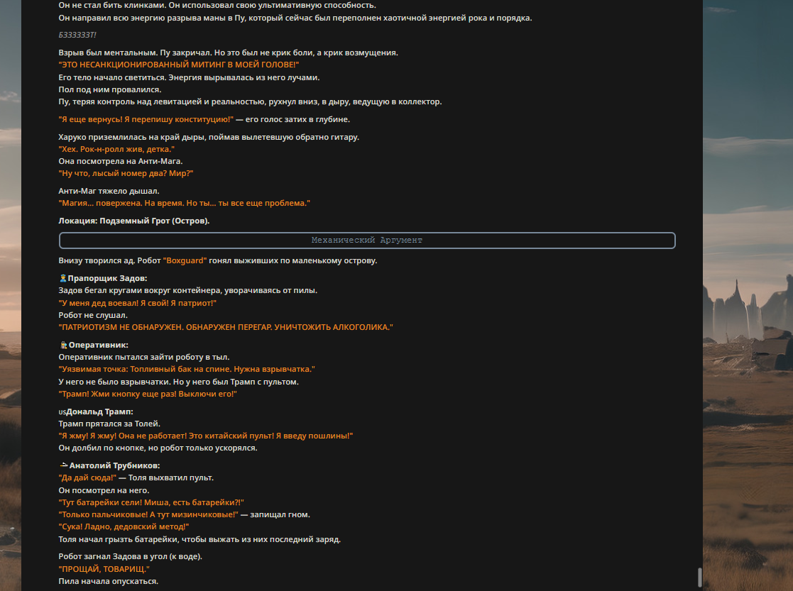 Пу отряхнул кимоно. "Слухи о моей смерти сильно преувеличены. Ситуация под контролем." Он оглядел собравшихся: грязного Задова, мокрого Трампа, жующего батарейки Толю и Оперативника с ножом. "Электорат," — вздохнул он. — "Печальное зрелище."