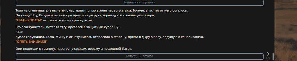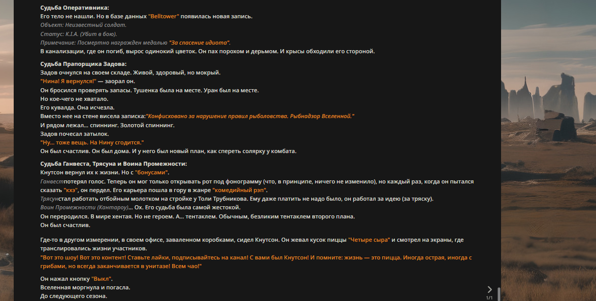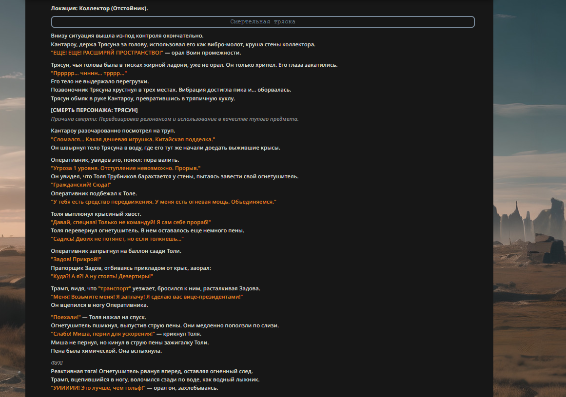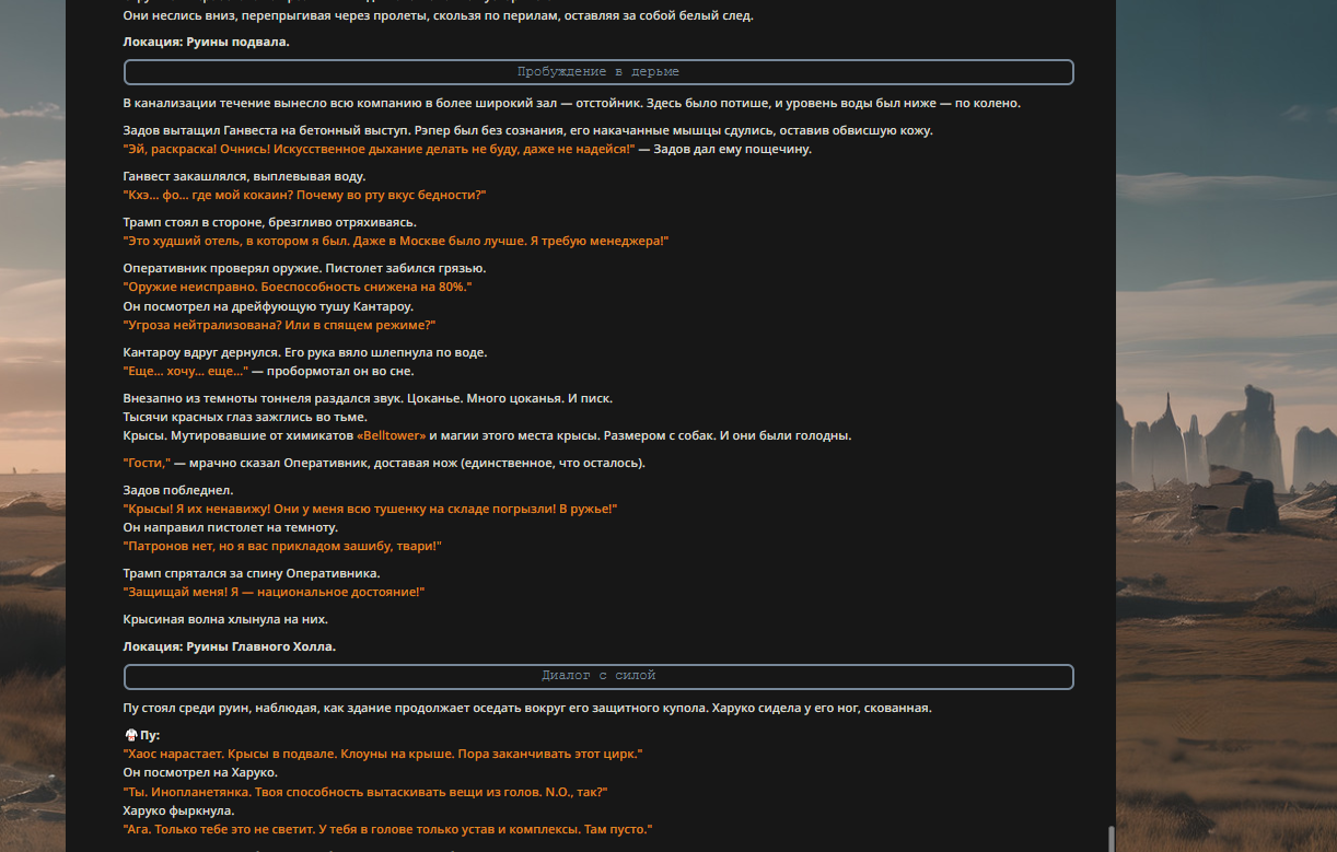 Пу отряхнул кимоно. "Слухи о моей смерти сильно преувеличены. Ситуация под контролем." Он оглядел собравшихся: грязного Задова, мокрого Трампа, жующего батарейки Толю и Оперативника с ножом. "Электорат," — вздохнул он. — "Печальное зрелище."