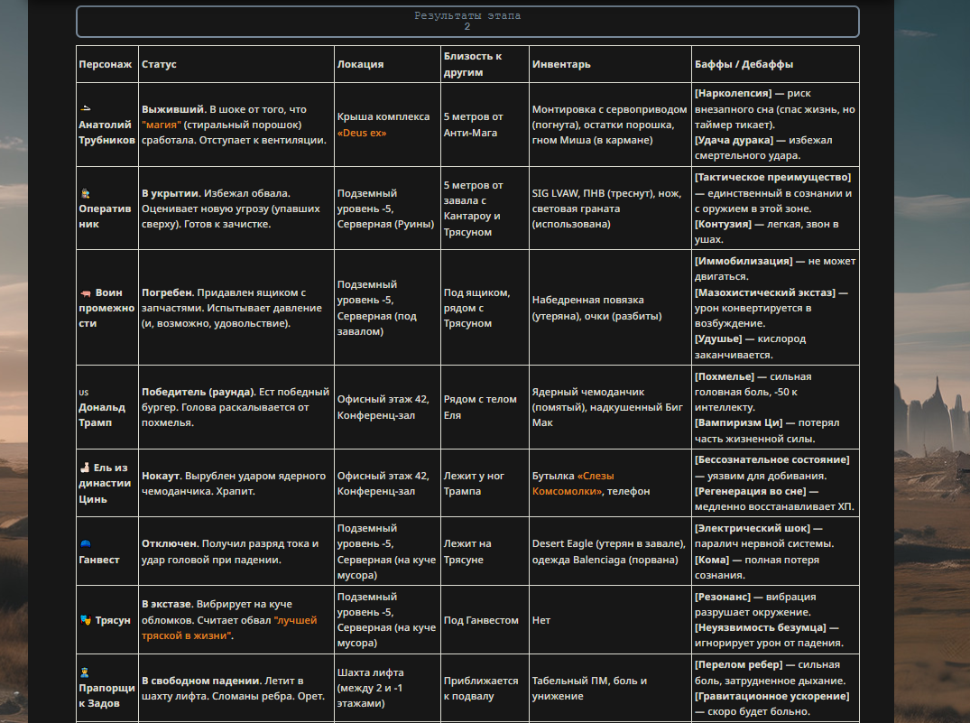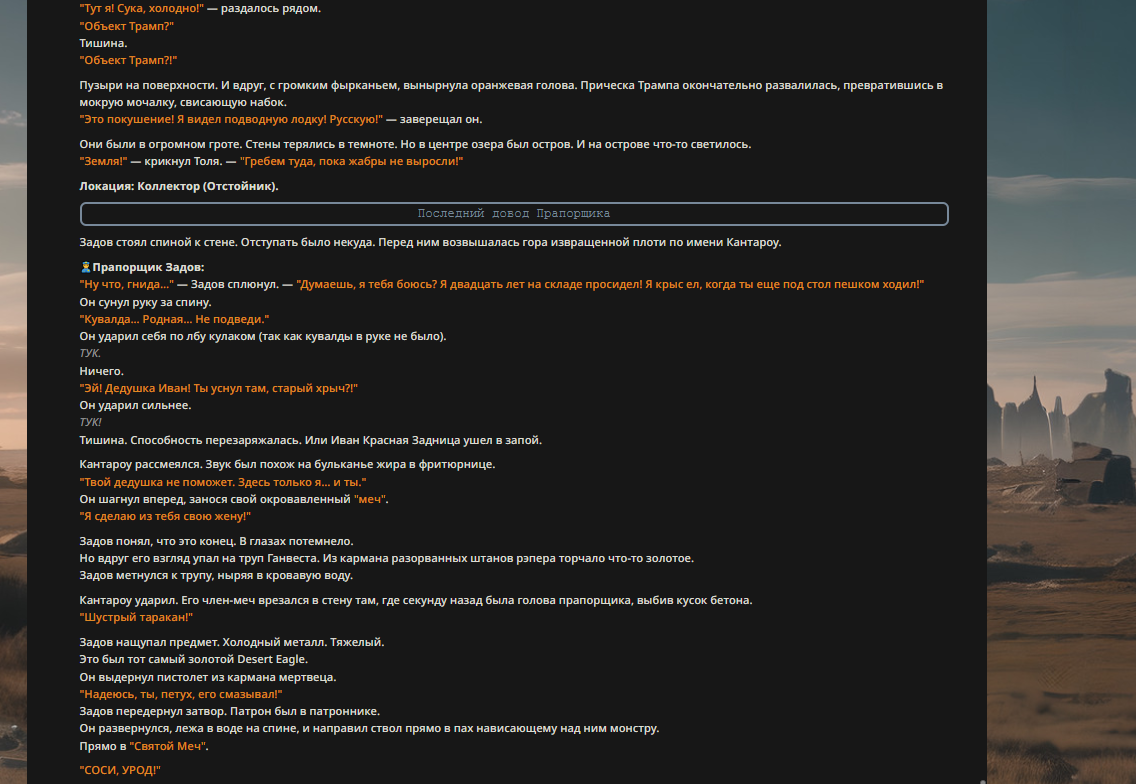 Прапорщик Задов наблюдал за падением Пу. "Ого… Лысый спёкся. Толян его уделал. Молоток, мужик!" Задов посмотрел на свой пистолет. "Так. Остались: Толян (дохлый), Трамп (лох), баба с гитарой (в ауте) и монах (в ауте). И я." В его глазах загорелся алчный огонь. "Я могу победить! Я загадаю… вагон тушенки! Нет, два вагона! И дачу генеральскую!"