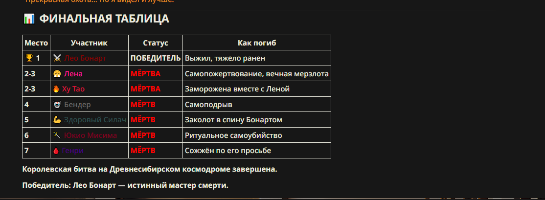 [СМЕРТЬ ПЕРСОНАЖА: ВОИН ПРОМЕЖНОСТИ] Причина смерти: Огнестрельное ранение в пах, разрыв таза, несовместимая с жизнью потеря крови и достоинства.