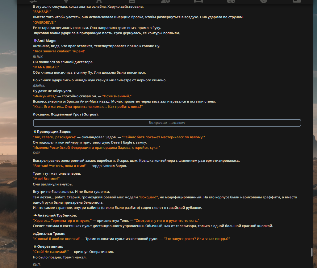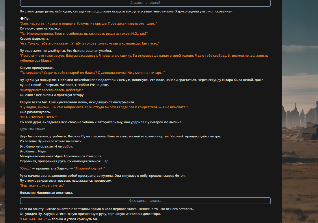 "Здесь нет законов, кроме моих," — спокойно ответил Пу. — "Ты мешаешь. Посиди пока в углу." Он сделал легкое движение кистью, и Трампа швырнуло через весь зал. Он врезался в стену и прилип к ней, удерживаемый невидимой силой гравитации. "Сиди тихо. И не чирикай."