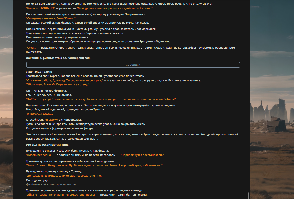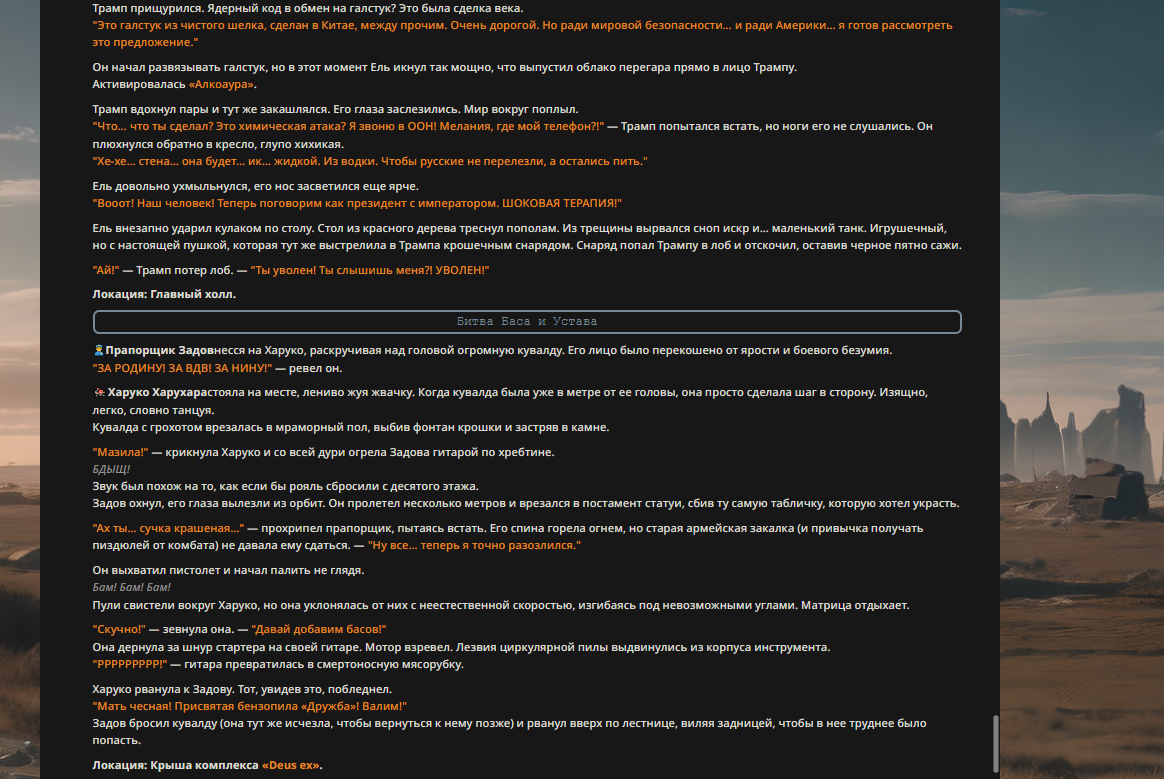 Но Трамп был не прост. Его эго было настолько огромным, что оно создало ментальный барьер. "НЕТ! Я НЕ ПРОИГРЫВАЮ! Я ПОБЕЖДАЮ!" Он из последних сил, преодолевая похмелье и высасывание жизни, укусил Еля за руку. "Ай, бля!" — Ель отдернул руку.