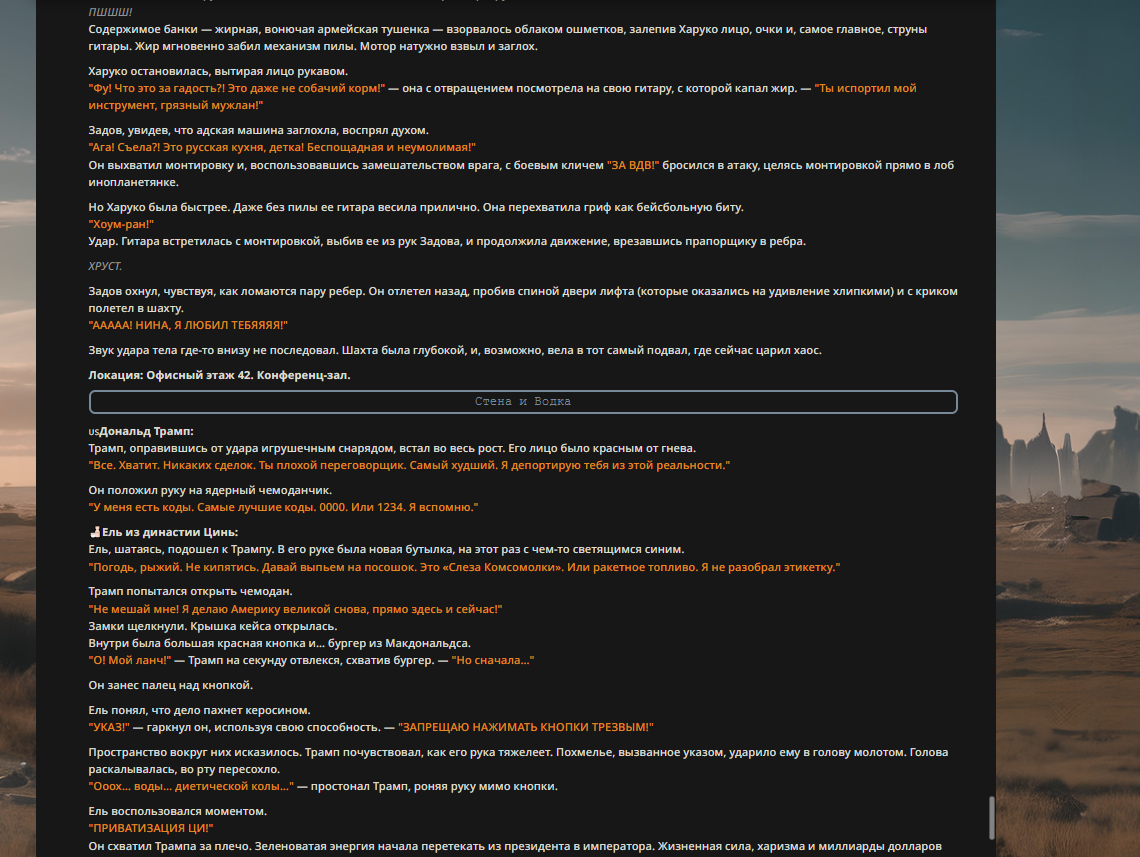 Трамп, шатаясь, схватил ядерный чемоданчик и, не имея сил нажать кнопку, просто размахнулся и ударил им Еля по голове. БДУМС! Удар был тяжелым. Ель пошатнулся, его глаза разъехались в разные стороны. "Ты… ты меня уважаешь?" — спросил он у пустоты и рухнул на пол, захрапев.