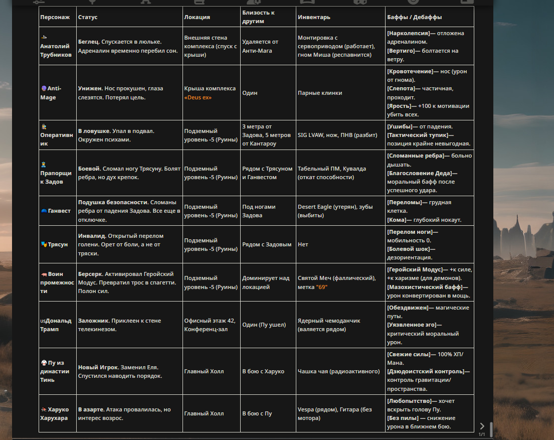 >>326992043 (OP) Архип Пустотный, Класс: Танк-Саботажник, Внешний вид: мумифицированный старик с кожей цвета пергамента, парящий в позе лотоса в полуметре над землей просто потому, что ему лень переставлять ноги, одет в истлевшие лохмотья, вокруг головы лениво кружат три мухи, являющиеся его фамильярами, Характеристики: Здоровье — высокое, Скорость — экстремально низкая, Мана — заменена на шкалу «Смирение», Пассивная способность «Абсолютный Дзен»: если Архип не двигается более 2 секунд, он получает 60% сопротивления любому урону и иммунитет к контролю, так как его сознание находится в астрале и не регистрирует боль, но при этом он не может уклоняться от атак, Первая способность (Q) «Тяжкий Вздох»: Архип издает настолько унылый звук, что у всех врагов в радиусе 10 метров снижается скорость атаки и передвижения на 40% из-за внезапного приступа депрессии и потери мотивации жить, Вторая способность (W) «Мне всё равно»: активируя этот навык, дед покрывается коркой окаменевшей пыли, поглощая следующий входящий урон и преобразуя его в лечение, бормоча при этом «ну ударил и ударил, чего бубнить-то», Третья способность (E) «Игнорирование реальности»: Архип закрывает глаза, становясь невидимым и неосязаемым для врагов на 3 секунды, но при этом он не может атаковать, а просто восстанавливает силы, сбрасывая агро мобов, Ультимативная способность (R) «Нирвана Лентяя»: Архип создает вокруг себя зону радиусом 20 метров, в которой время замедляется для всех, кроме него, враги в зоне получают чистый урон от осознания тщетности бытия, а их способности уходят на перезарядку мгновенно, но не срабатывают, Недостатки и слабости: «Старческий маразм» — с вероятностью 5% любая его способность может не сработать, потому что он забыл, что хотел сделать, «Хрупкие кости» — получает на 20% больше урона от дробящего оружия, «Радикулит» — не может совершать рывки, прыжки или быстрые развороты, скорость поворота камеры снижена, Особенность геймплея: идеален для удержания точек, так как его просто невозможно сдвинуть с места морально и физически, а его основной стиль боя — стоять столбом и ждать, пока враги умрут от старости или скуки.