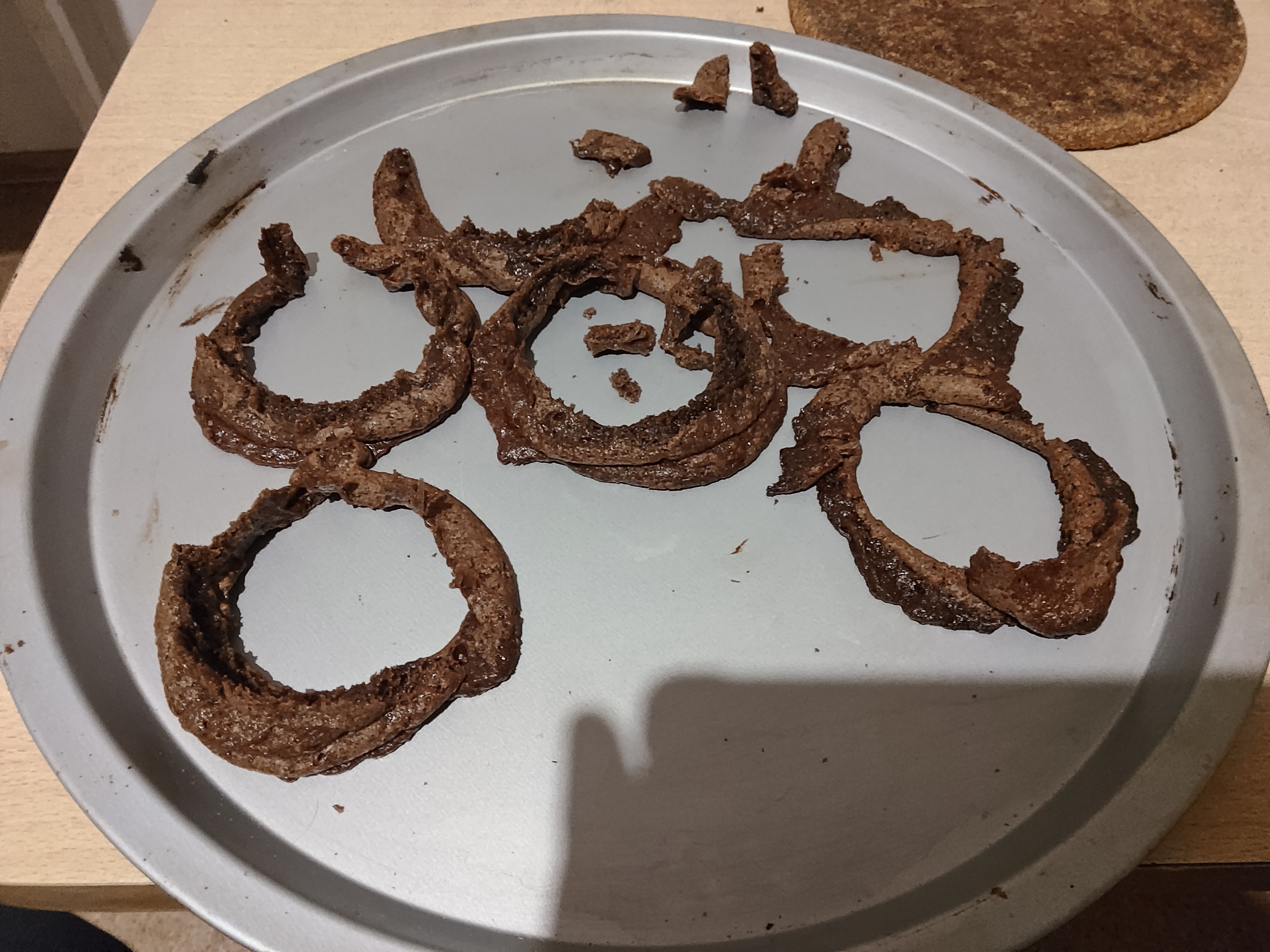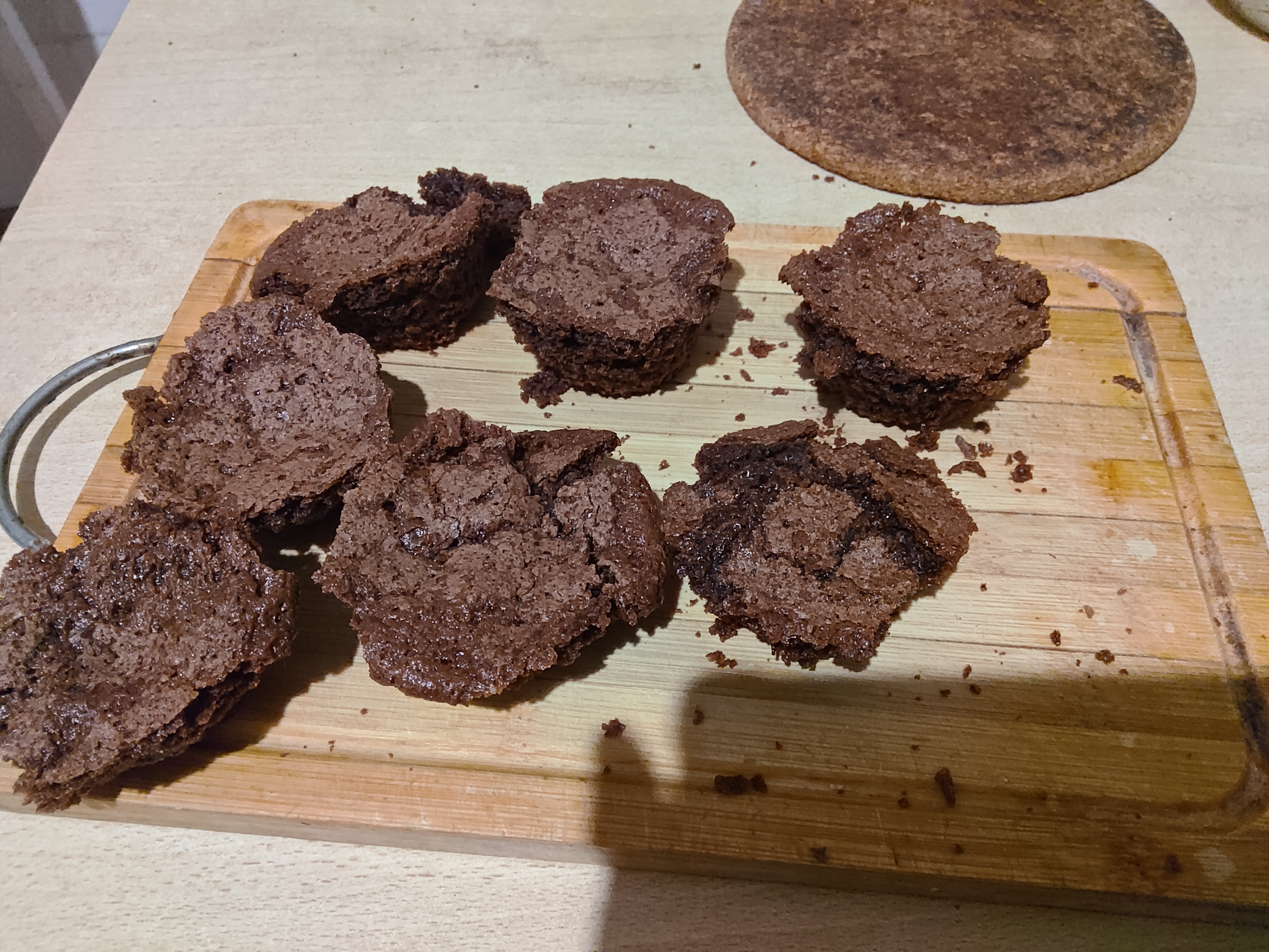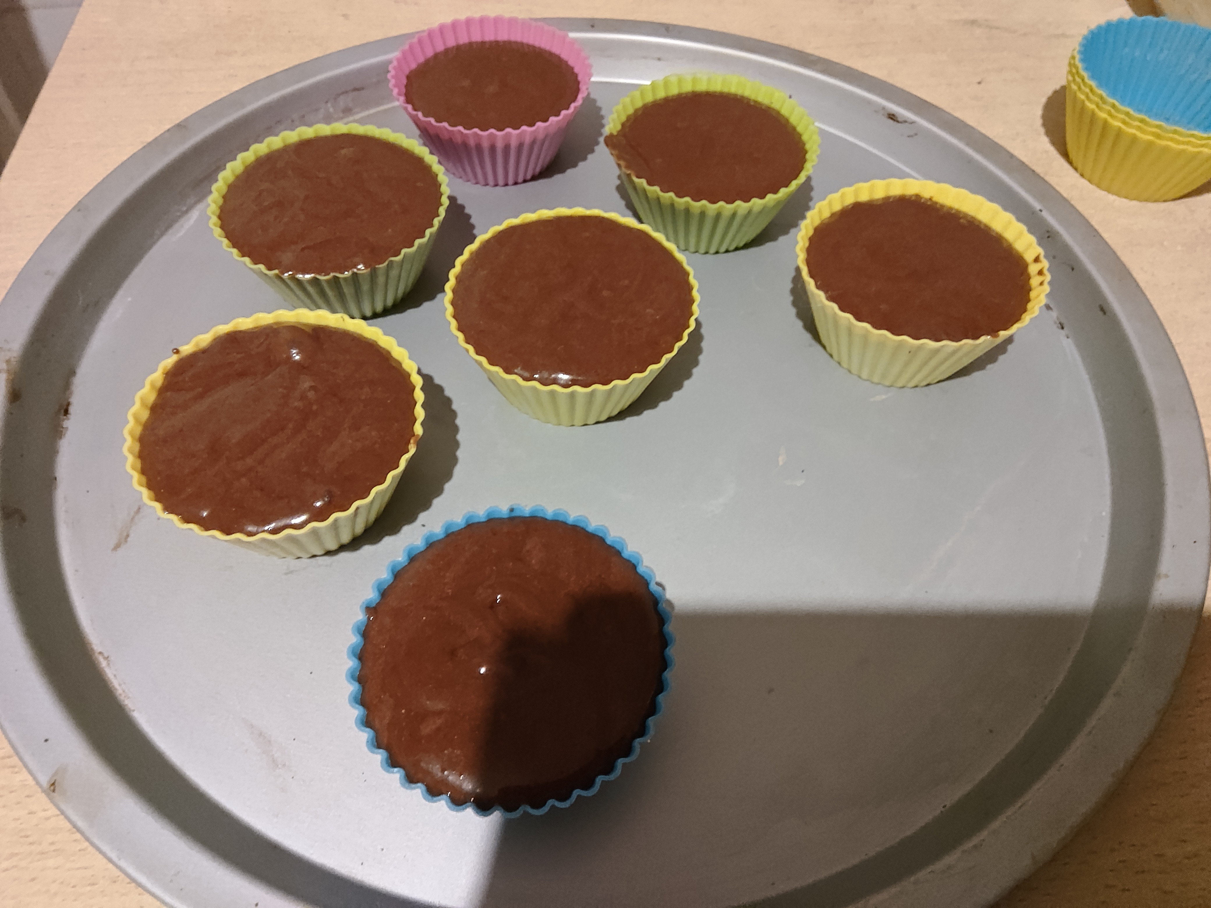 Собсно первый блин комом. Тесто вылезло наружу и запеклось на противне шоколадными печеньками, то что осталось жестко прилипло к силиконовым формам, видимо надо было их чем то смазывать