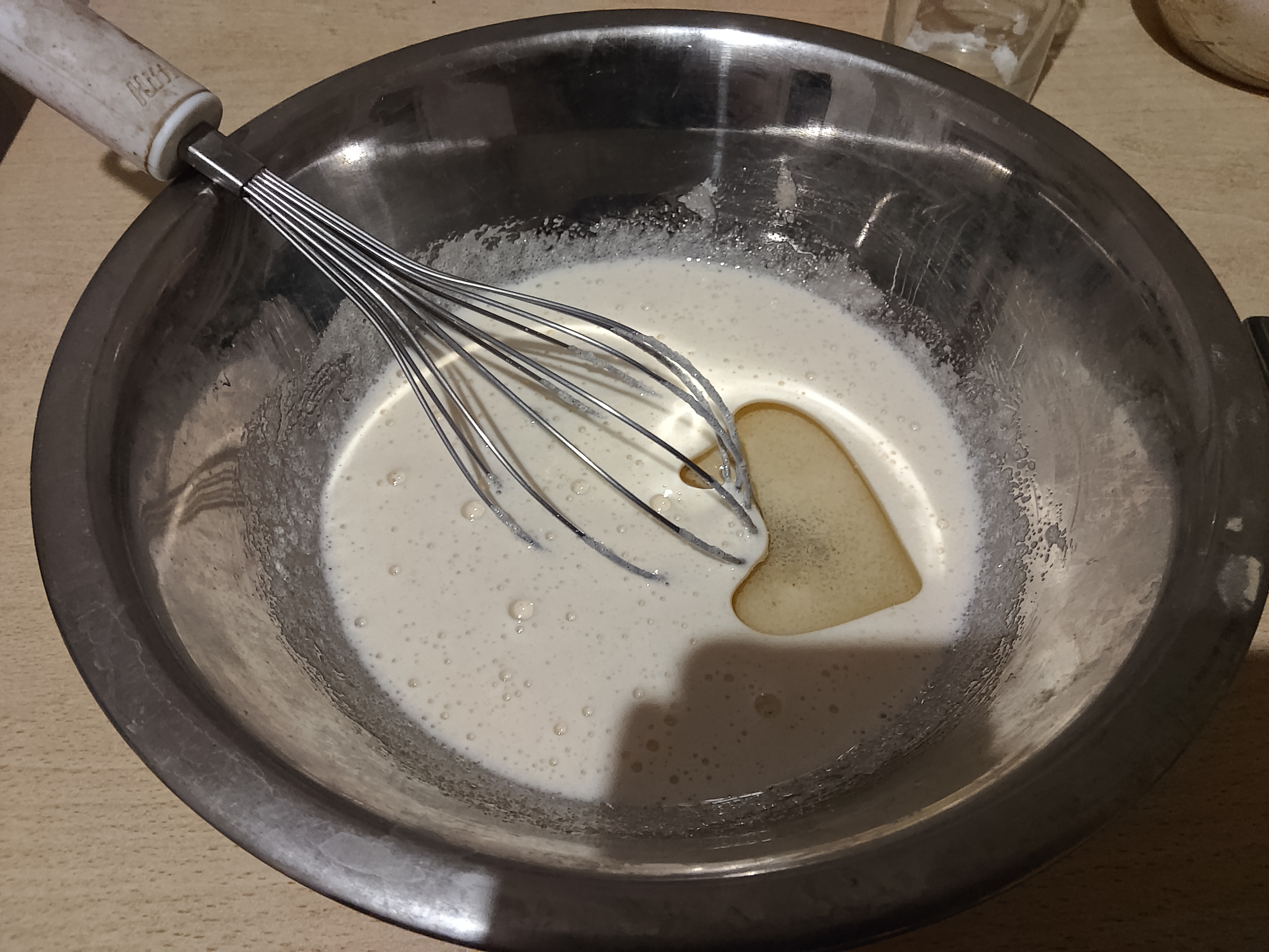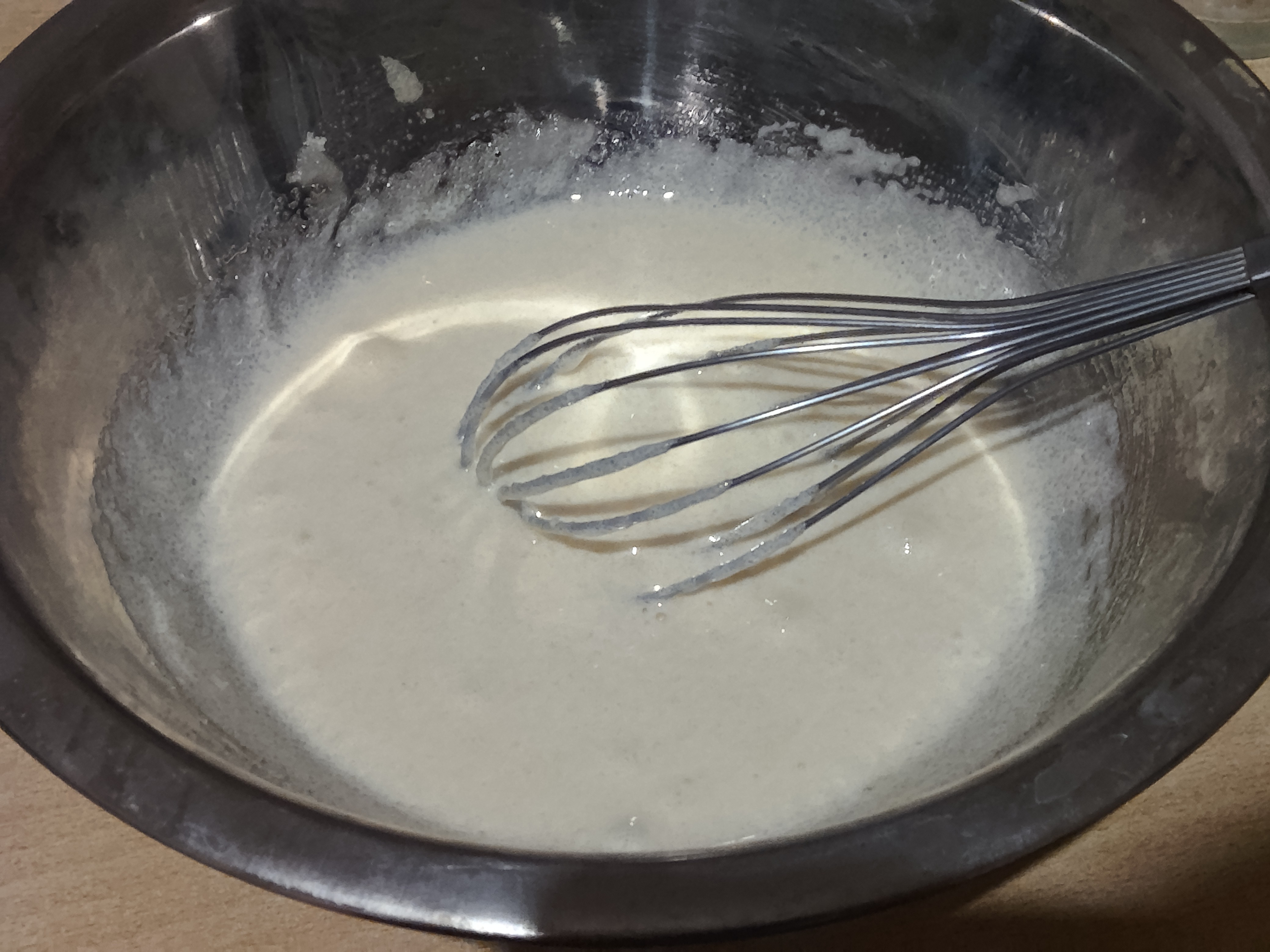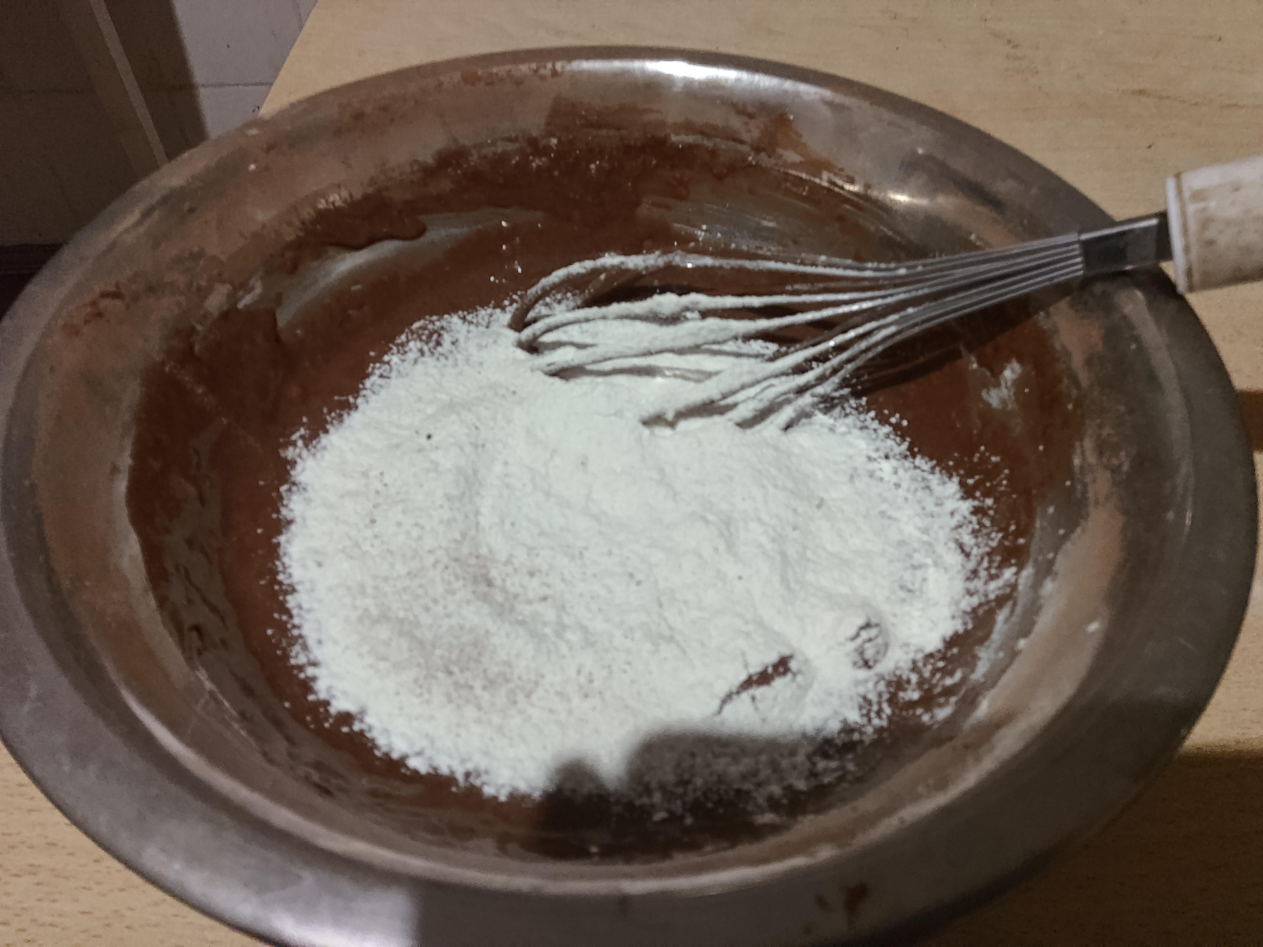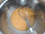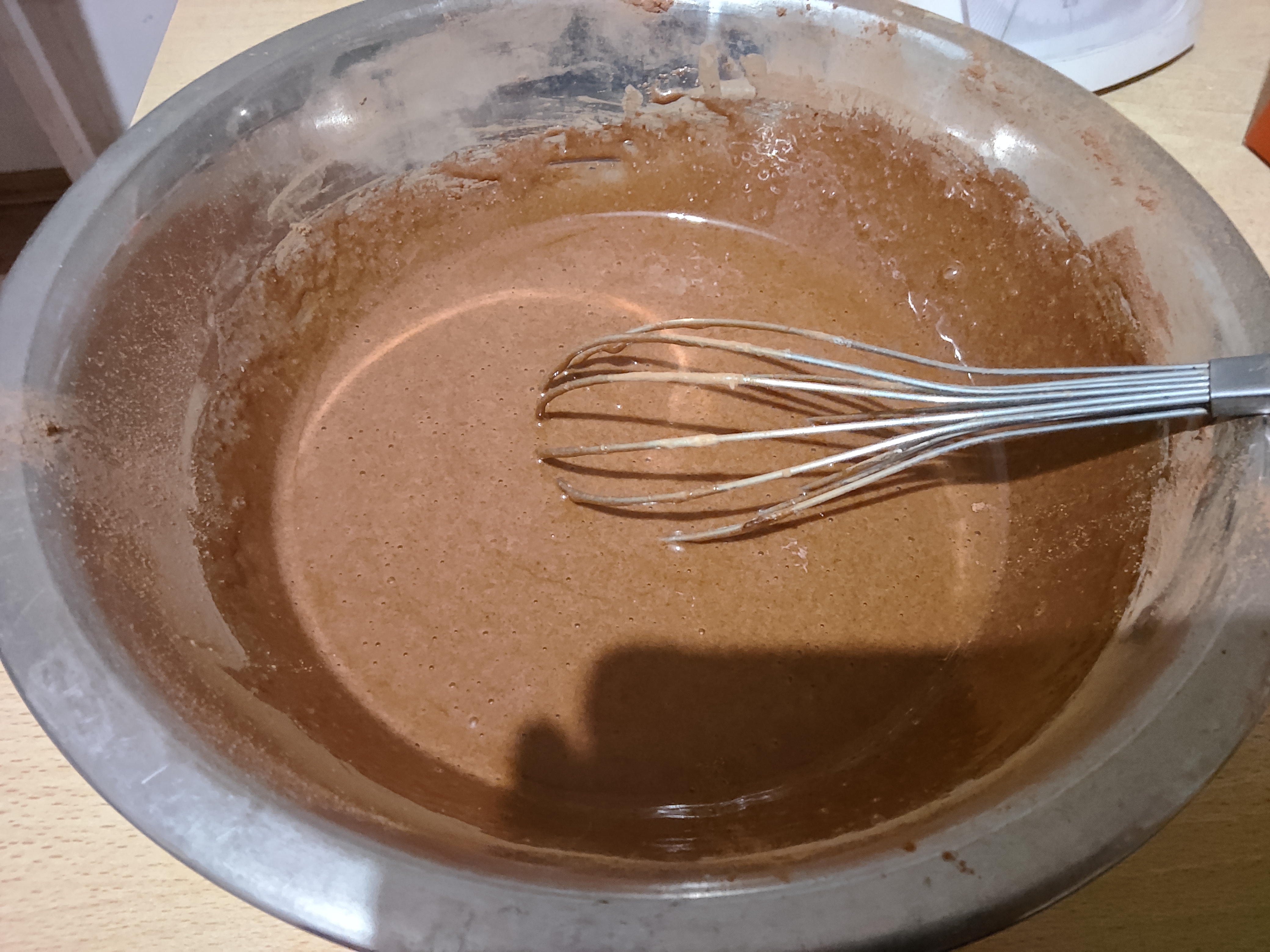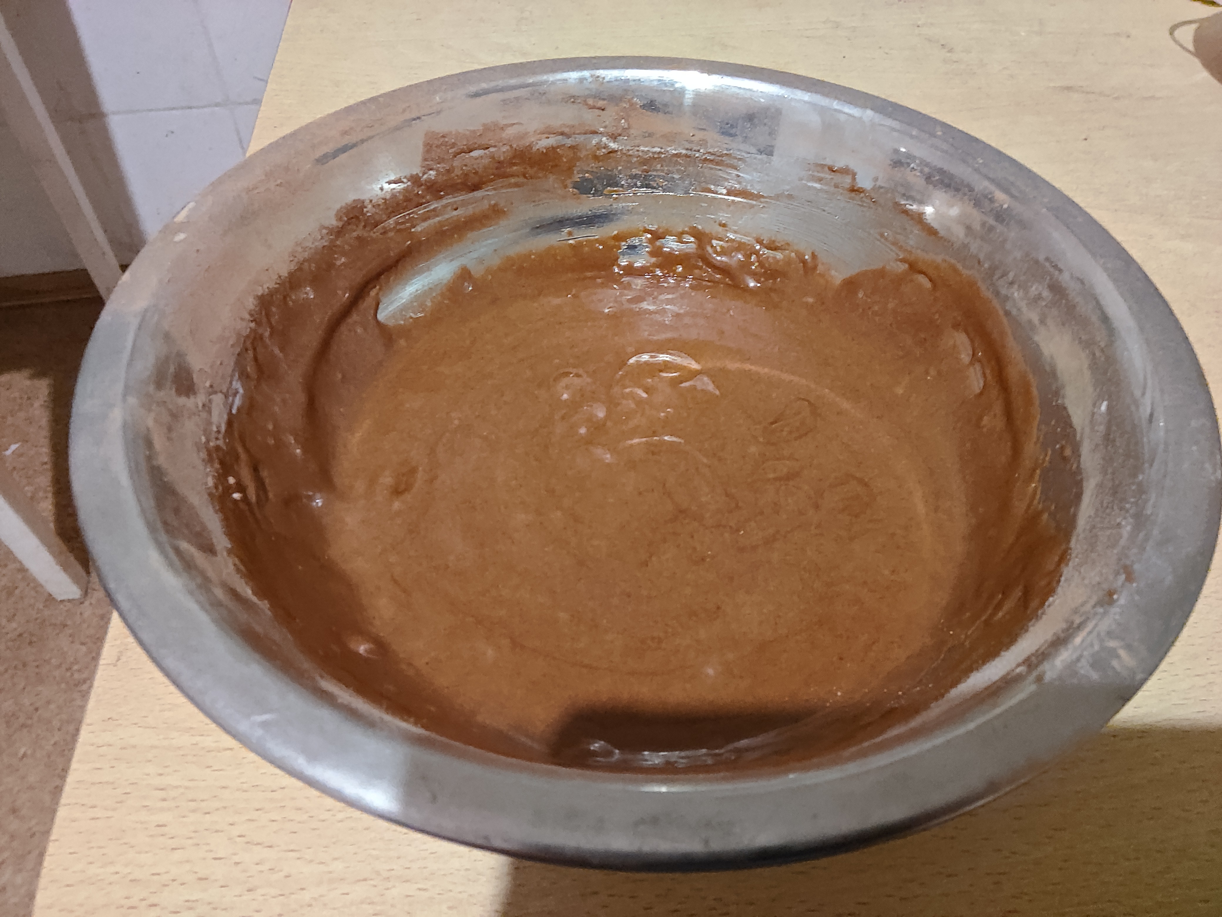 Шмурдяк после вливания молока и всыпания какавы, пока еще без муки и разрыхлителя. А еще я недосмотрел и перегрел духовку, надо было 180 а она уже порядка 220, скинул на минимум