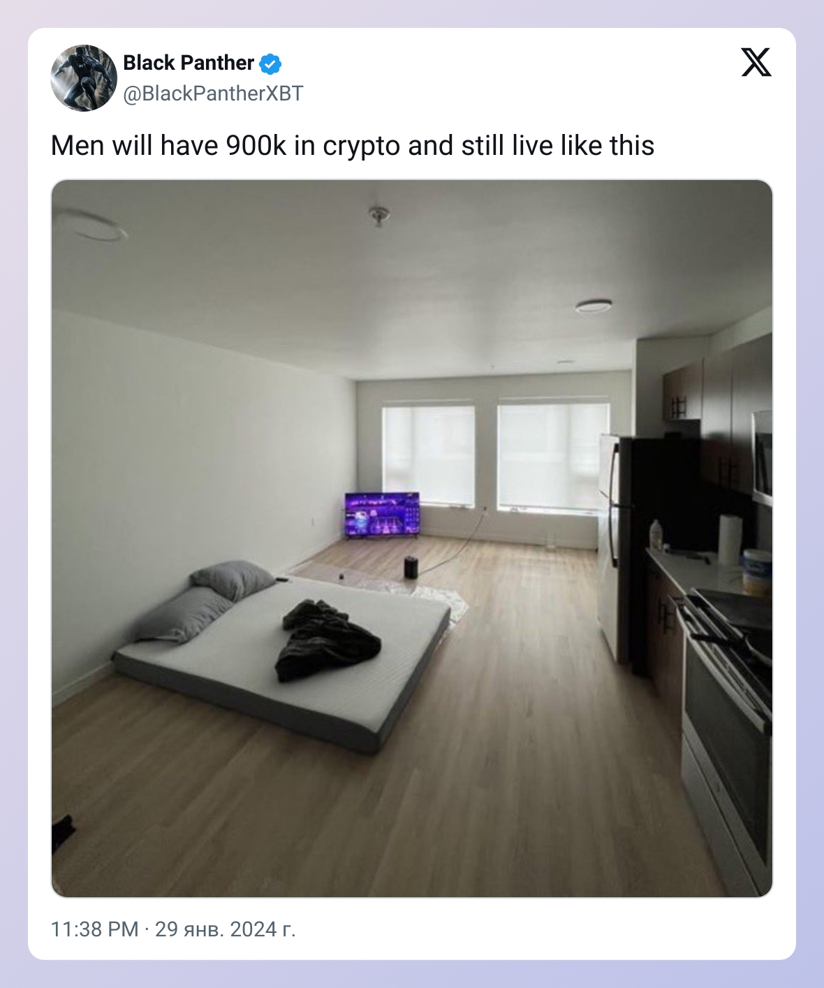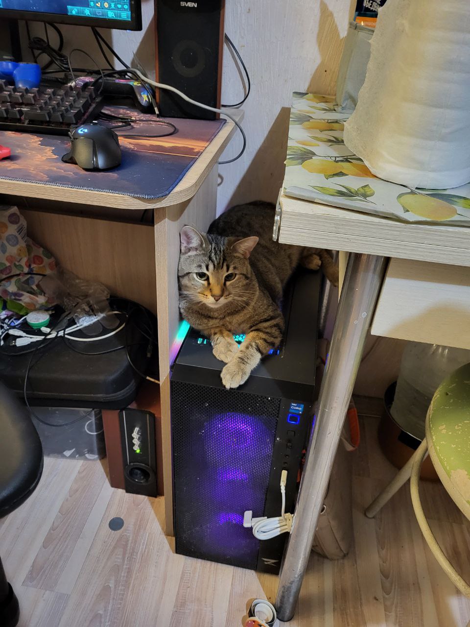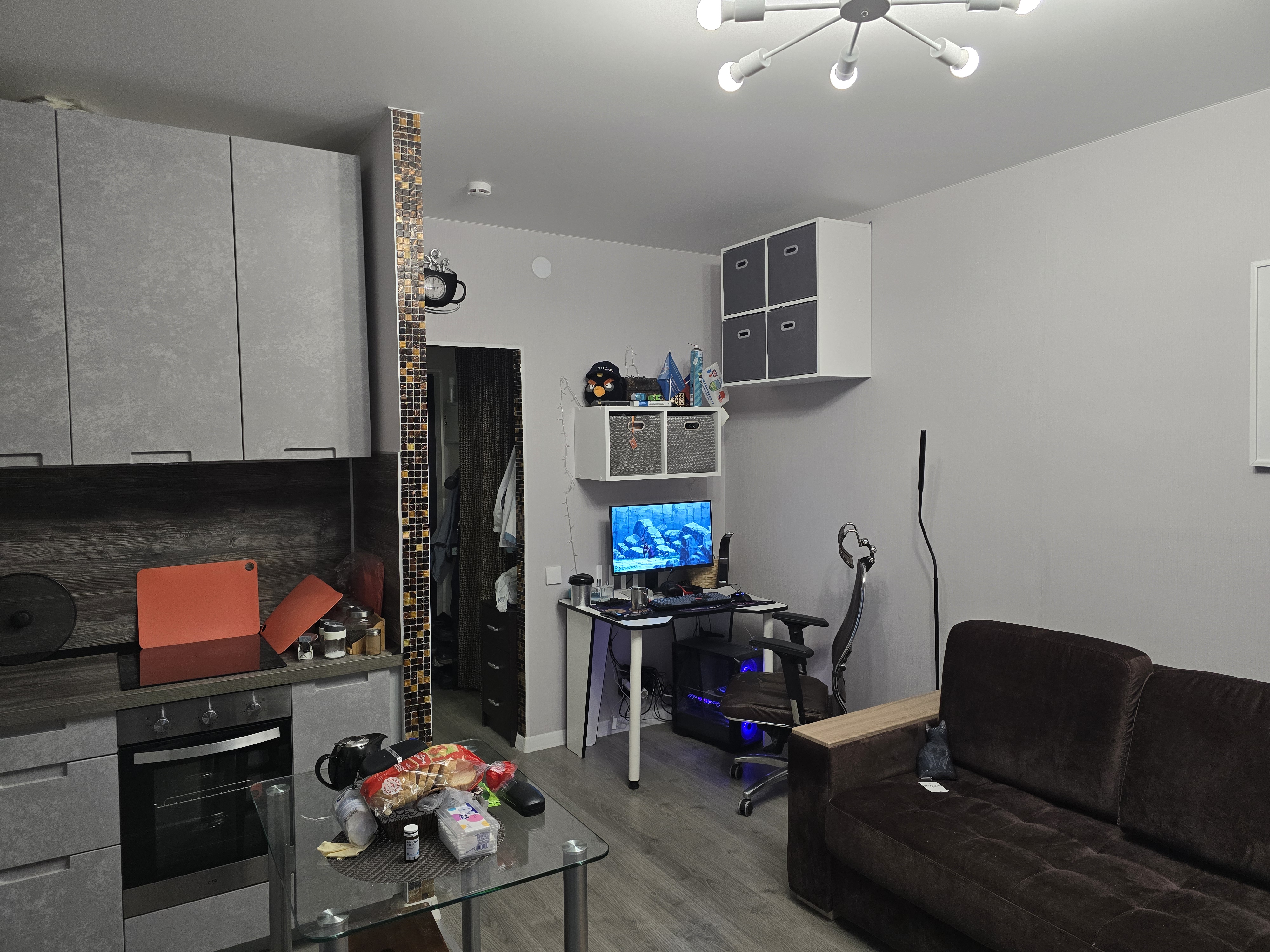 Комната: ПК. ТВ - в хорошие времена вьебал себе на 65 дюймов. В целом редко сижу, но заебовый тв для фильмов/консоли прям тема. И с какой-нибудь тянучкой/друзьями смотреть куда веселее. Увлажнитель - зимой страдаю от влажного воздуха. Лампа - вместо основного света. Не люблю когда ярко. Пылесос и робот пылесос. Кот постоянно раскидывает наполнитель и шерсть.