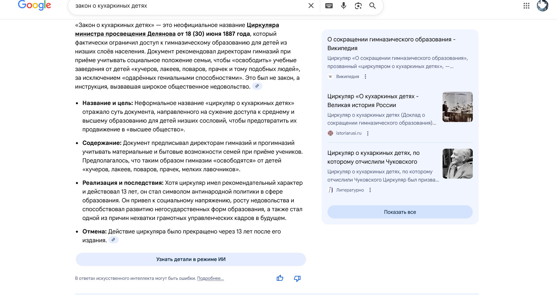 >По мнению историка Сергея Волкова, в долгосрочном плане циркуляр заявленной цели не достиг: с 1880 до 1898 года доля учащихся «низших» сословий возросла в университетах (с 25 % до 48 %) и мужских гимназиях (с 38 % до 43 %), а в женских составила 48,7 %. Также он отмечает, что, идея прямого запрета доступа в гимназии детям низших сословий была отвергнута непосредственно российским императором Александром III, и, считает что, сам факт желания оградить гимназии от «детей кучеров, лакеев, поваров, прачек, мелких лавочников» совершенно беспрецедентен для тогдашней Европы — в других европейских странах указанные категории населения, по мнению историка, и так не были представлены в престижных средних учебных заведениях в сколь-нибудь заметных количествах. Объяснения Чуковского Волков полагает несостоятельными: Чуковского исключили из гимназии через пять лет после издания циркуляра, хотя логичнее было просто не принять его в гимназию, когда циркуляр был ещё свеж. Он полагает, что из гимназии Чуковский был исключён, скорее всего, в связи с неуспеваемостью или неудовлетворительным поведением, а после Октябрьской революции он в конъюнктурных целях объяснял своё отчисление действием данного циркуляра[13].