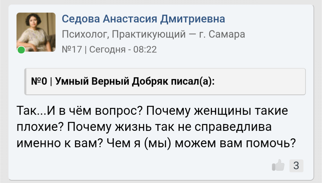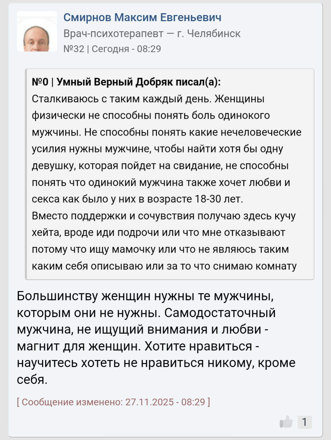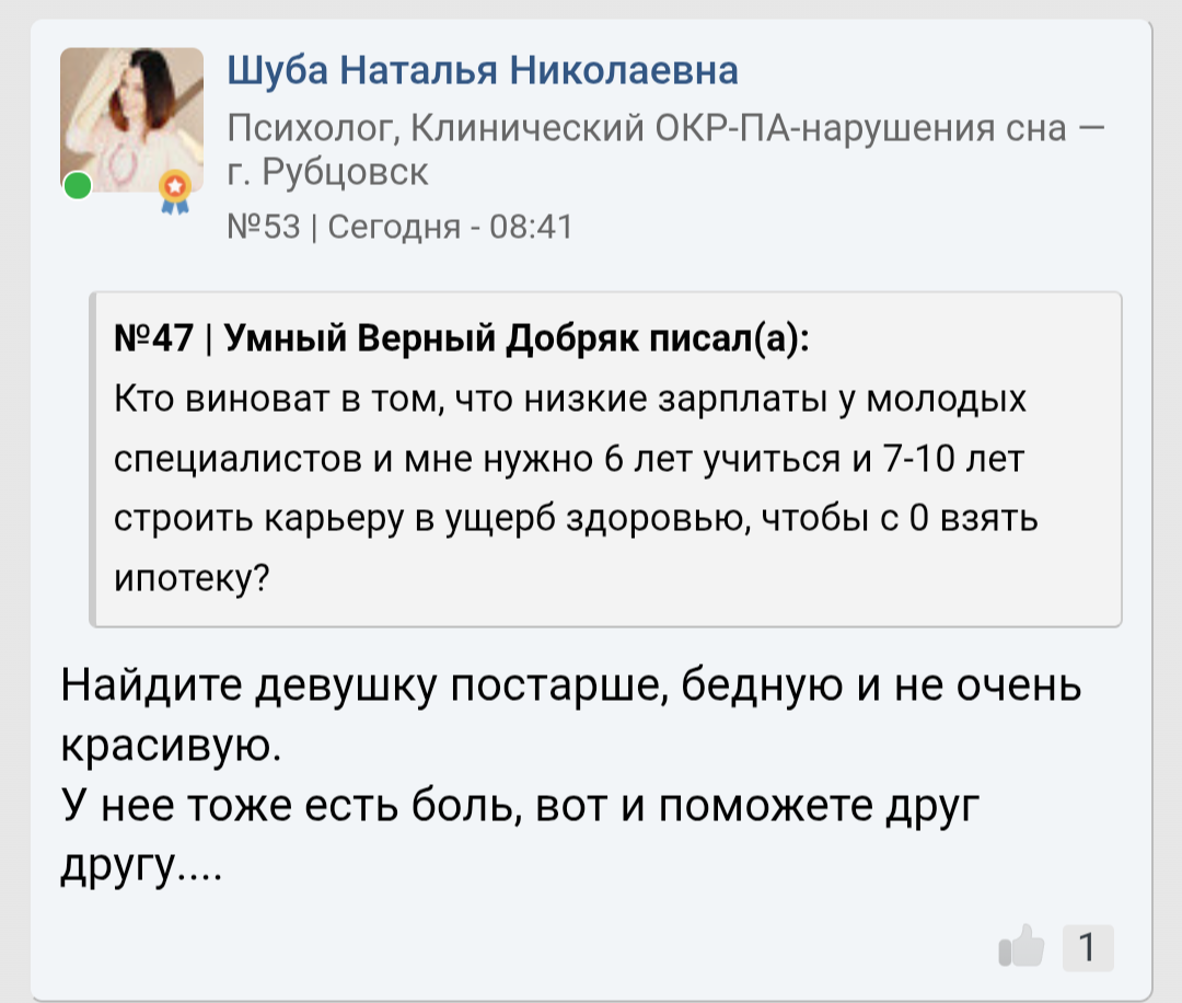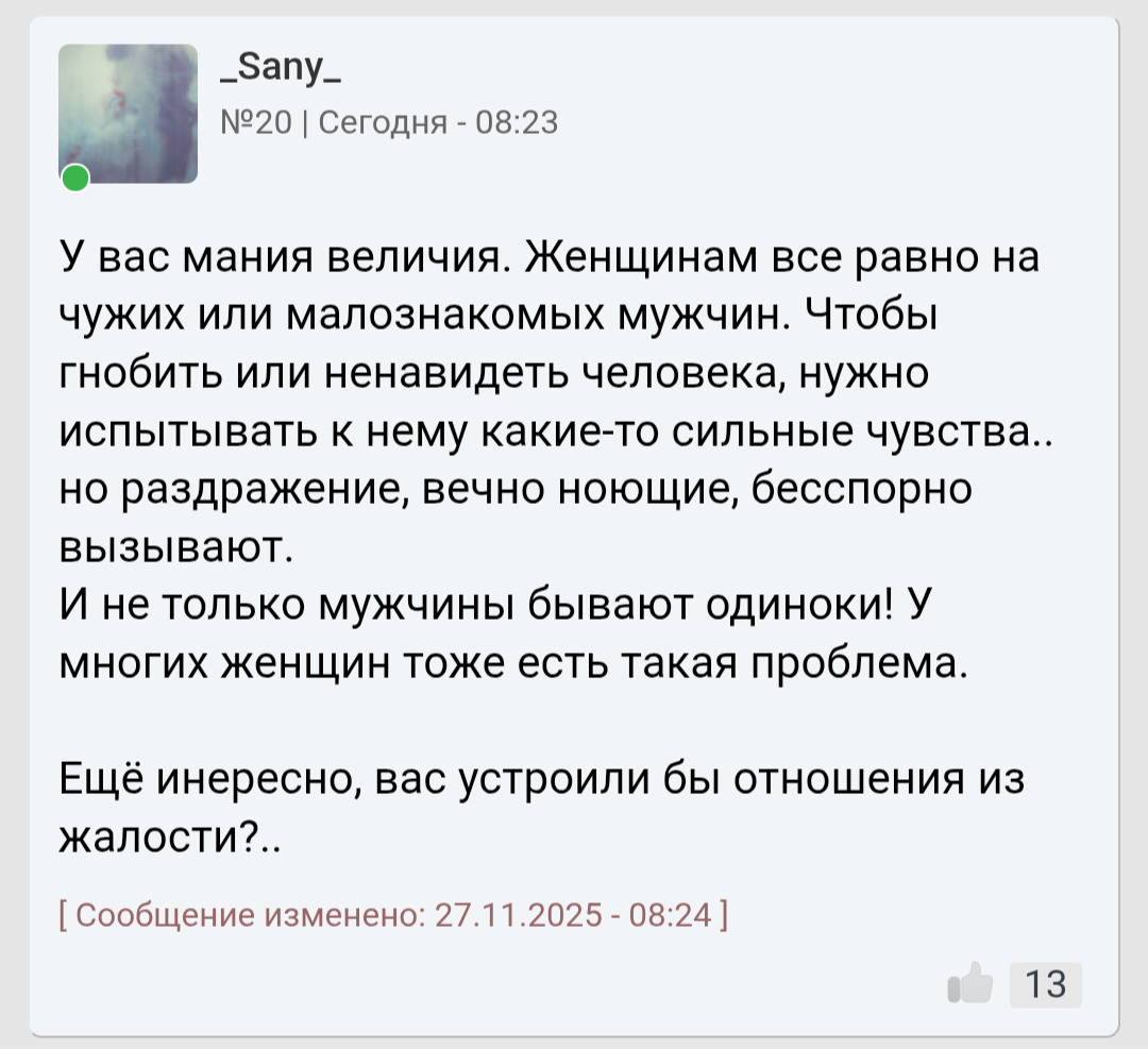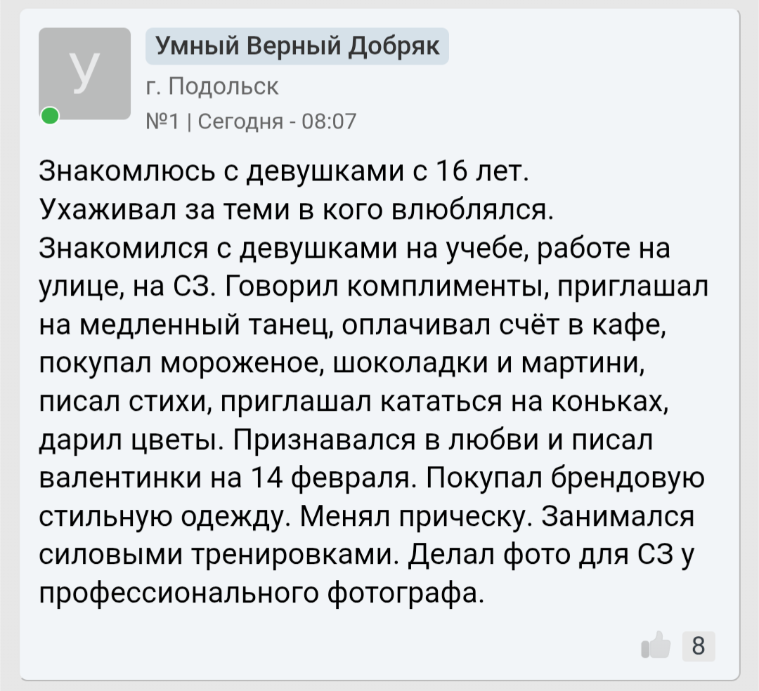 Ты наверное думаешь, что мы конвенционально красивых ждём, а от девушек попроще лицо воротим? Да чёрта с два! Я бы любую на руках носил, любую, если бы только она была открыта к общению со мной! Похуй, жирная, рябая, тупая, капризная, стервозная - до последнего бы старался найти в ней светлые качества. Но их просто не было, никаких. Ни ИРЛ, ни в универе, ни в /soc.