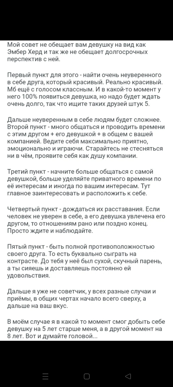 >>10438295 После гфе шлюхи( она была 3, а за всю дичь около 7 походов), у меня пропал депрясняк на месяц.То как она смотрела на меня и взаимодействовала со мной, как моя девушка, дало мне сил на несколько недель. Производительность повысилась раза в 3, мысли о суициде ушли, я все время улыбался и ходил на веселые. Так что да помогло бы, но мне кажется уже поздно в 30 лет. Такое нужно практиковать с молодости, а сейчас только временно поможет.