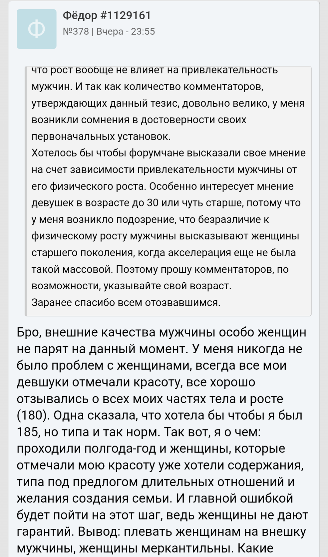 >>10438543 Видимо, только смириться. Это его единственный пост в новой теме мелкого анона. Остальные ему пишут, что рост не важен и достаточно быть выше 165