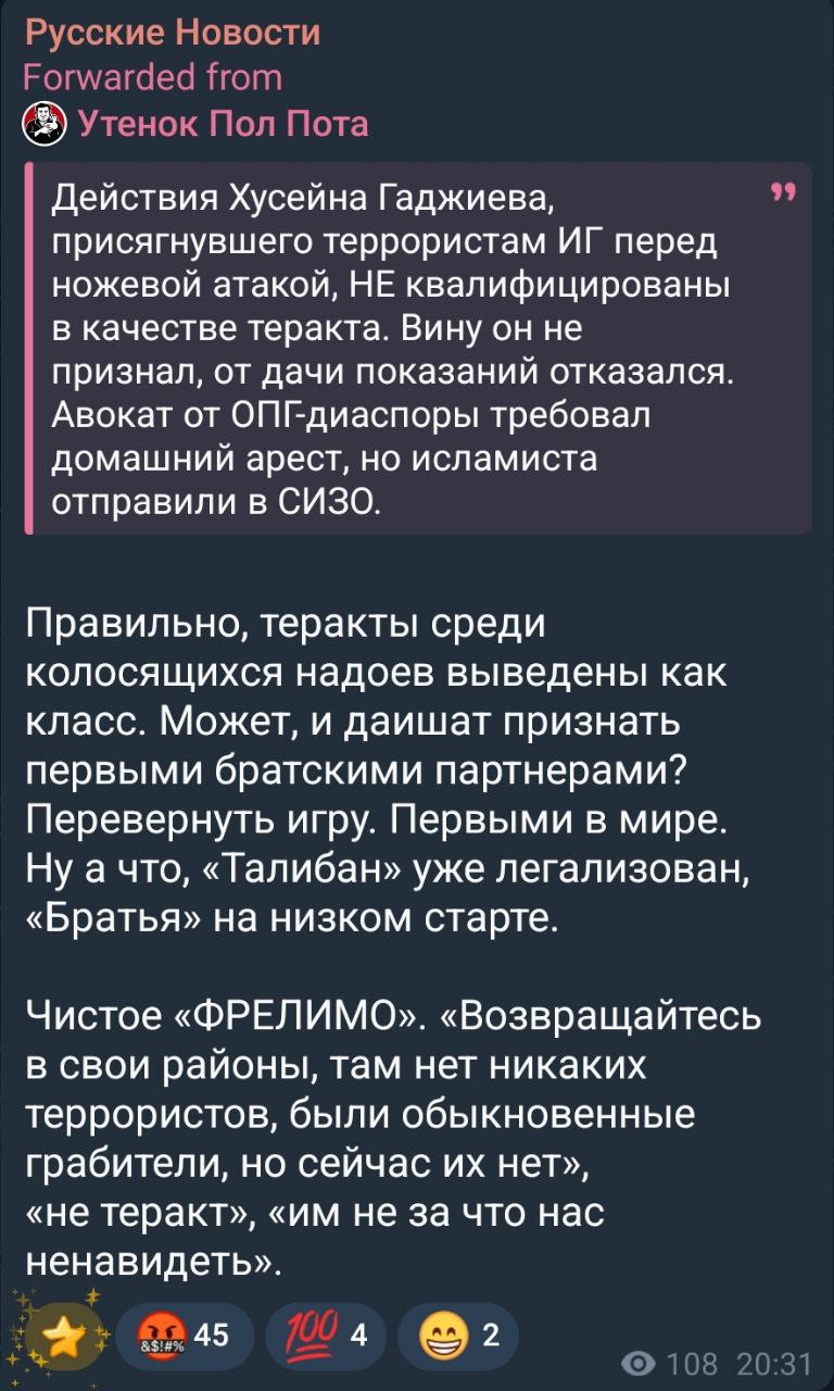 Но нет, всё равно НЕМС, пловный джамаат зарешал, па кайфу разрешили резать, потому что прокуратура видите ли проводит какие-то следственные мероприятия на тему причастности чурки к видеозаписи присяги гигилу.