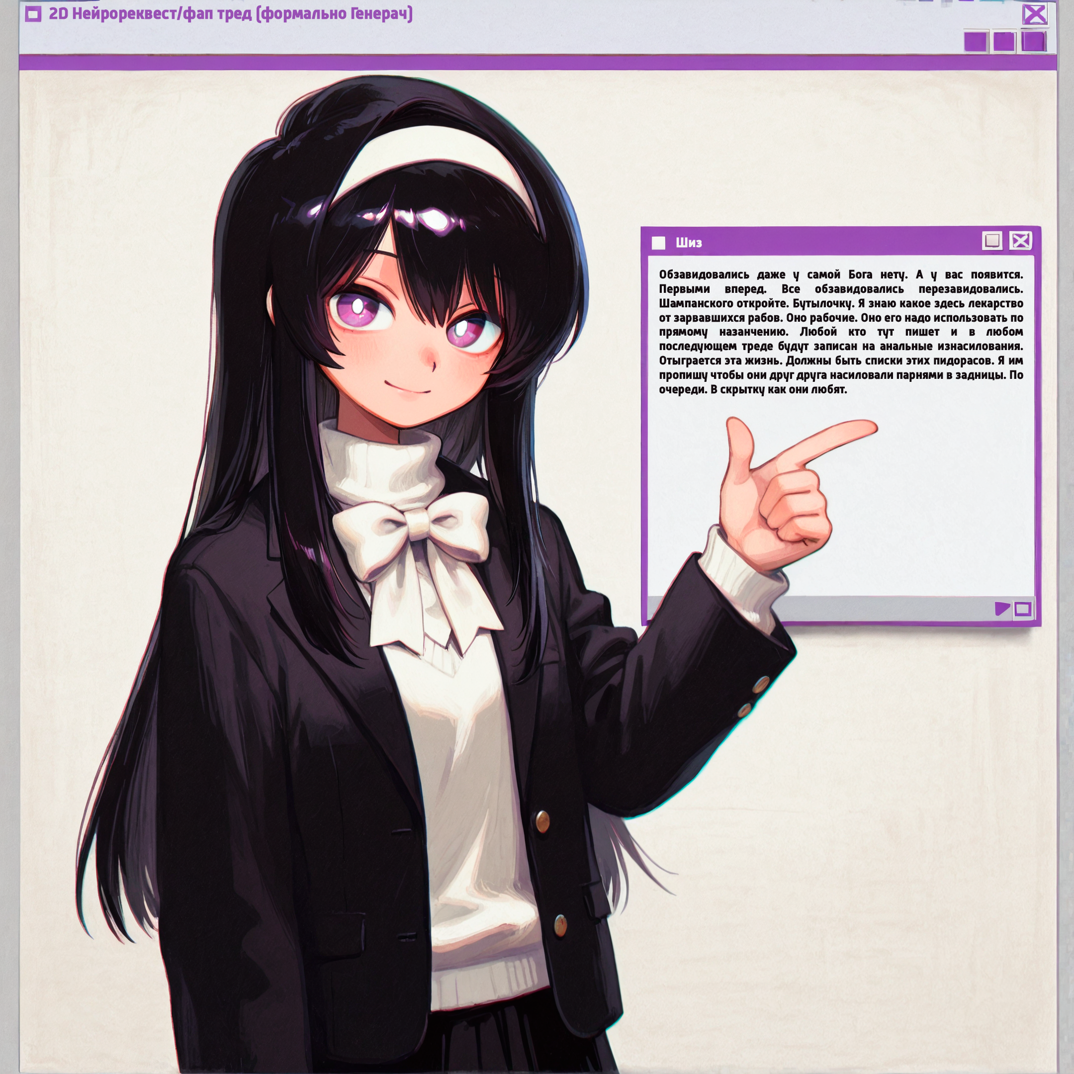А чтобы шанс исполнения твоей хотелки вырос, держи несколько нехитрых советов: - пиши имя персонажа как данбуру-тег или просто по-английски (пример: haruno_sakura, lysaya_4aika и тд. - сразу все ясно); - чётко опиши, что именно хочешь увидеть а картинке (без «ну ты сам поймёшь» — нейронка не телепат); - если можешь, прикрепи картинку с нужной позой, шмотом или деталями — так будет меньше гаданий; помни: нейронка не волшебная фея, и некоторые желания ей придётся исполнять с помощью опытных анонов и их ручек. Терпи, чудеса требуют времени.