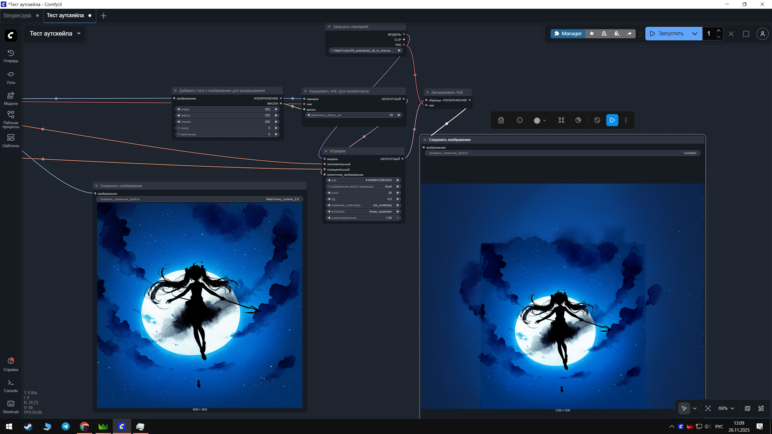 Здравствуйте. Вкатываюсь в Комфи. Как генерировать 1024х1024 уже +- понял, как апскейлить до х4 тоже. Но при попытке заставить нейронке расширить границы изображения выходит вот такая мазня в области увеличения. Что я делаю не так? Или широкоформатные изображения получаются иным методом?