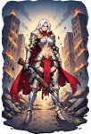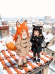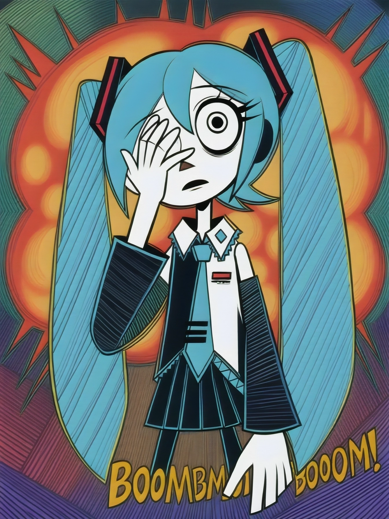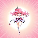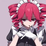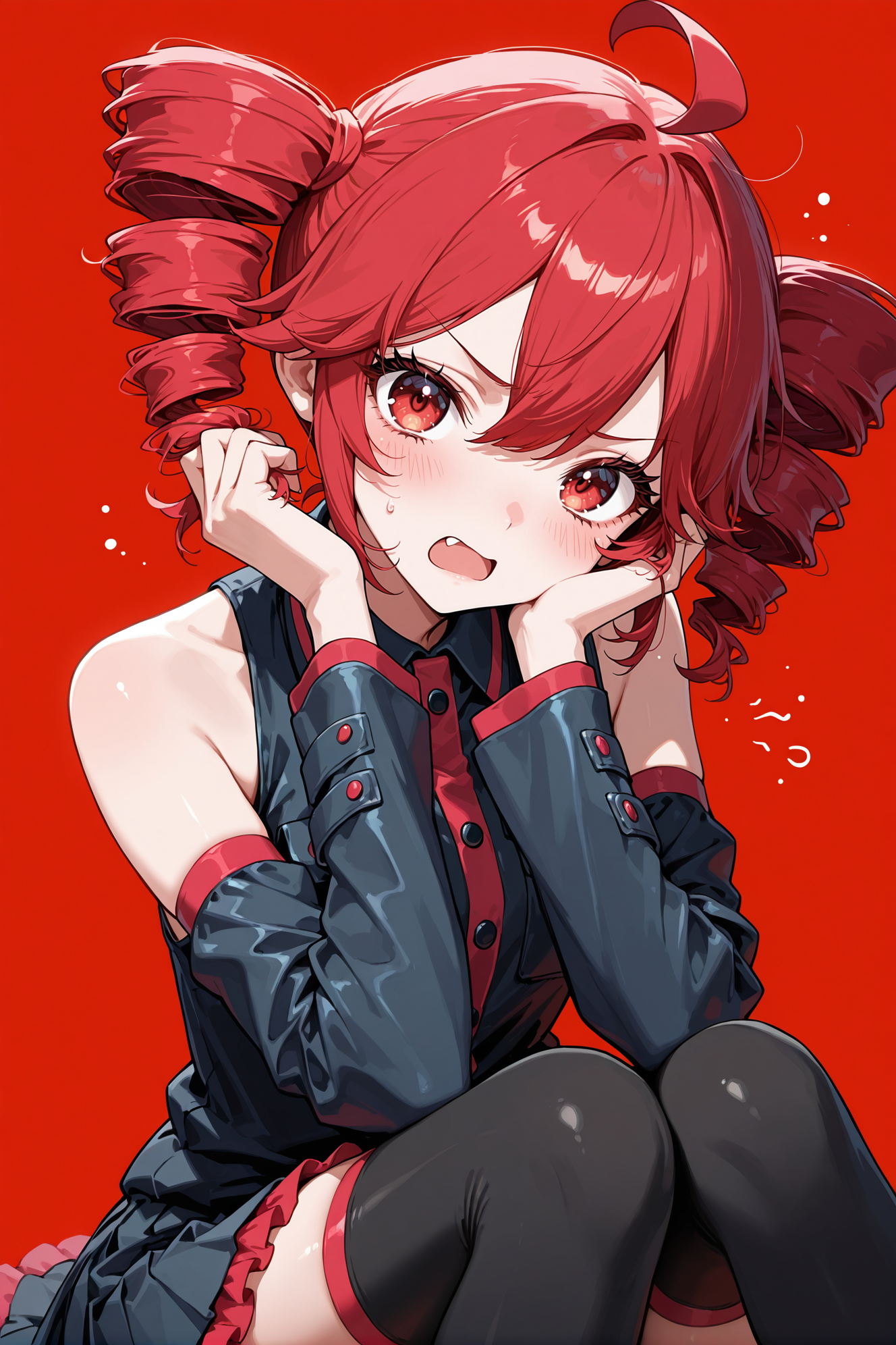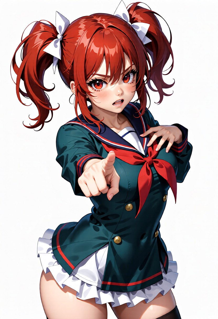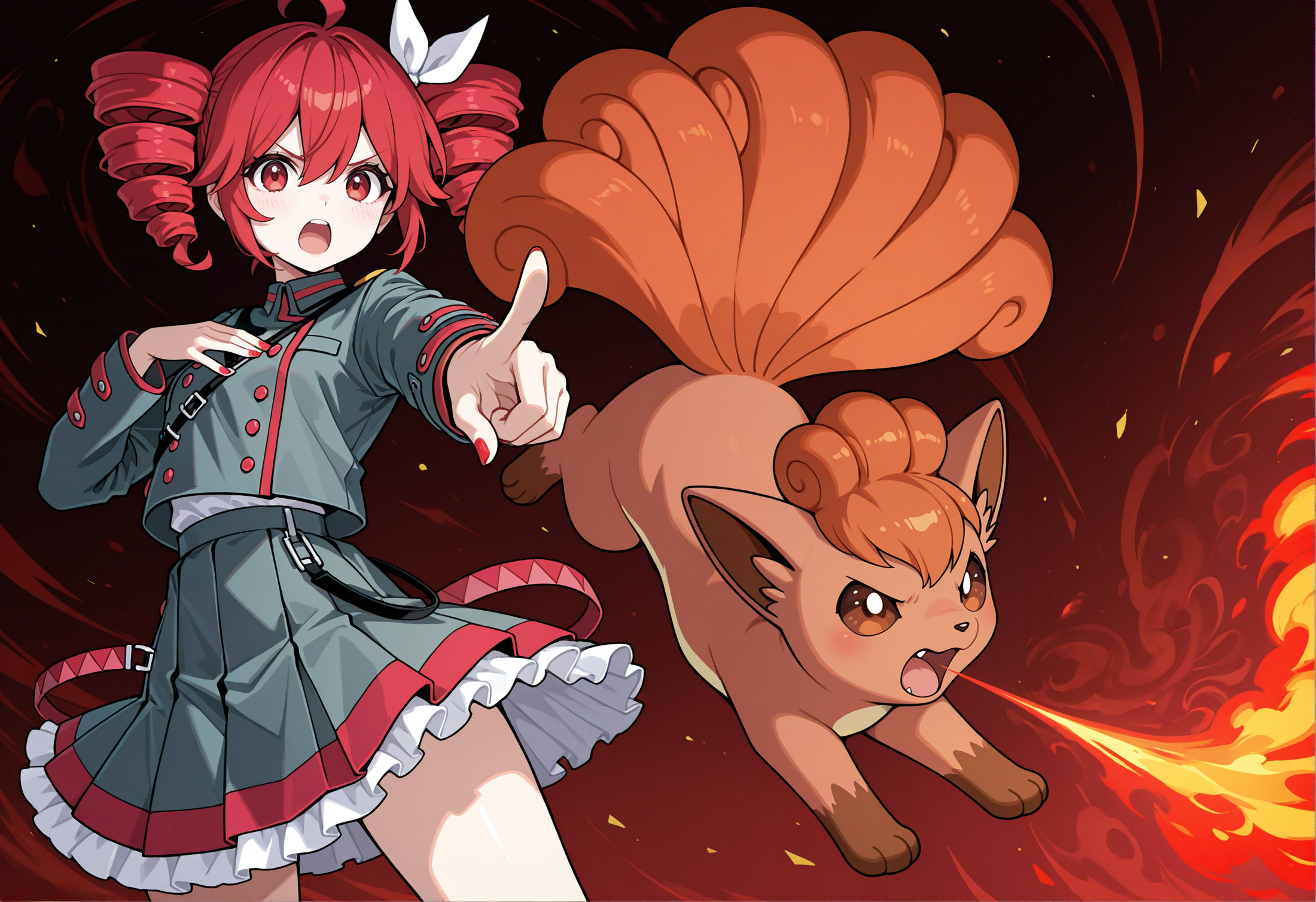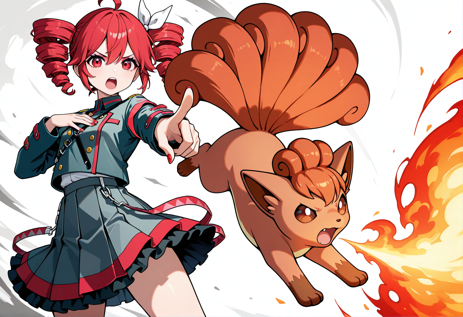 Posivite Promt: masterpiece, best quality, very aesthetic, absurdres, newest, highres, 4k, rich colors, face focus, lineart, 1girl, kasane teto, drill hair, gray double-breasted, gray skirt, twin drills, red eyes, red hair, hand on own chest, buttons, looking at viewer, standing, belt, ahoge, socks, frills, nail polish, ribbon, cross-laced footwear, hair ribbon, red nails, frilled skirt, pleated skirt, command, obey, open mouth, cowboy shot, attack, angry, pointing, pokemon, vulpix, solo, attack, abstract background, breathing fire, small creature, tail, (cute: 1.5)