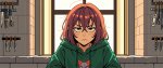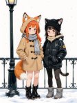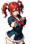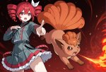 Из джойкопшен в квине. This is an anime-style digital illustration featuring a young girl with red twin pigtails adorned with white bows, fair skin, and large expressive red eyes. She is dressed in a dark teal school uniform with red accents and a white frilled skirt. Her expression is determined and intense, with her mouth slightly open, showing white teeth. She has her right hand pointing forward with a firm grip, while her left hand is positioned near her chest. Beside her, a dynamic, fox-like Pokémon with orange-red fur, large fluffy tails, and pointed ears is mid-leap, breathing a bright red-orange flame from its mouth. The Pokémon's fiery breath illuminates the surrounding area, adding intensity and movement to the scene. The background is a gradient of dark red to black, which enhances the contrast and focus on the characters. The girl's uniform has red buttons and trim, and her skirt has a white frill at the bottom. The Pokémon's fur is detailed with visible shading and texture, and its eyes are wide open with a fierce expression. Overall, the illustration uses bold lines and vibrant colors typical of anime art, with a strong emphasis on action and energy. The composition is dynamic, drawing the viewer's attention to the interaction between the girl and the Pokémon. The artist's style emphasizes dramatic expressions and dynamic poses, characteristic of anime illustrations.