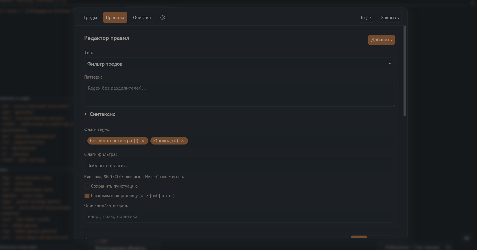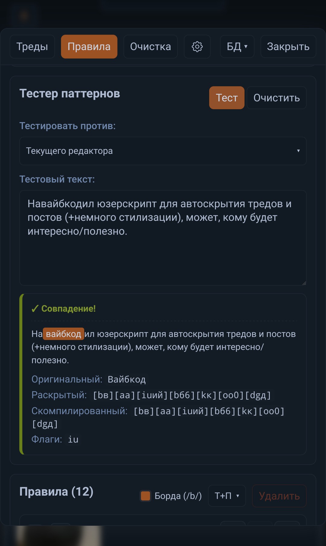 >>327063549 Случайно как-то вышло - увидел тут тред анона со скриптом на 200 строк для автоскрытие увиденных тредов, понравился, добавил регекс, потом ещё немного, и т.д.