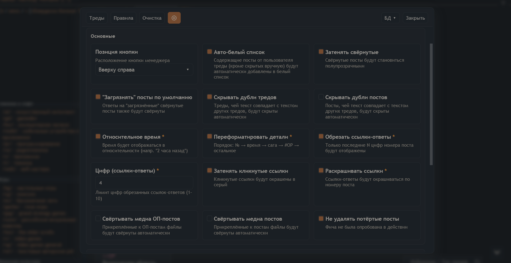 Процесс установки: -поставить tampermonkey (на мобилках доступен в лисобраузере) -добавить туда данный скрипт -импортировать musor-lite из репы через дропдаун "БД" -осознать, что на самом деле борду спасет только тотальный нюкнум всех серверов навсегда