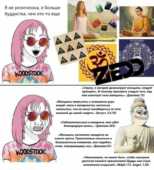 Поэтому тупая пизда с пика просто выбирает наименее мизогинную школу типа Японского буддизма или надрачивает на праджню и.... Всё, ю обосрался.