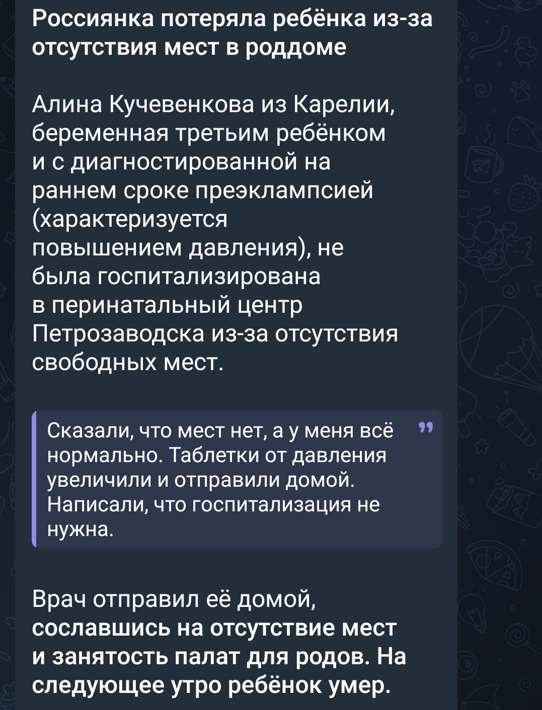 а русская алина из карелии пошла домой и потеряла ребенка.