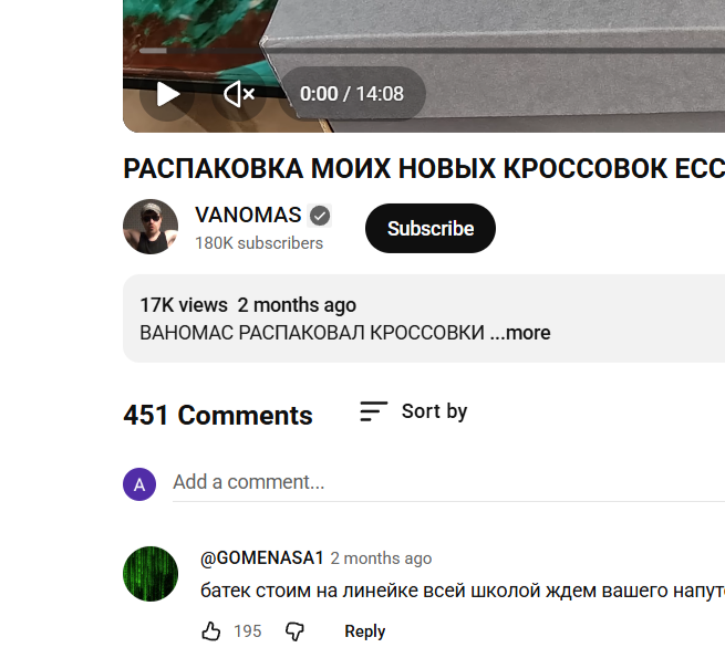 >>327068272 >>327068402 Чтобы ты понял где ещё можно увидеть 500 комментариев. Например на видосе в 17к просмотров, где ваномас распаковывает кроссовки. Как ты думаешь Вано донатят 7.5 лямов в месяц? Чисто так оценить можешь? На глазок.