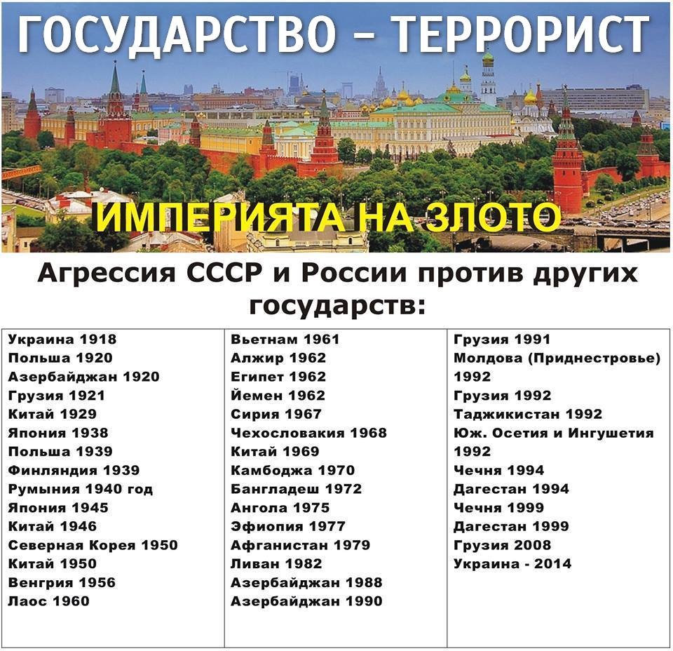 >Польша поделили между германией и россией и поляки обиделись - хотели в полном составе под гитлера лечь >Финка подарили кусок земли русской за то что ильича от царя укрывали - думали дружить будем, но эти пидарасы вместо дружбы стали линию обороны строить и к войне готовиться, было сделано 100500 последних предупреждений - как об стенку горох, пришлось отодвинуть буйных как раньше было если в мире жить не хотят >Венгрия задушили фашизм котроый хотел поднять голову >Афган что бы там не было американских баз >Грузия абхазия >Украха буферная зона свободная от размещения американских ракет которые спутниками маска по россии наводят