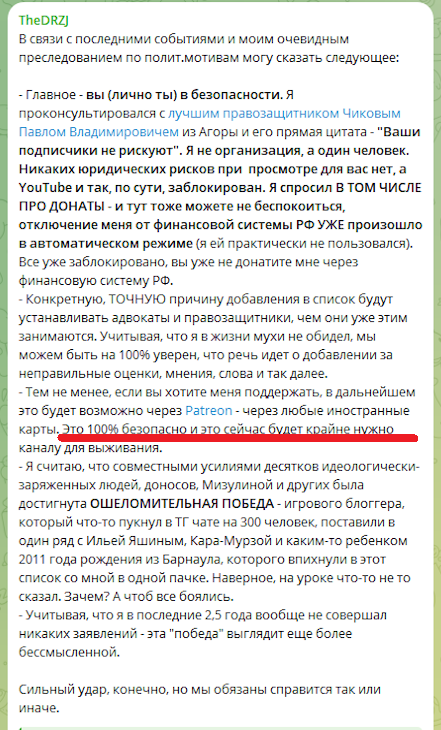 Ранее на TheDRZ пожаловалась глава «Лиги безопасного интернета» Екатерина Мизулина. Она заявила, что DRZ после начала «СВО» якобы рекламировал сборы на ВСУ, а также оправдывал теракт на Крымском мосту.
