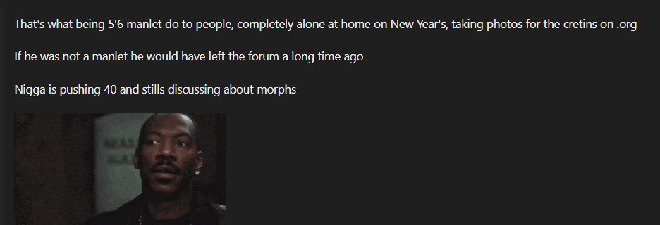 Да кстати - перед сном так сказать блекпилла в ленту. Чел завсегдатай looksmax org потратил годы на луксмакс, но по итогу всё равно вынужден фраудить (надевать гигапынеходы) из за роста 167-170. То есть даже имея топ тир ебало ты всё равно будешь по большей части сосать. А ещё та же пустота в глазах как у меня, только я ни копейки не потратил при этом. Ладно, до завтра. К