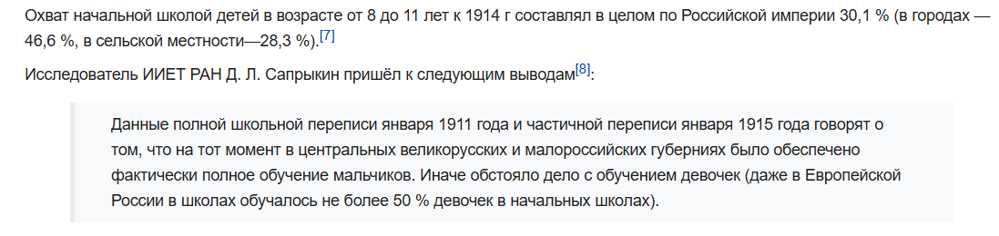 >>61323983 >Откуда вообще совки берут эту цифру в 80 процентов? Из маняфантазий коммиблядей, естественно. Даже по переписям, грамотных в Российской Империи было как раз 80 процентов. Молодёжи, конечно. Потом эти 80 процентов выросли, а старики помирали. Так получился успешный ЛИКБЕЗ. А нам затирают, что в Царепараше не было школ.