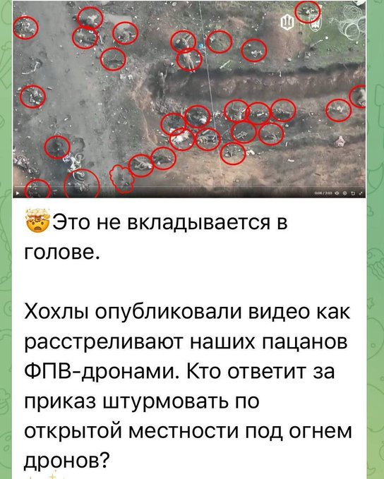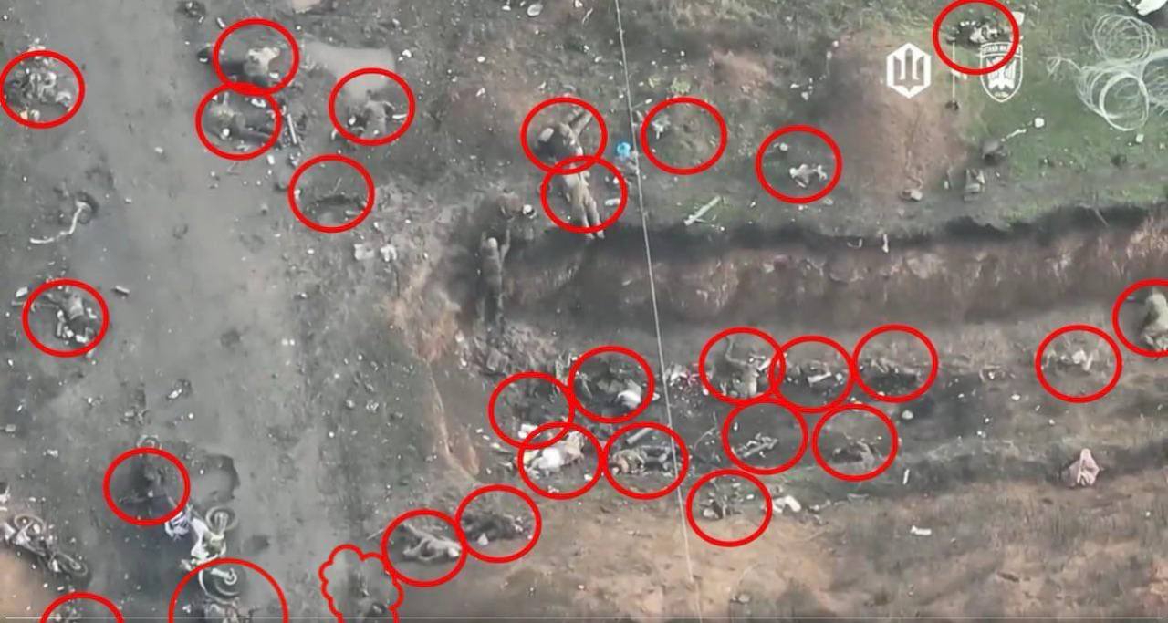 >>327237016 >Вот тут на одной картинке с дрона десятки тел. В половине обведенных кружков нет тел. Принадлежность тел непонятна. Если это опорник, который только что штурманули, это тела оборонявших опорник солдат ВСУ.