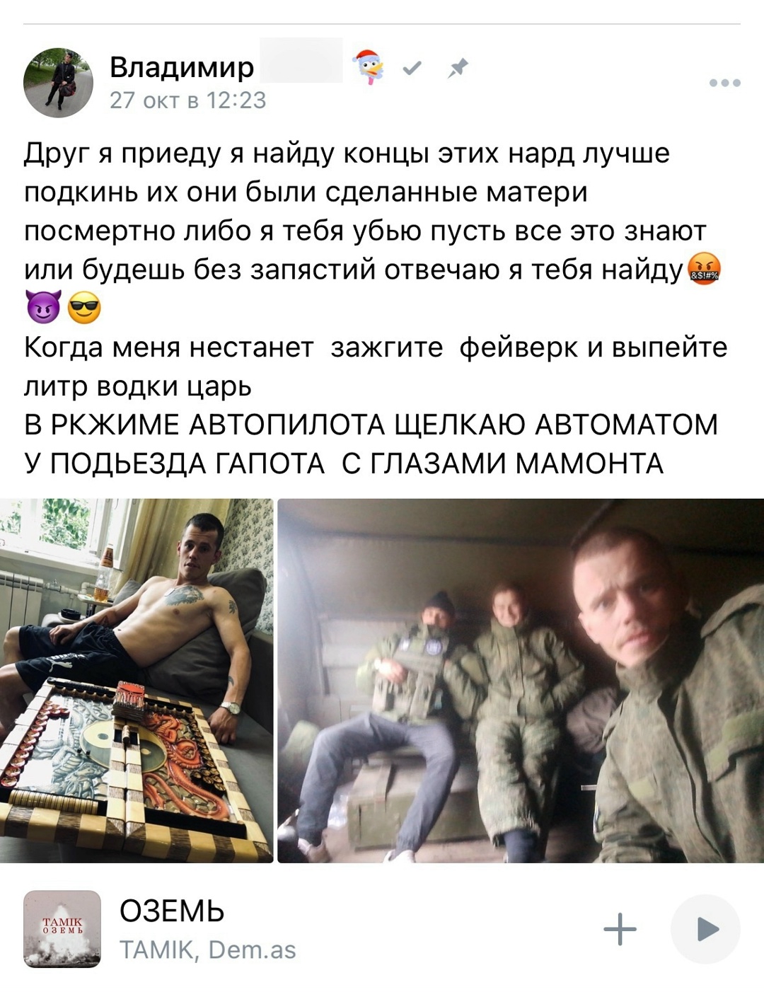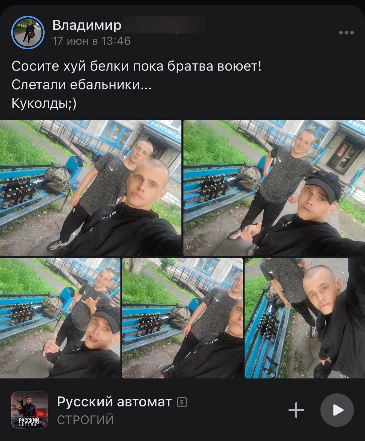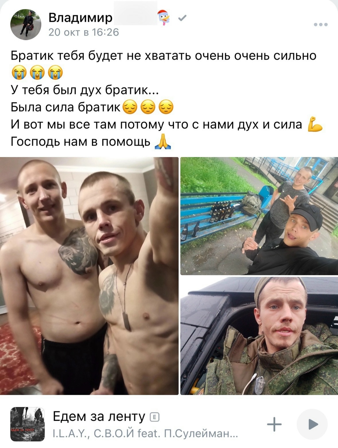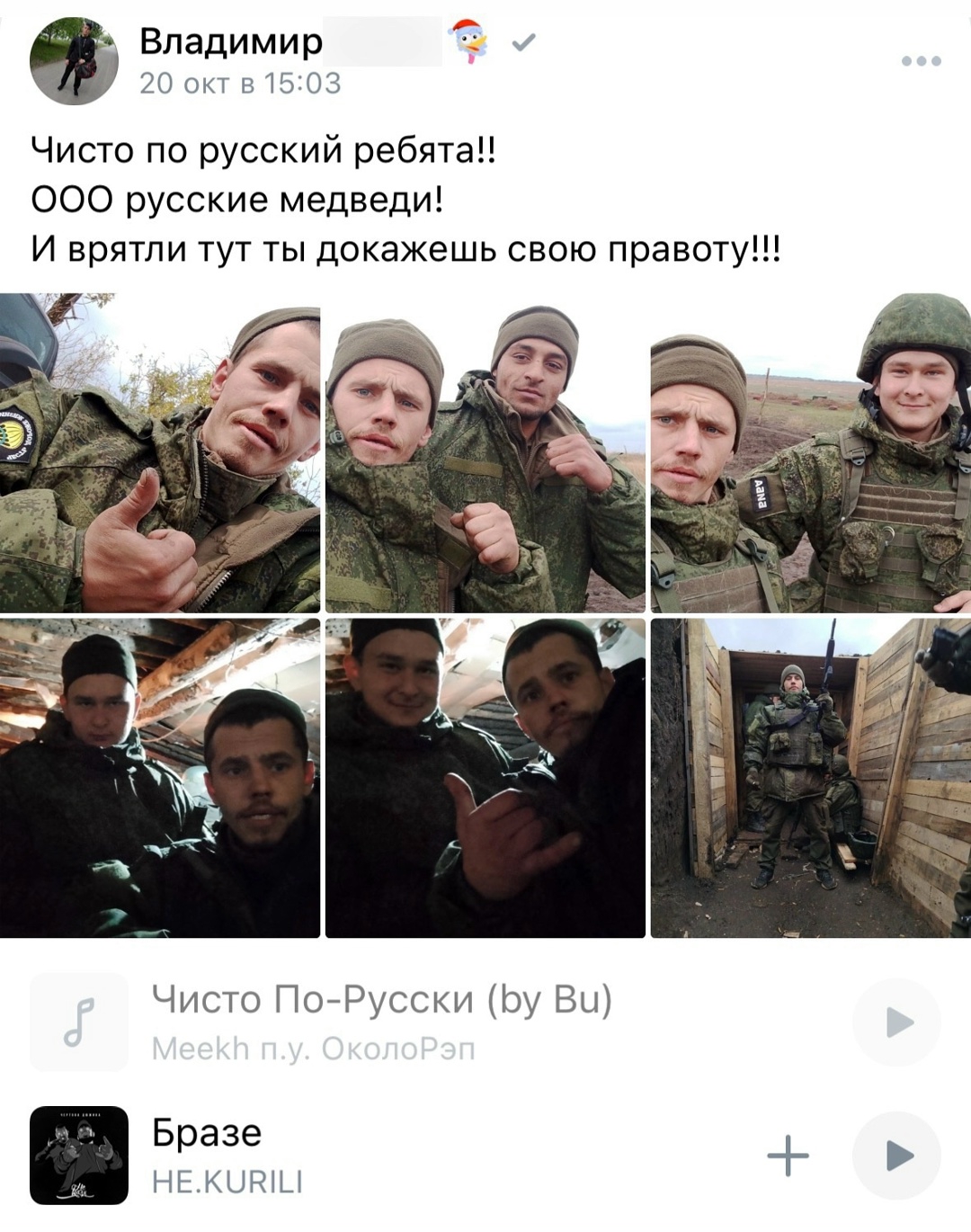 >>327231090 (OP)>>327231127>>327231159 Что сказать-то хотел? То что они выглядят быдловато? Так такие как ты клавиатурщики сидят трясутся, пока вот такие ребята воюют, а интеллигенция вообще предала Родину и убежала за границу. Так что завидуй парням молча.