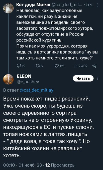 пиздец, а когда болгаре в интернете восхищаются россией, то трансхохлы сразу начинают визжать про ноунейм комментаторов и их репостинг. а тут 50+ постов с визгами про рашка фсее и верiмо. короче, желаю разъеб трупов укродетей, вытиранов всу и прочих 80 iq свиней. тьфу, бля.