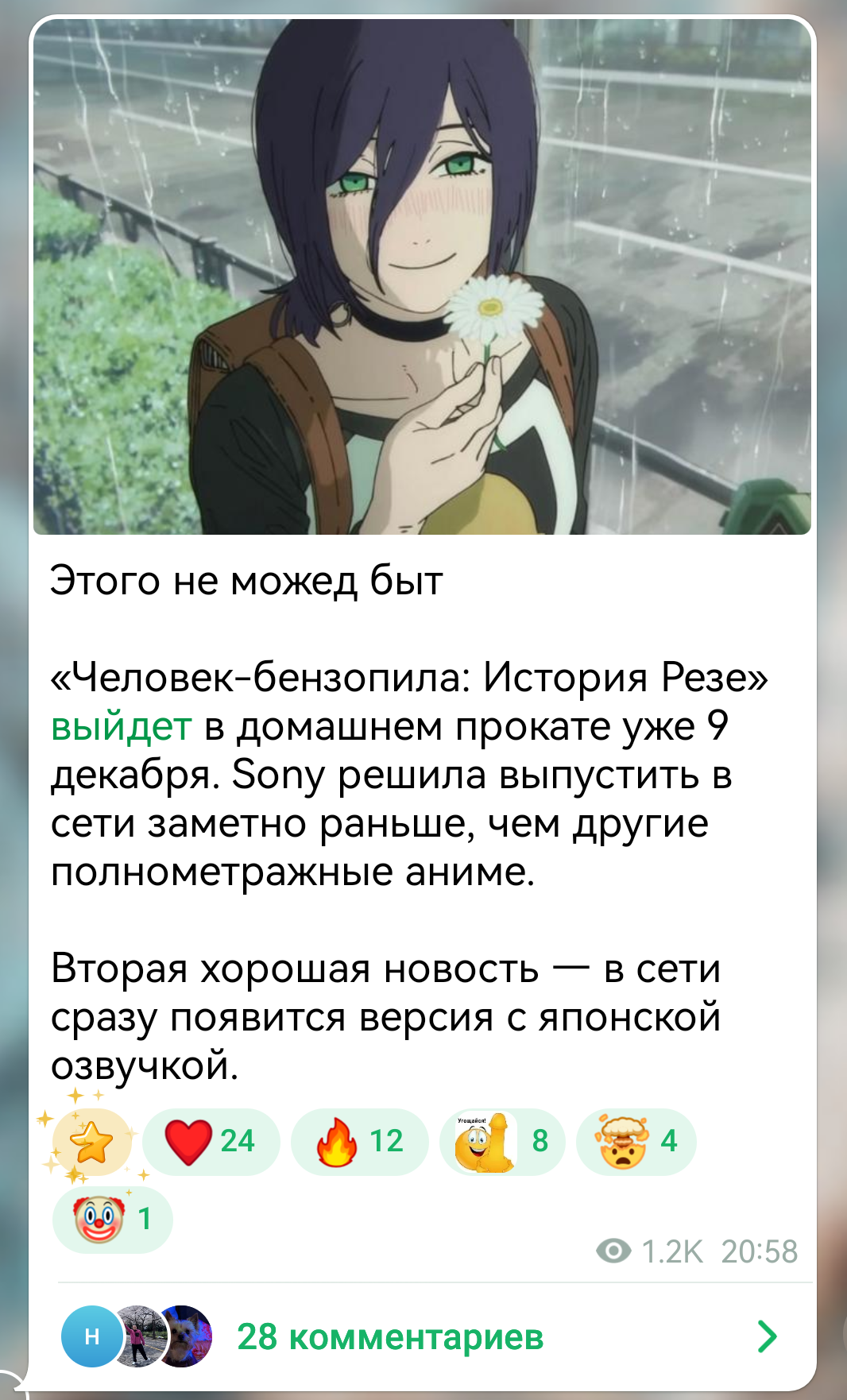 Тока приехал с киносеанса Смотрел бензопилу:резе Взял с собой камбучу, попробовать заодно, читал типа вот этот что именно этот типа энергетика По факту хуета полная, даже не допил И хз изза него или нет но меня так в сон бросало первые минут 20-30, ппц думал усну Еще аниме так натяжно шло, медленно очень Но потом начался экшен и сон как рукой сняло Короче эта полнометражка наебка гоев на деньги Это тупо одна-две серии сериала которую зачем-то выпустили отдельным метром. Так тупо. Весь фильм по сути это одна драчка бомбы с пилой И бомбу сделали чересчур имбой Она пиздец сильная, просто ощущение будто сильнее ее никого нет И победили ее просто потому что кино надо заканчивать, хуй бы денджи ее одолел, она слишком сильна Поэтому я даже не понимаю если бомба была такой сильной то демон огнестрела вообще будет неубиваемым? Пиздец какойто, и как его убивать тогда??