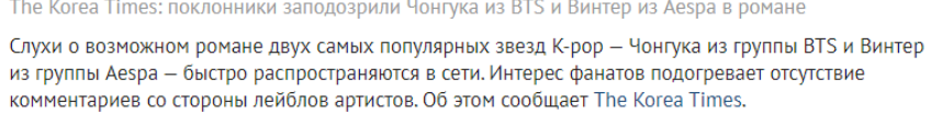 Я считаю Чонгук не встречается с Винтер и вот почему: все доказательства их встречи основываются на похожих вещях, одинаковые шорты, ногти, тапки и т.п., но бля как часто возлюбленные подражают друг другу? Взять других айдолов которые встречались, разве они копировали друг друга? Нет. Ну и тут все крайне натянуто за уши на основе одинаковых вкусов. Ничего что Винтер может биасить Чингачкука или наоборот.