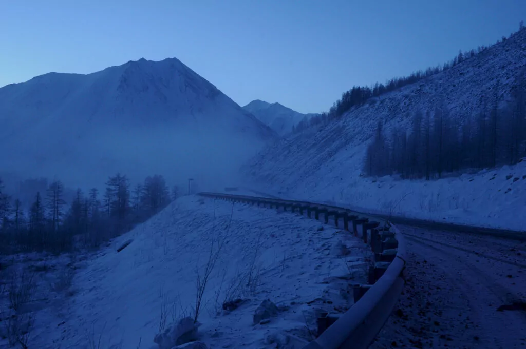 Спустя 10 часов пути в сторону Магадана на горизонте сквозь туман проступают сопки. Дорога идет в гору, воздух с каждым километром становится холоднее. Еще несколько горных перевалов, и покажется Оймяконская долина — одно из самых холодных мест на планете.