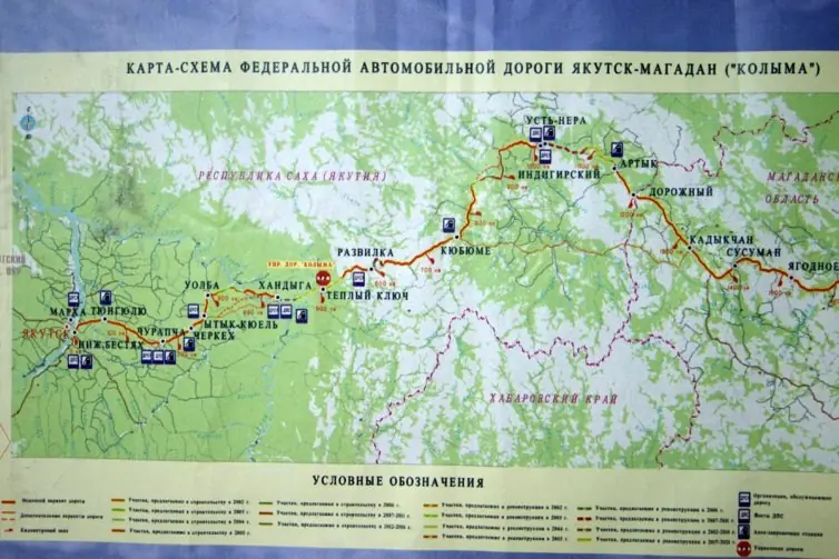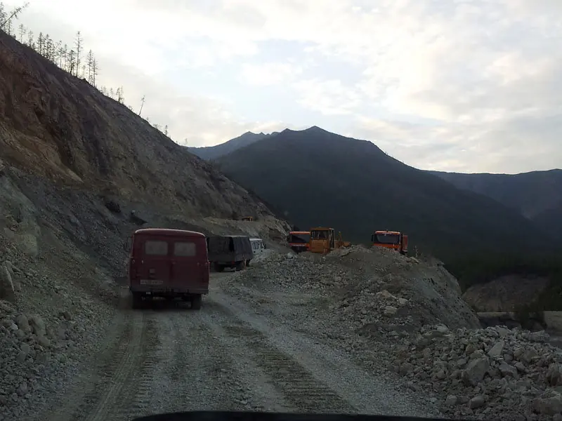 Федеральная трасса «Колыма», которая соединяет Якутск и Магадан, оживает с наступлением морозов, когда встают реки Лена и Алдан: часть маршрута пролегает по льду. Пока лед не встал, переправы приходится преодолевать на пароме. Путь занимает трое, а то и четверо суток. Прежде чем пуститься в дорогу, водители утепляют машины: стелят линолеум на пол, укутывают войлоком двигатель. Чтобы окна не покрывались инеем, устанавливают двойные стекла — из-за них вместо одного знака на обочине виднеются два.
